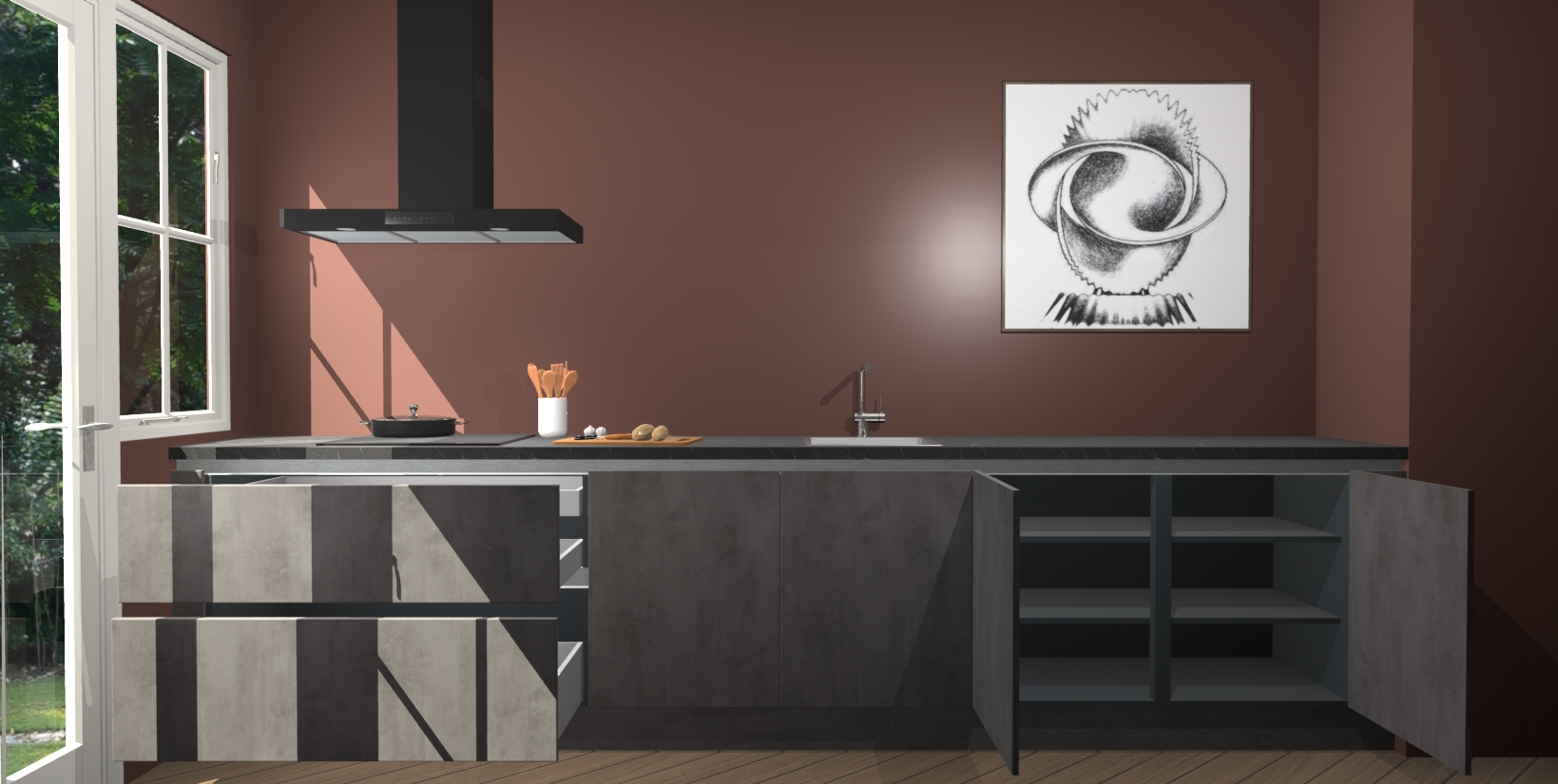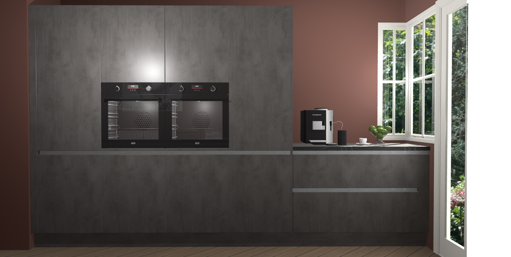 Een stijlvolle en praktische keuken als deze mag gezien worden. Dankzij de prachtige beton antraciet matte afwerking wordt de keuken gemakkelijk het middelpunt van uw huis - hij ziet er geweldig uit onder allerlei lichtomstandigheden, van dag tot nacht!