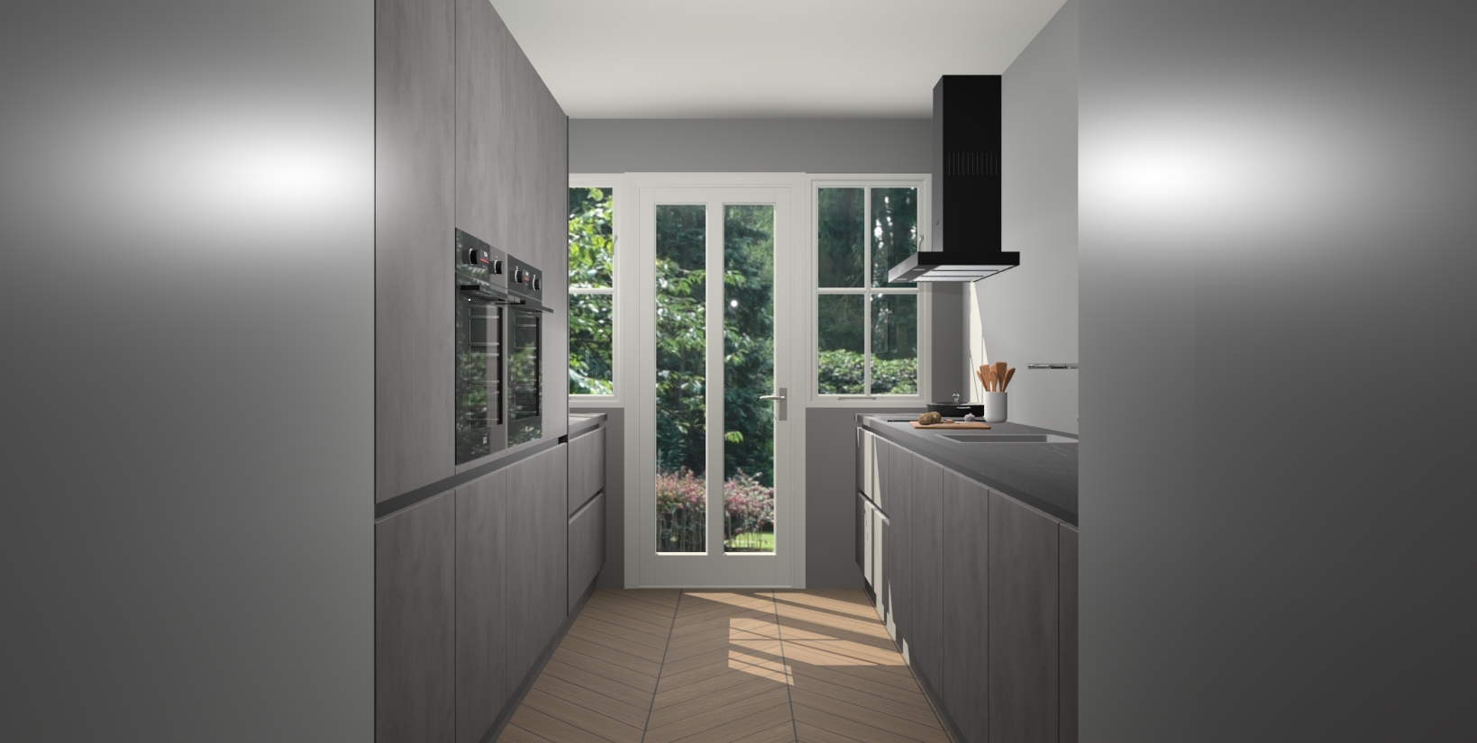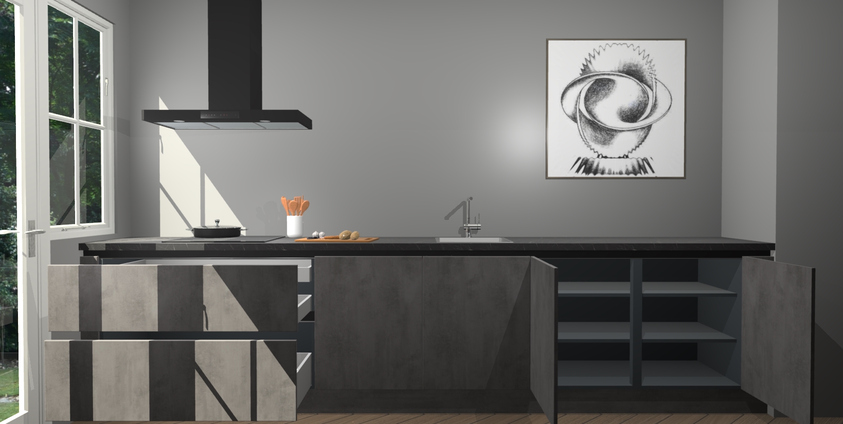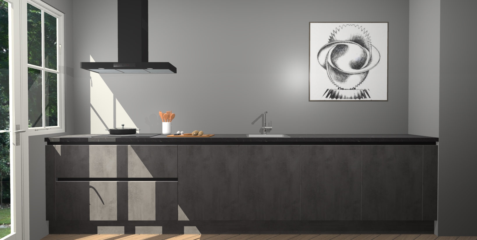 Een stijlvolle en praktische keuken als deze mag gezien worden. Dankzij de prachtige beton antraciet matte afwerking wordt de keuken gemakkelijk het middelpunt van uw huis - hij ziet er geweldig uit onder allerlei lichtomstandigheden, van dag tot nacht!
