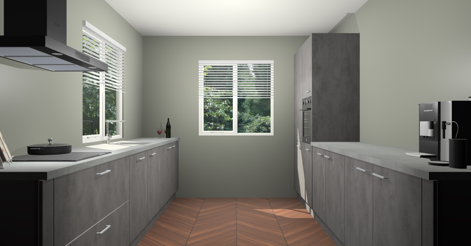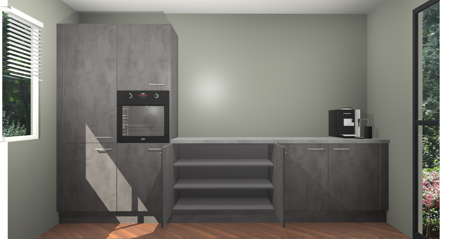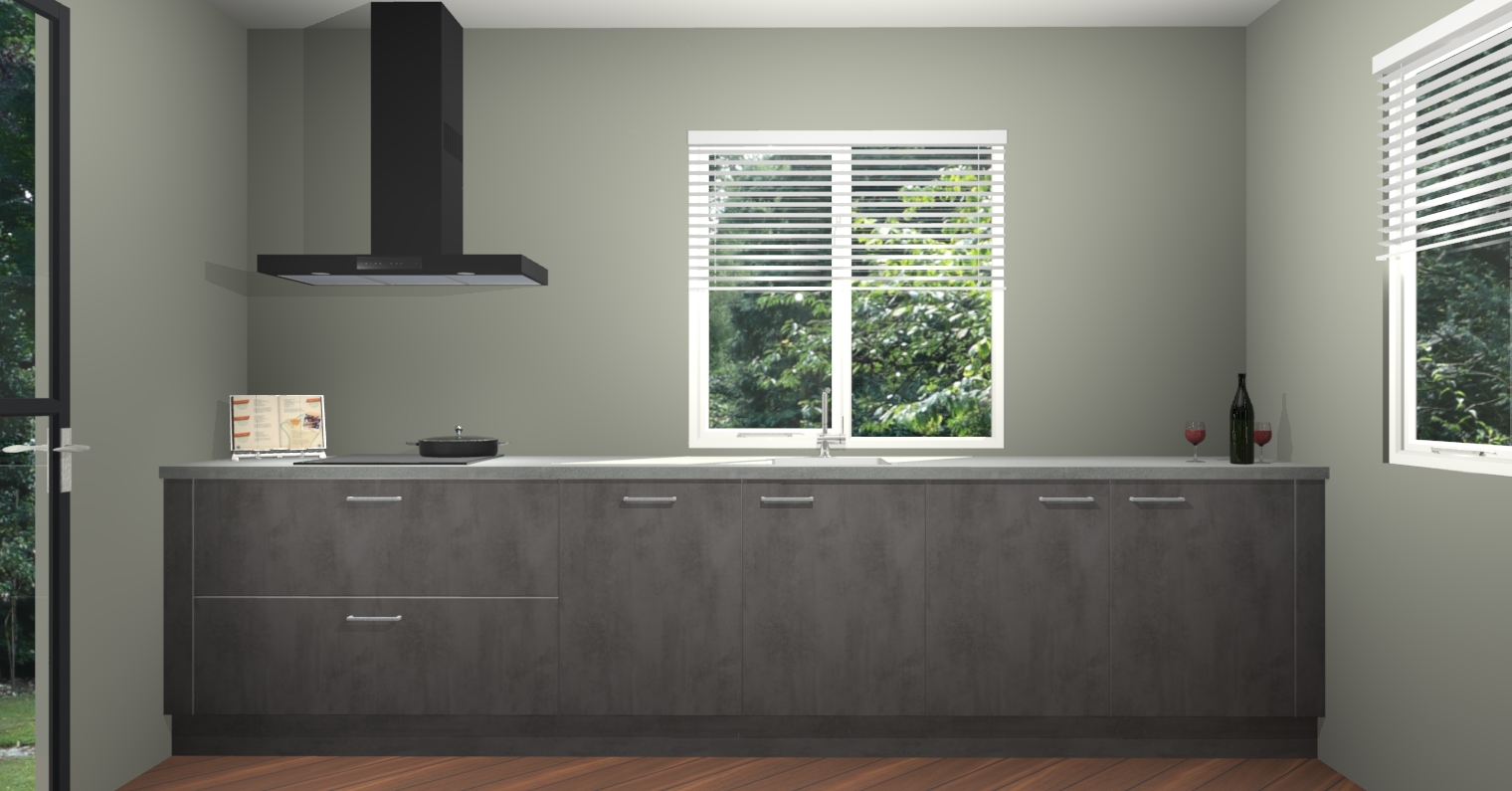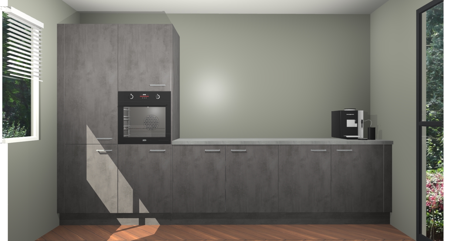 Welkom bij de Beton Antraciet keuken Lusaka. Deze prachtige keuken zal de komende jaren het middelpunt van de belangstelling in uw huis zijn. Uitgerust met vijf inbouwapparaten komt u nooit kookgereedschap tekort. Bovendien geeft de warme houtlook elke ruimte een uitnodigende en tijdloze uitstraling.