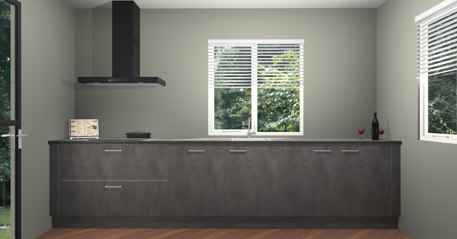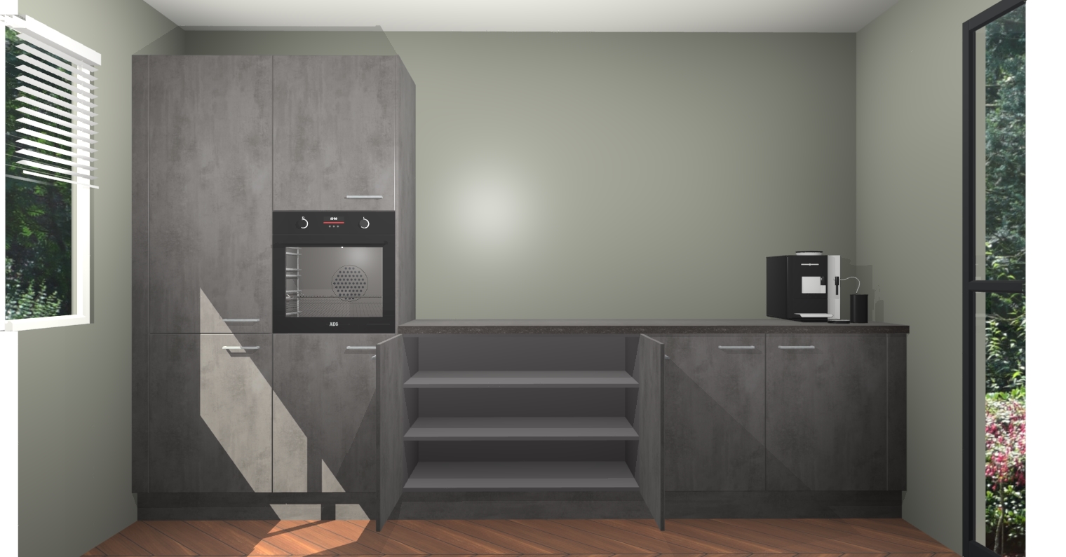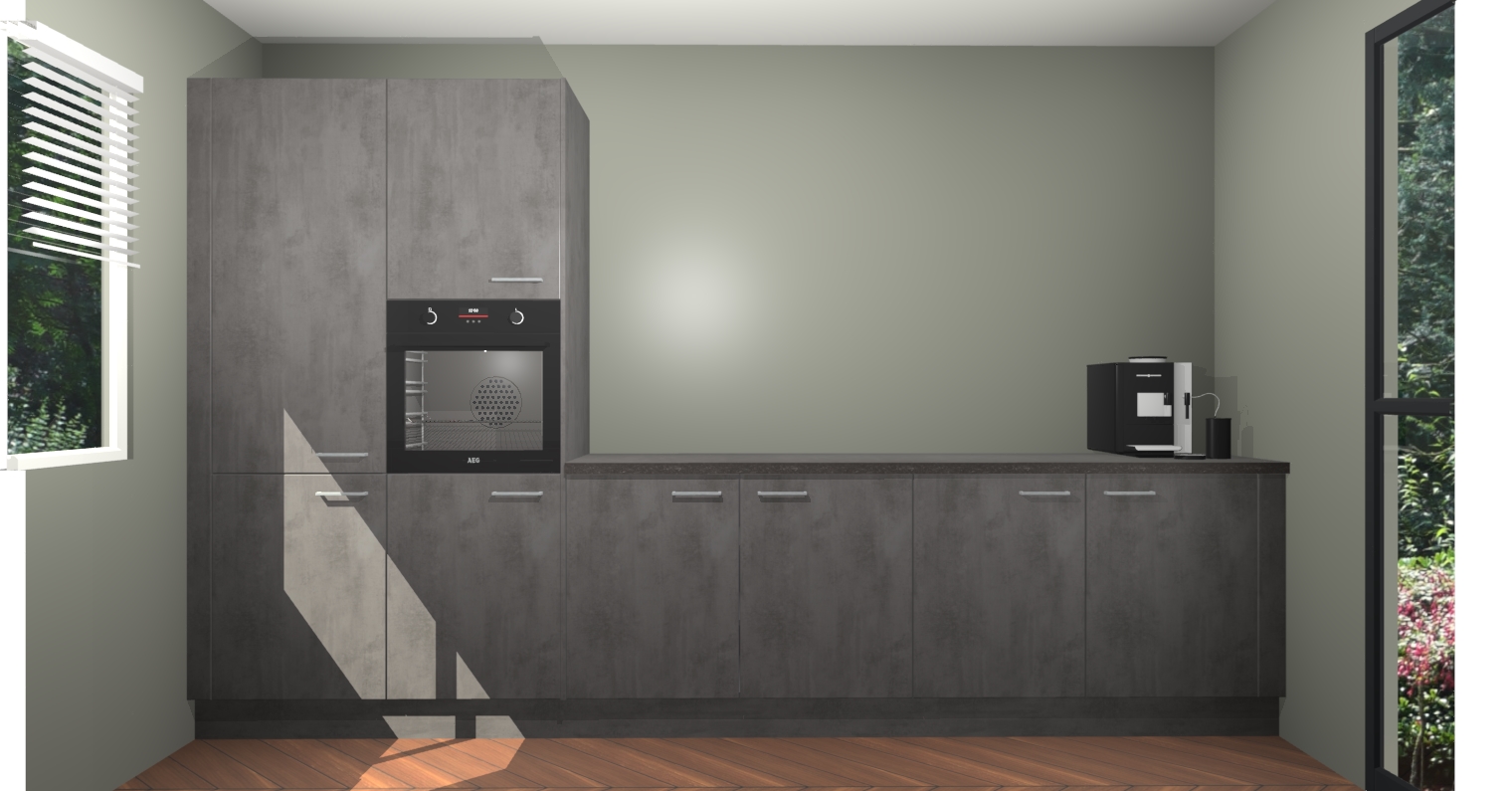 Welkom bij de Beton Antraciet keuken Lusaka. Deze prachtige keuken zal de komende jaren het middelpunt van de belangstelling in uw huis zijn. Uitgerust met vijf inbouwapparaten komt u nooit kookgereedschap tekort. Bovendien geeft de warme houtlook elke ruimte een uitnodigende en tijdloze uitstraling.