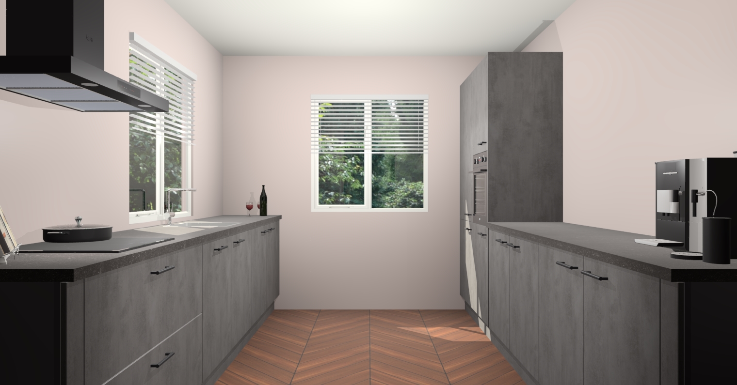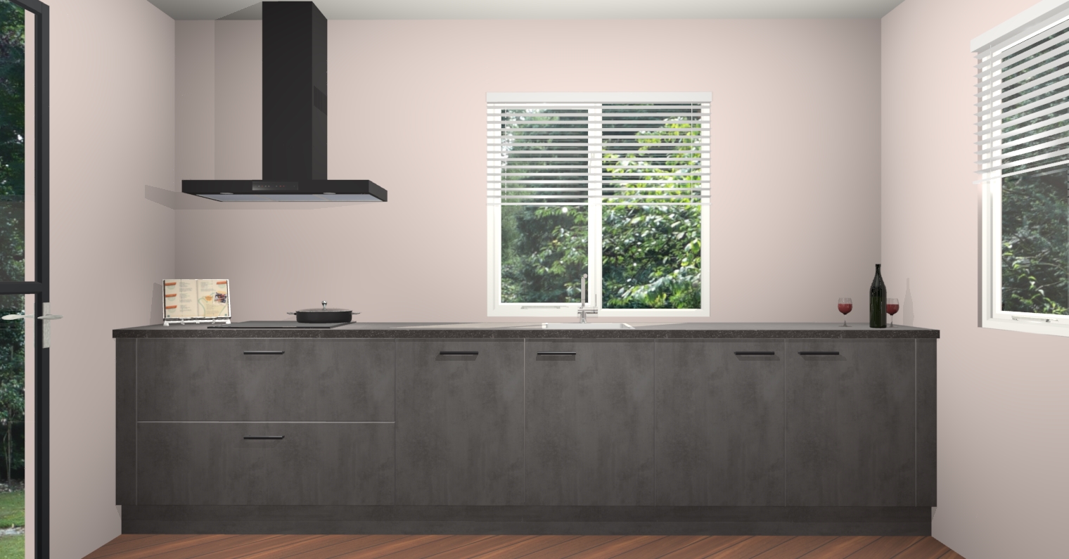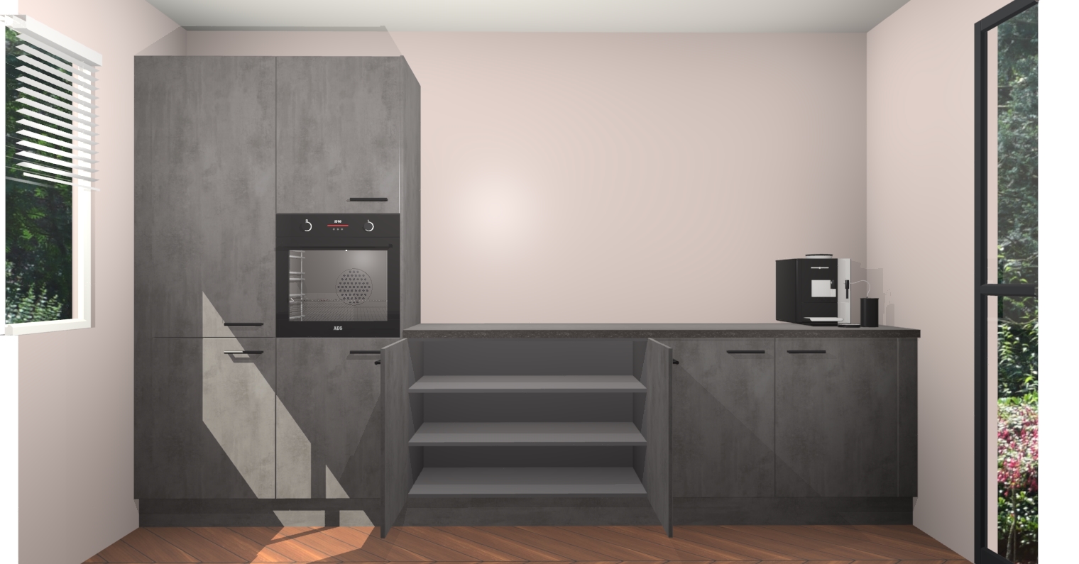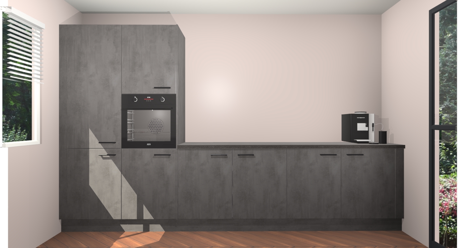 Welkom bij de Beton Antraciet keuken Lusaka. Deze prachtige keuken zal de komende jaren het middelpunt van de belangstelling in uw huis zijn. Uitgerust met vijf inbouwapparaten komt u nooit kookgereedschap tekort. Bovendien geeft de warme houtlook elke ruimte een uitnodigende en tijdloze uitstraling.