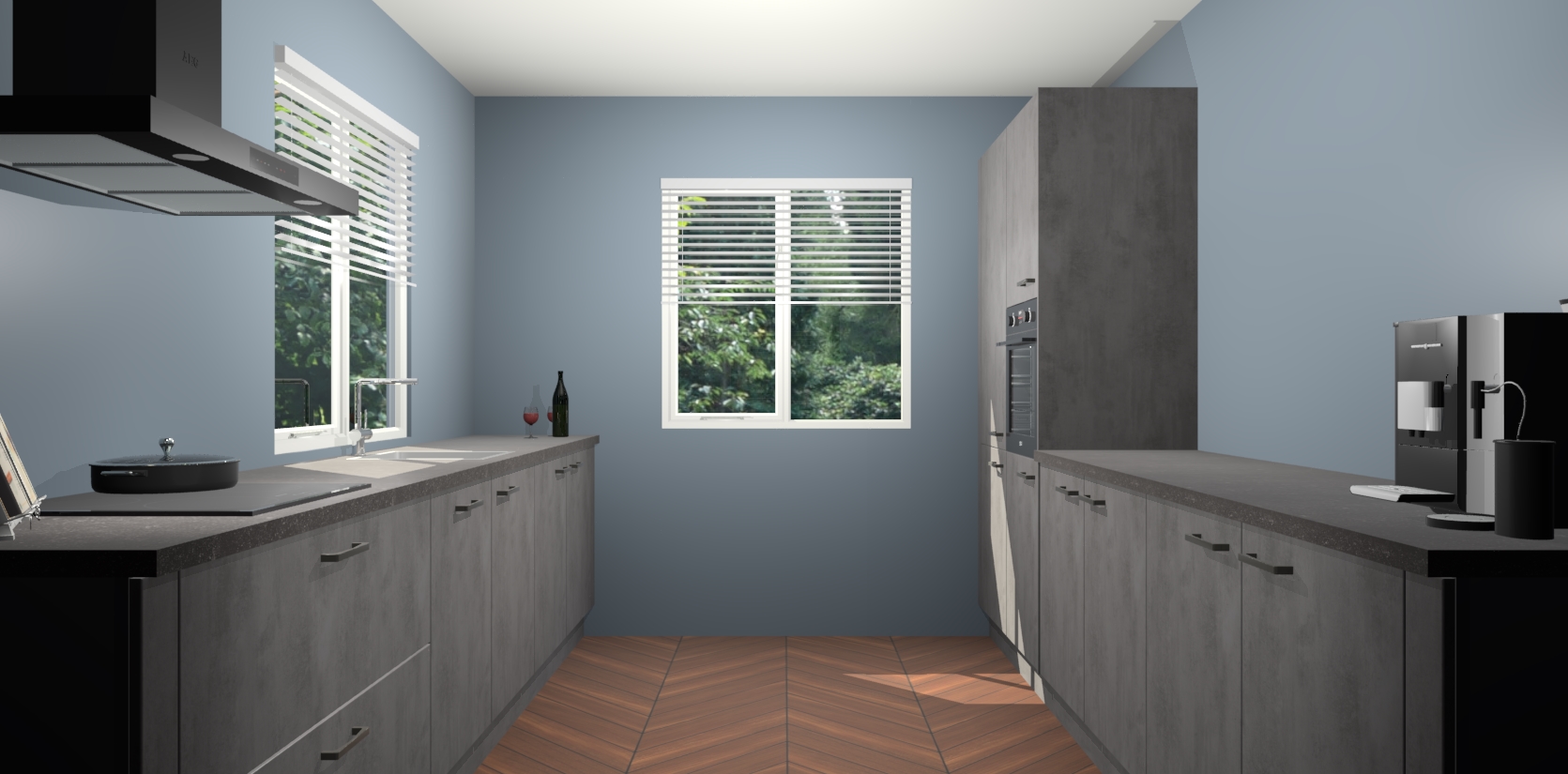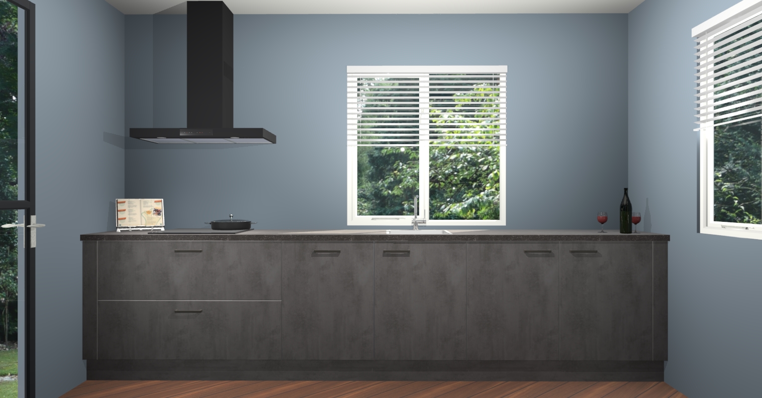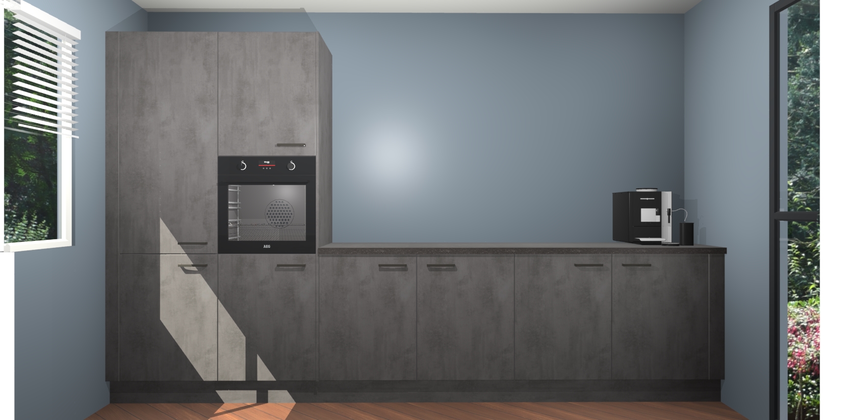 Welkom bij de Beton Antraciet keuken Lusaka. Deze prachtige keuken zal de komende jaren het middelpunt van de belangstelling in uw huis zijn. Uitgerust met vijf inbouwapparaten komt u nooit kookgereedschap tekort. Bovendien geeft de warme houtlook elke ruimte een uitnodigende en tijdloze uitstraling.
