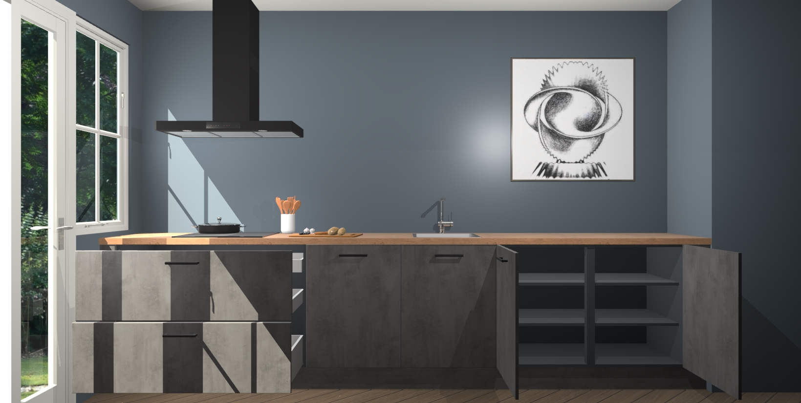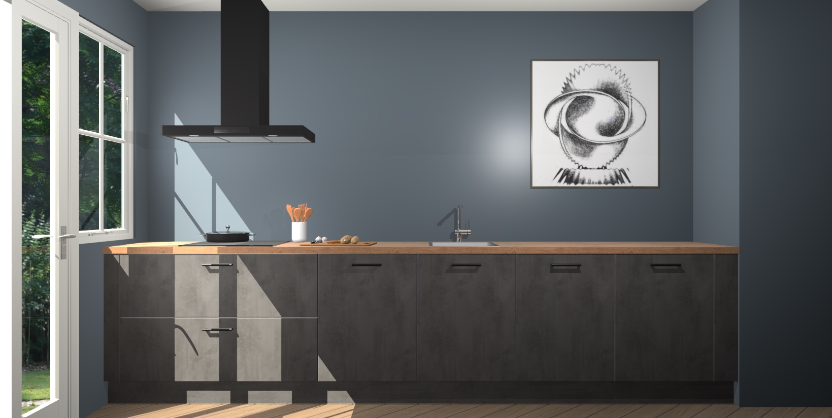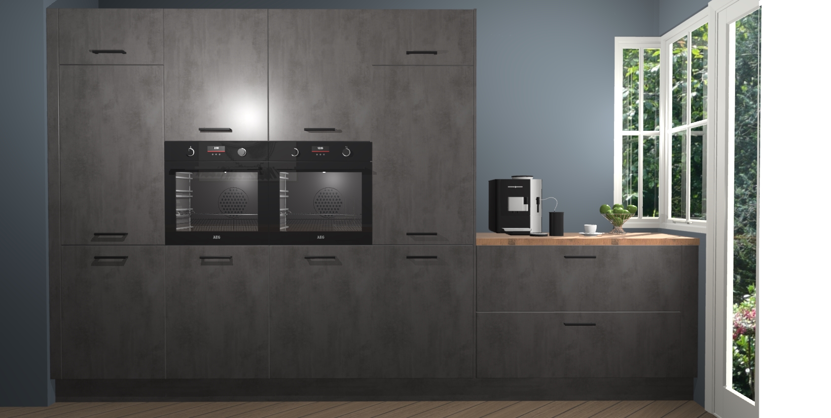Een stijlvolle en praktische keuken als deze mag gezien worden. Dankzij de prachtige beton antraciet matte afwerking wordt de keuken gemakkelijk het middelpunt van uw huis - hij ziet er geweldig uit onder allerlei lichtomstandigheden, van dag tot nacht!