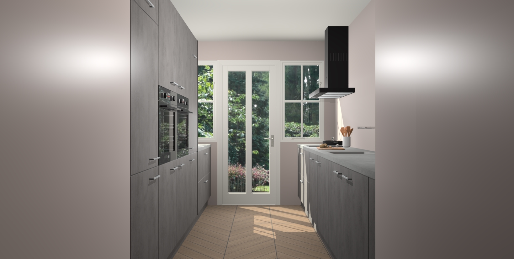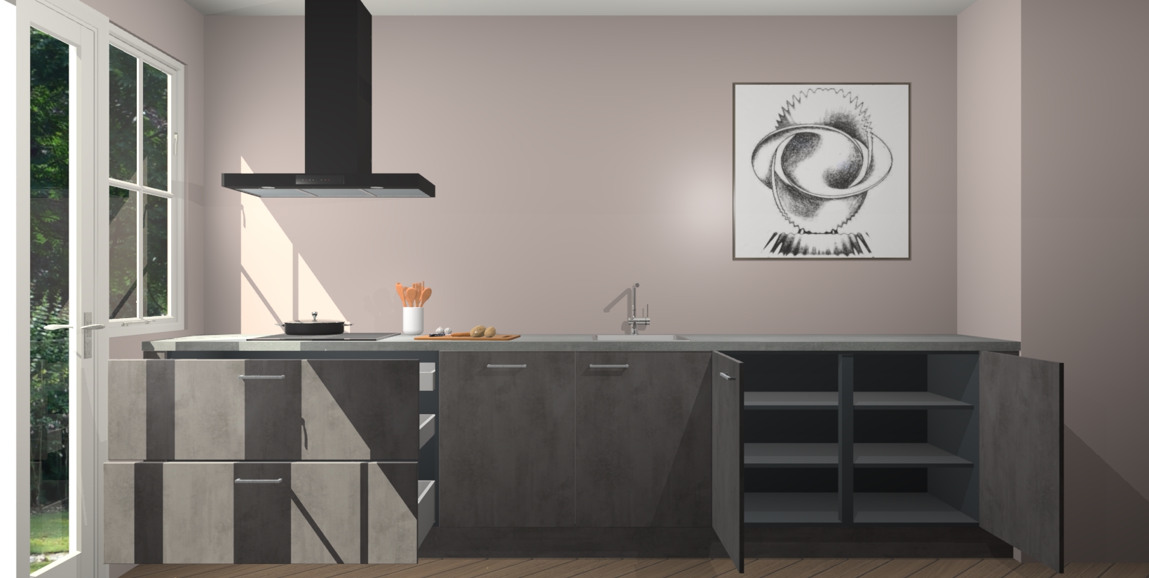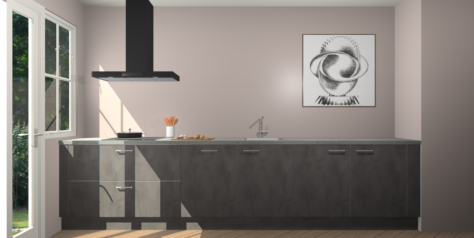 Een stijlvolle en praktische keuken als deze mag gezien worden. Dankzij de prachtige beton antraciet matte afwerking wordt de keuken gemakkelijk het middelpunt van uw huis - hij ziet er geweldig uit onder allerlei lichtomstandigheden, van dag tot nacht!