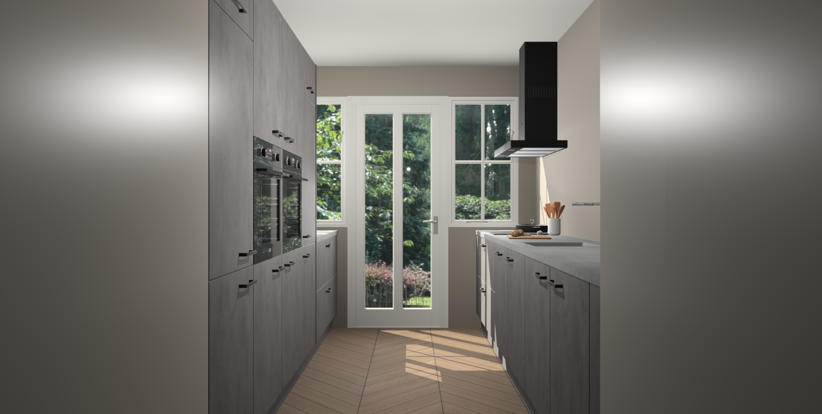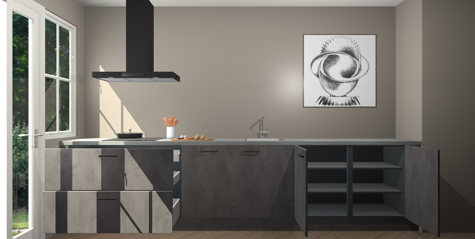 Een stijlvolle en praktische keuken als deze mag gezien worden. Dankzij de prachtige beton antraciet matte afwerking wordt de keuken gemakkelijk het middelpunt van uw huis - hij ziet er geweldig uit onder allerlei lichtomstandigheden, van dag tot nacht!