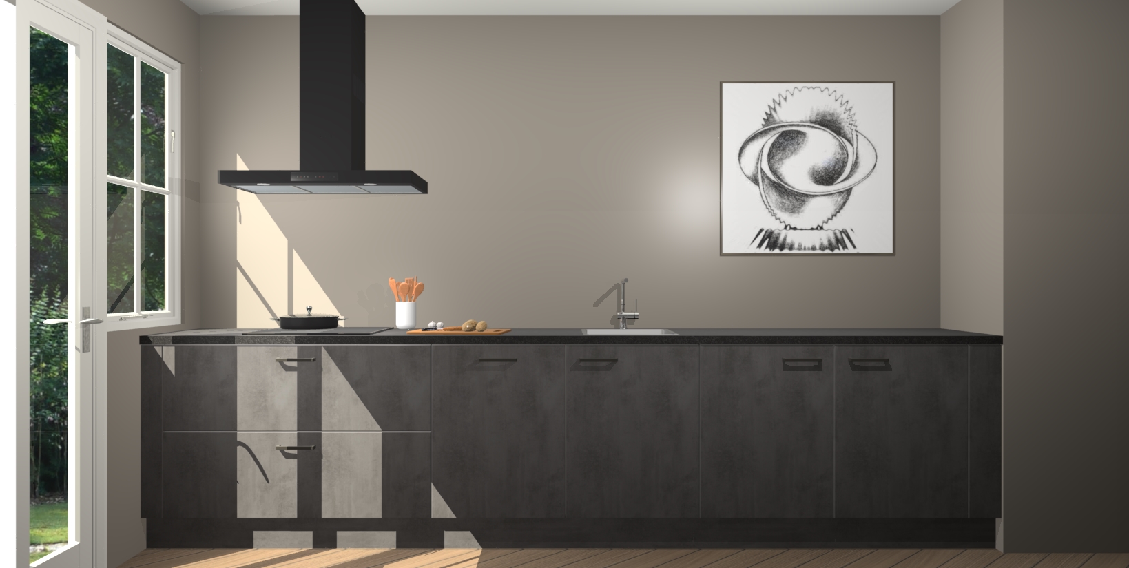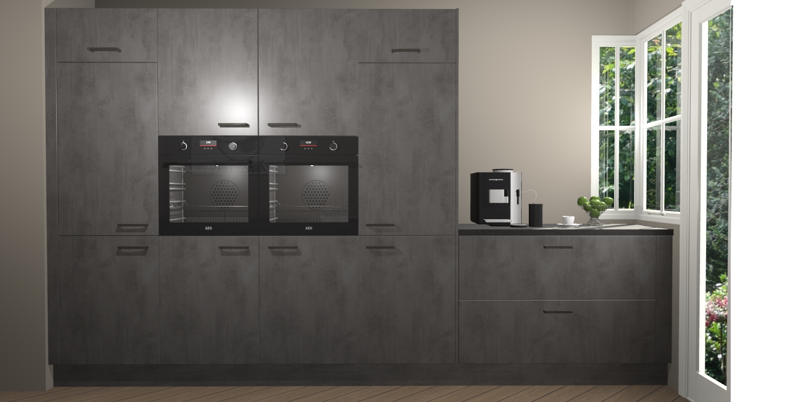 Een stijlvolle en praktische keuken als deze mag gezien worden. Dankzij de prachtige beton antraciet matte afwerking wordt de keuken gemakkelijk het middelpunt van uw huis - hij ziet er geweldig uit onder allerlei lichtomstandigheden, van dag tot nacht!