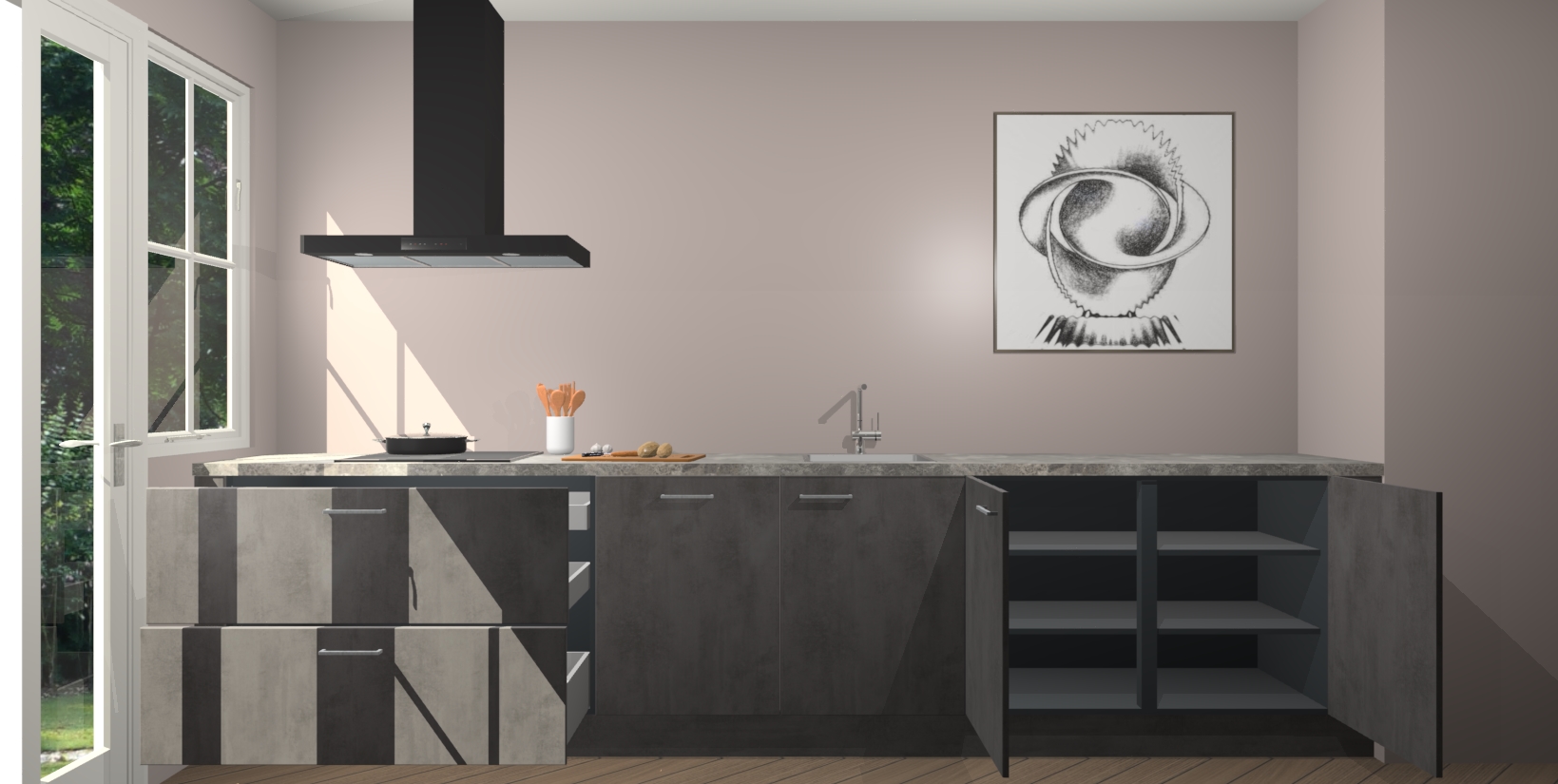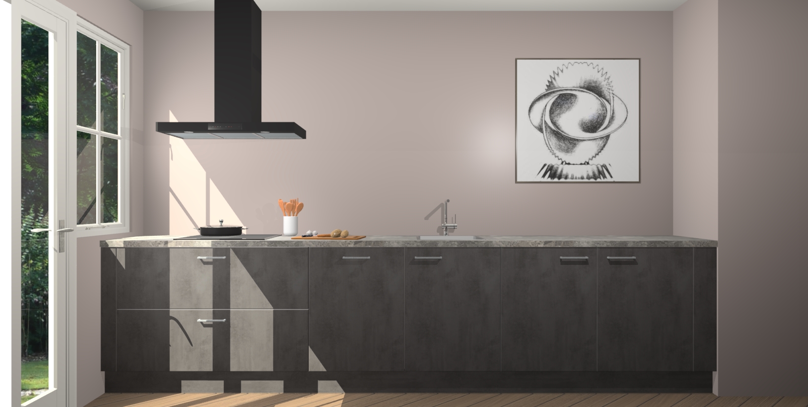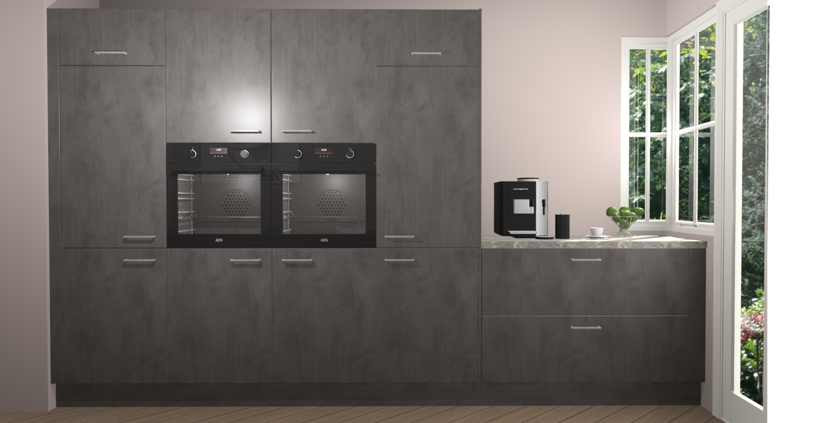 Een stijlvolle en praktische keuken als deze mag gezien worden. Dankzij de prachtige beton antraciet matte afwerking wordt de keuken gemakkelijk het middelpunt van uw huis - hij ziet er geweldig uit onder allerlei lichtomstandigheden, van dag tot nacht!