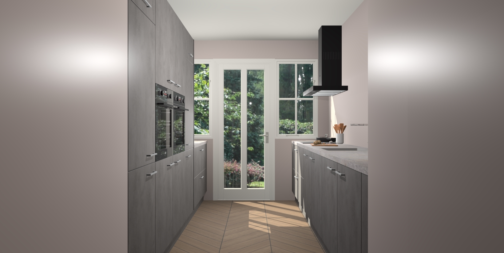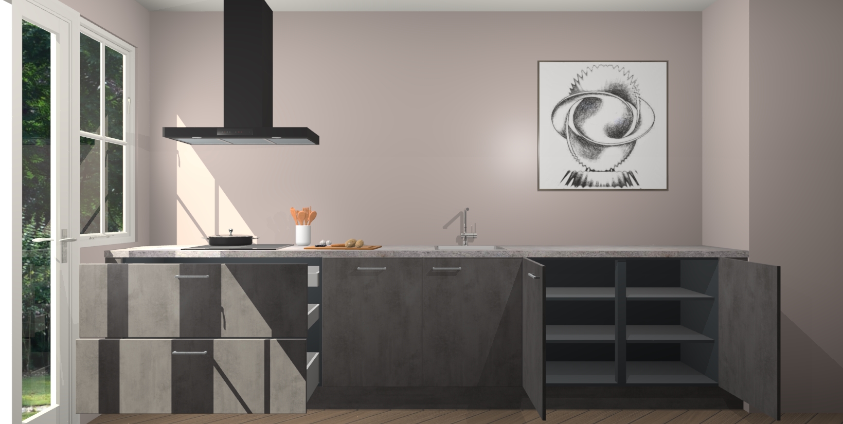 Een stijlvolle en praktische keuken als deze mag gezien worden. Dankzij de prachtige beton antraciet matte afwerking wordt de keuken gemakkelijk het middelpunt van uw huis - hij ziet er geweldig uit onder allerlei lichtomstandigheden, van dag tot nacht!