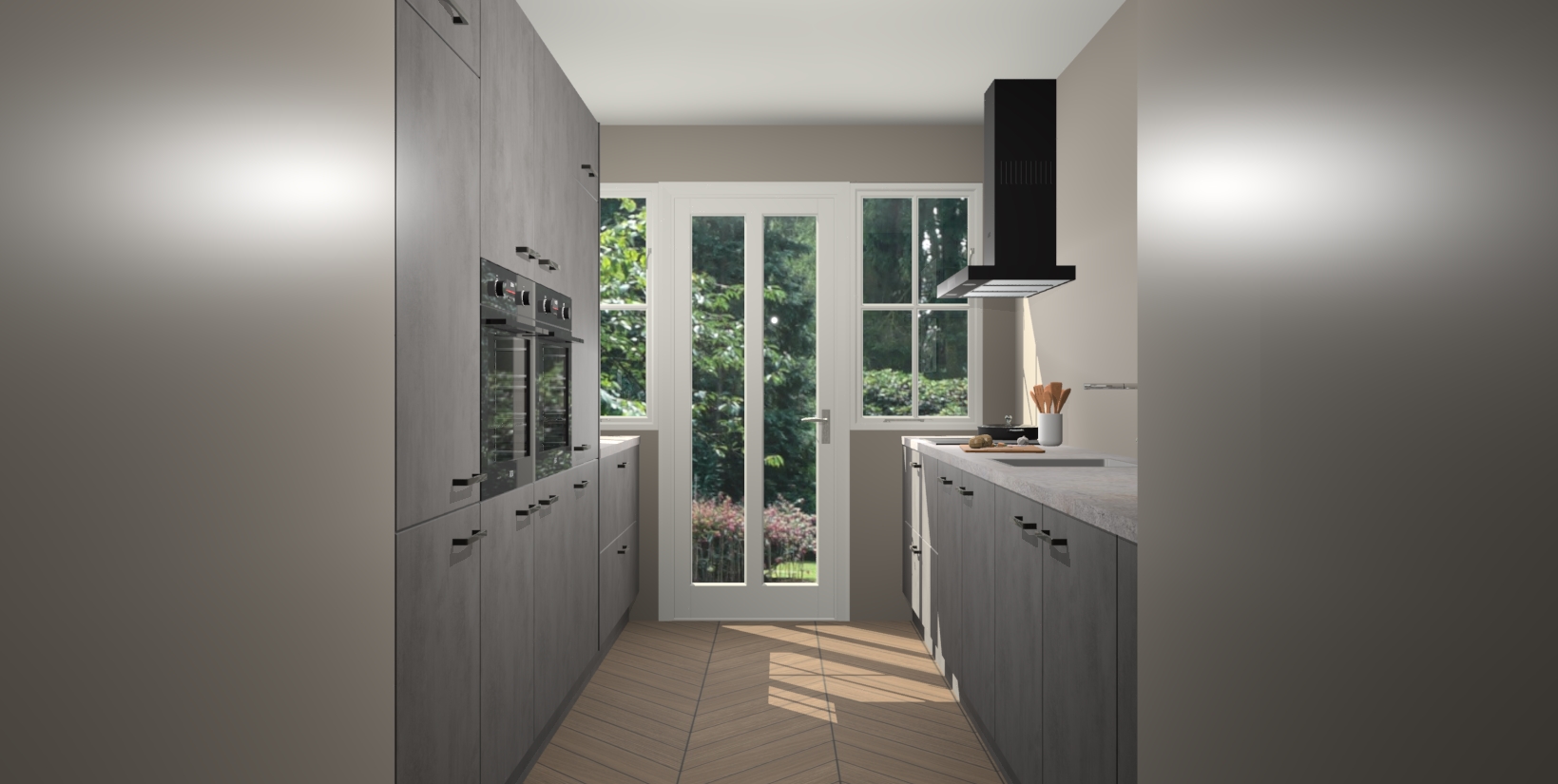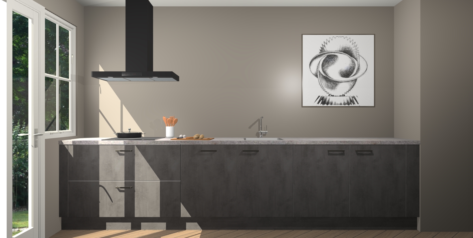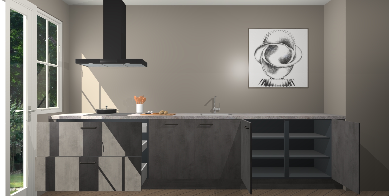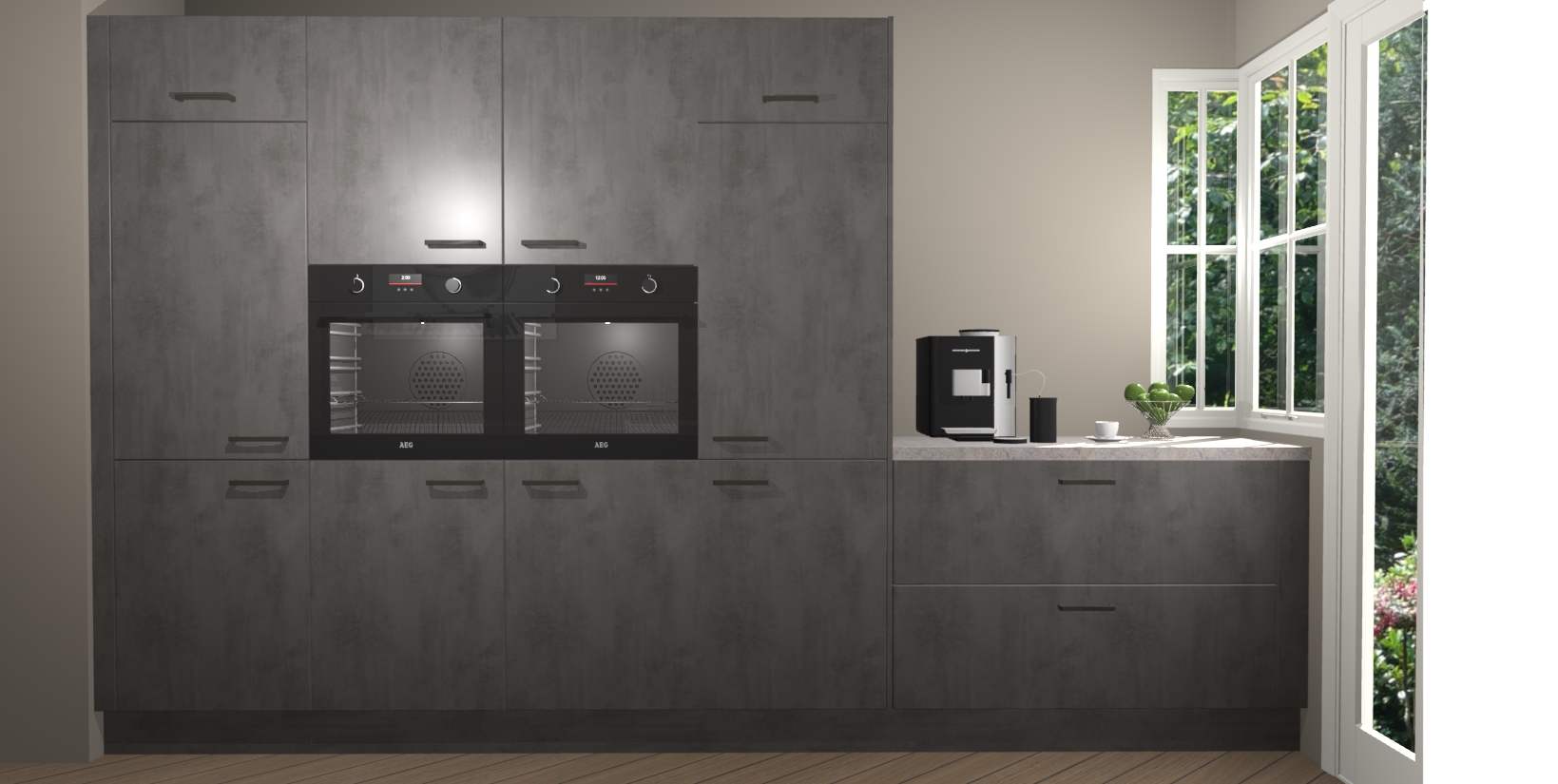 Een stijlvolle en praktische keuken als deze mag gezien worden. Dankzij de prachtige beton antraciet matte afwerking wordt de keuken gemakkelijk het middelpunt van uw huis - hij ziet er geweldig uit onder allerlei lichtomstandigheden, van dag tot nacht!