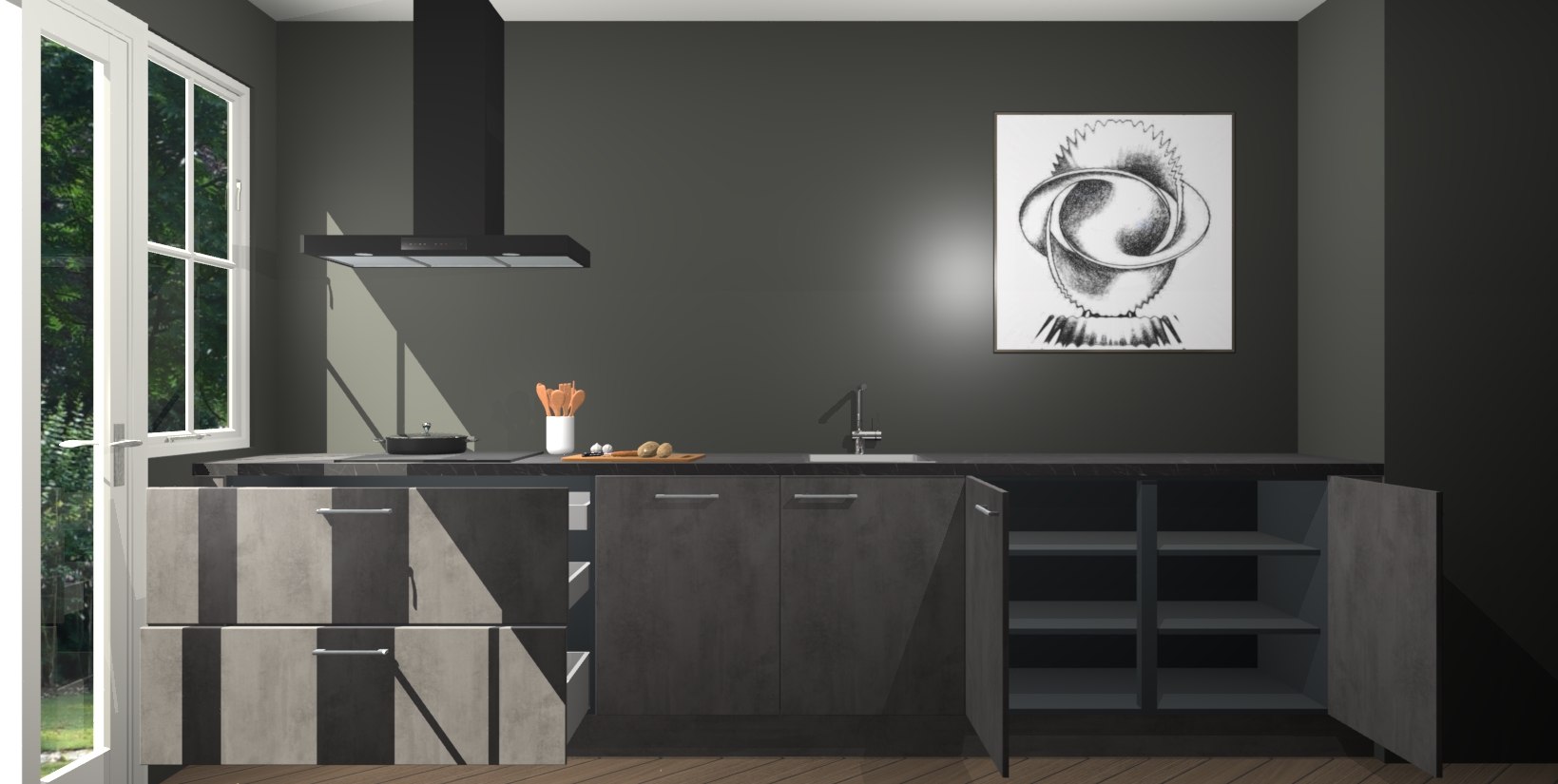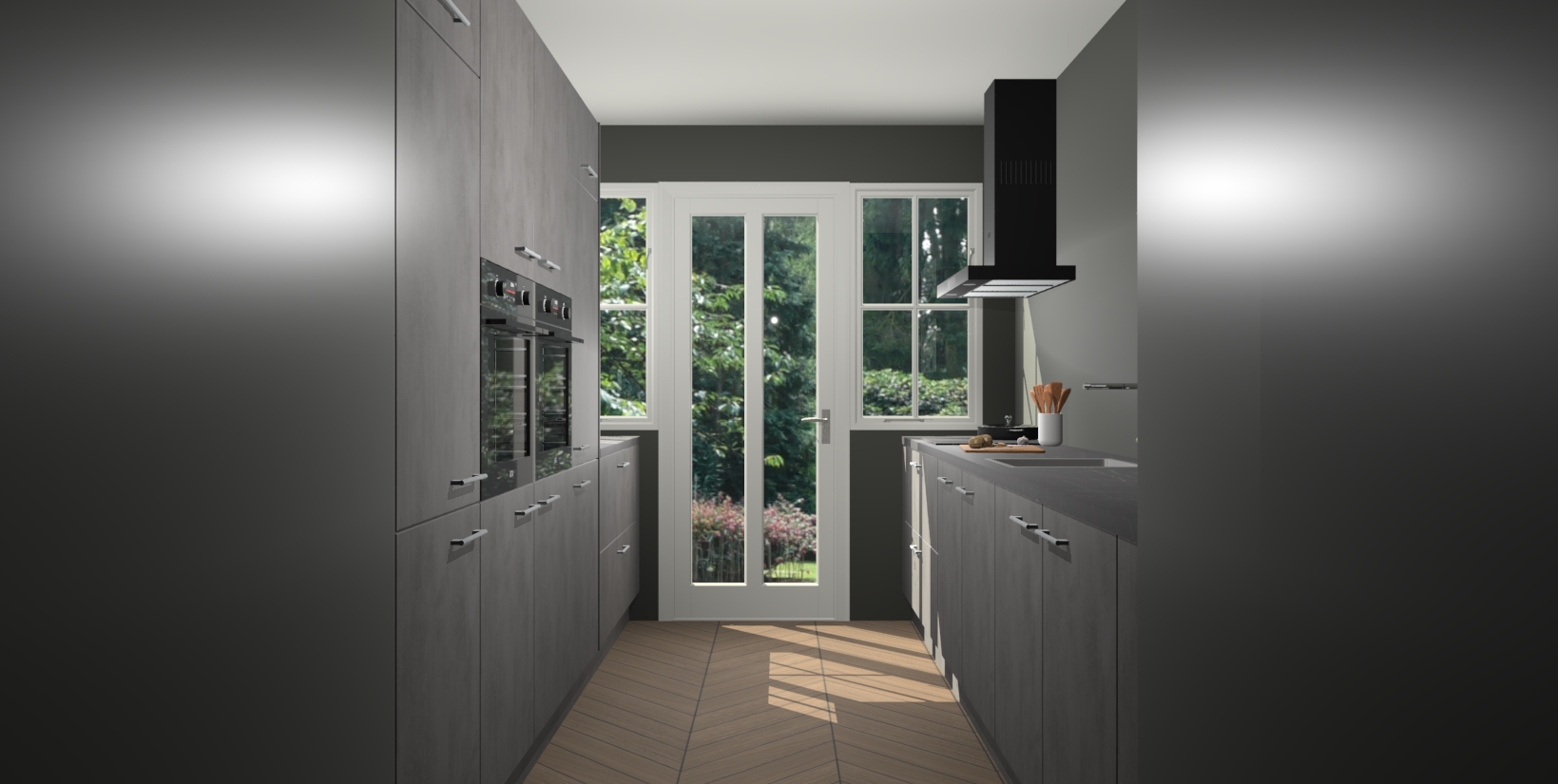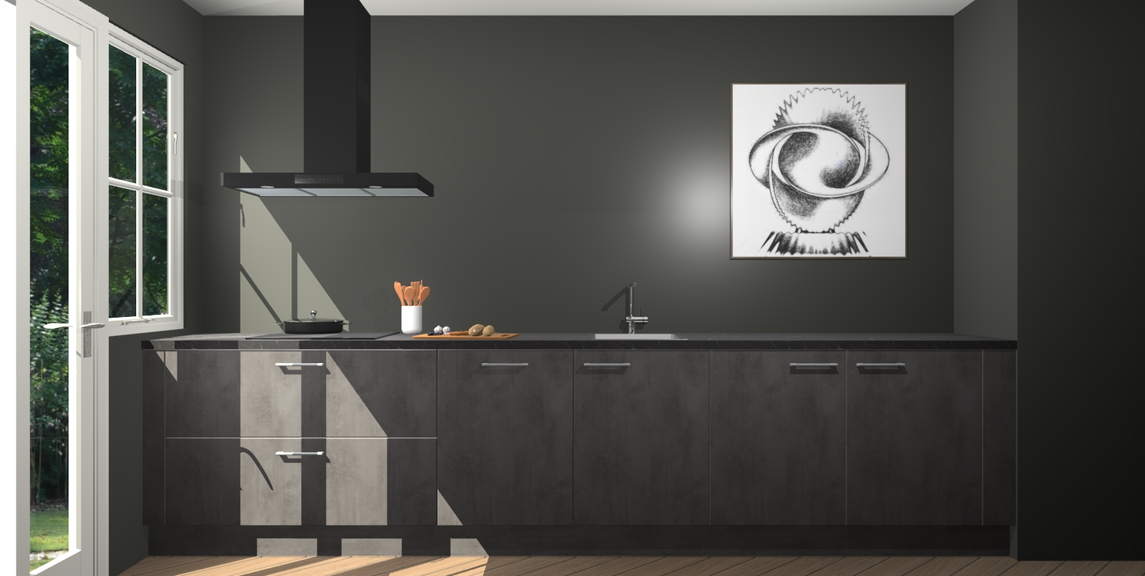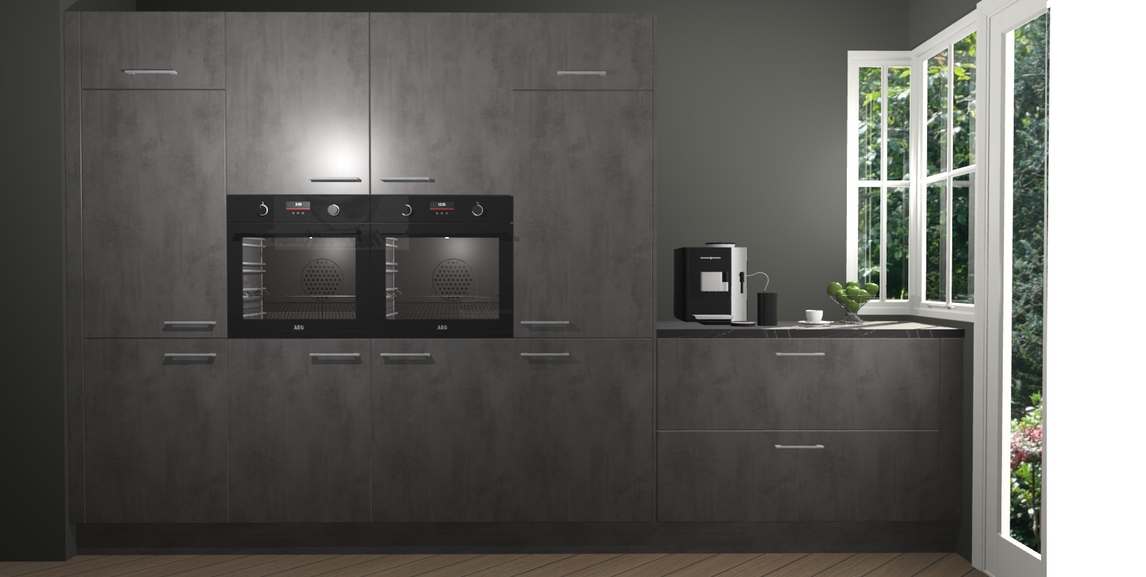 Een stijlvolle en praktische keuken als deze mag gezien worden. Dankzij de prachtige beton antraciet matte afwerking wordt de keuken gemakkelijk het middelpunt van uw huis - hij ziet er geweldig uit onder allerlei lichtomstandigheden, van dag tot nacht!