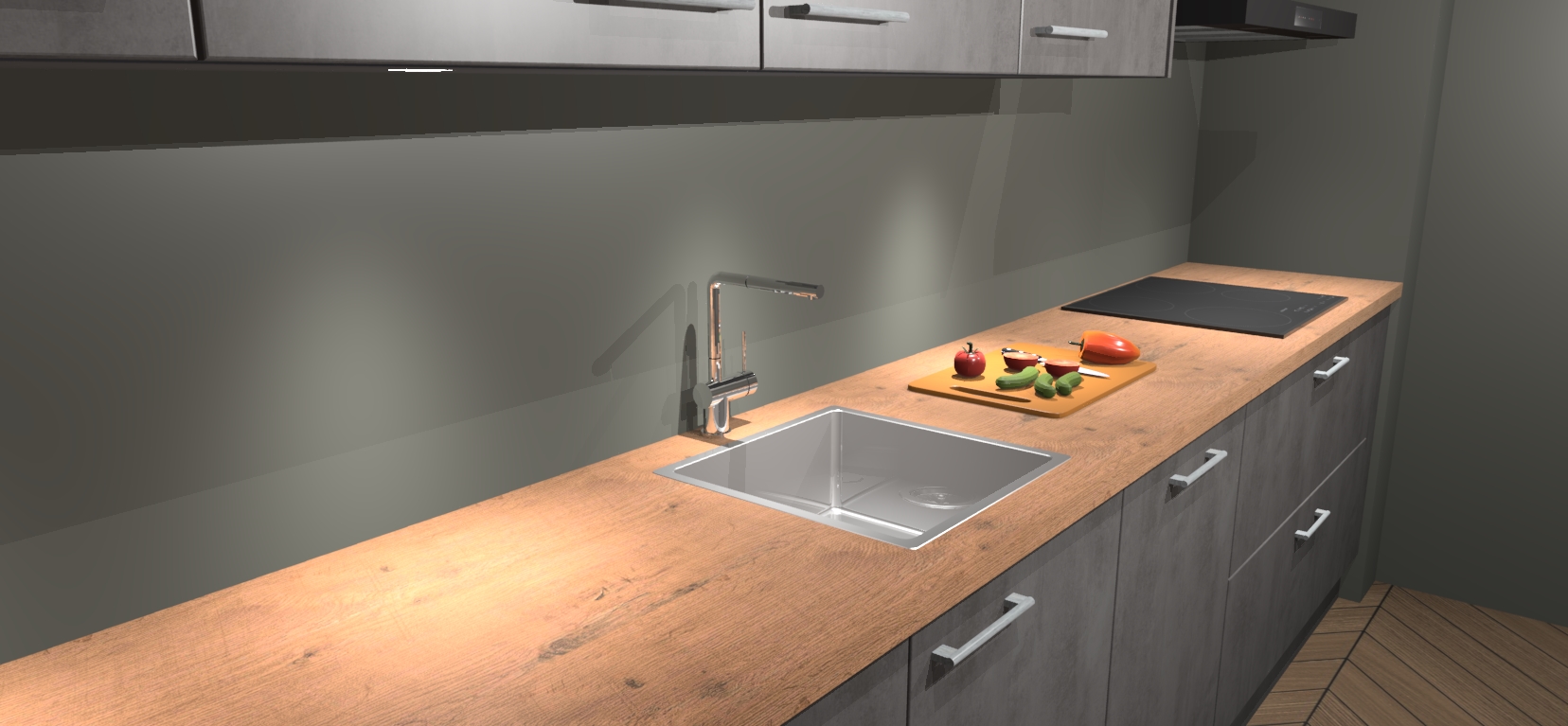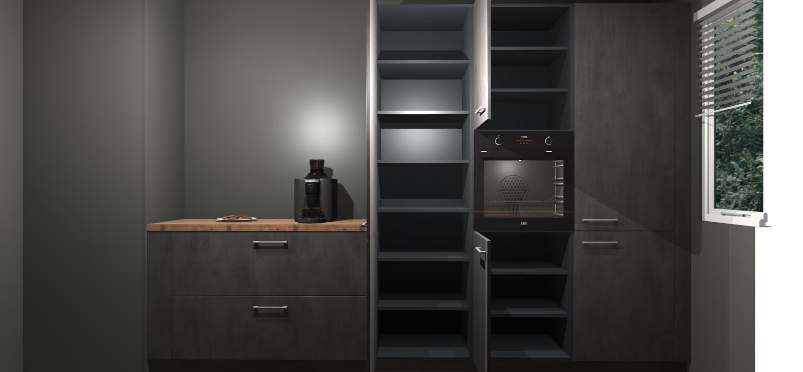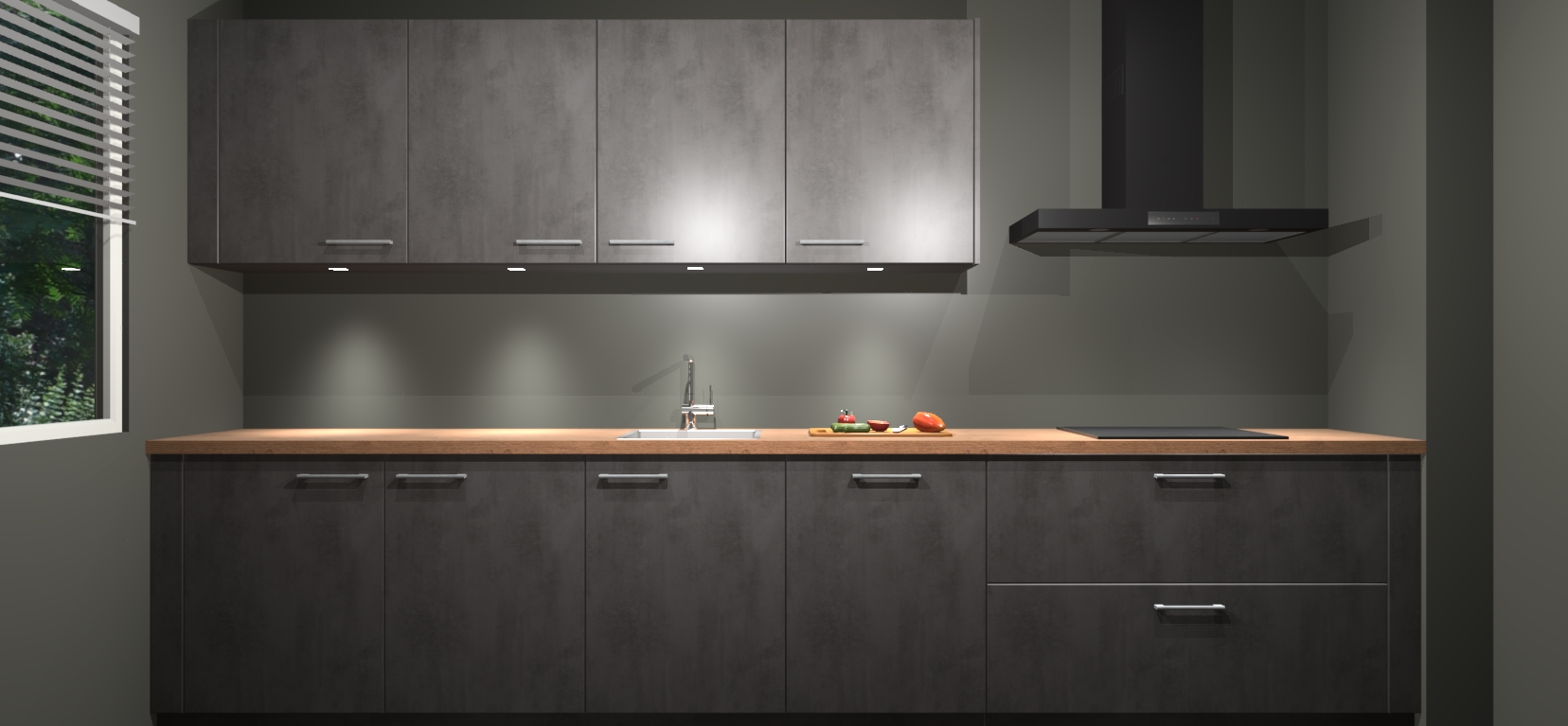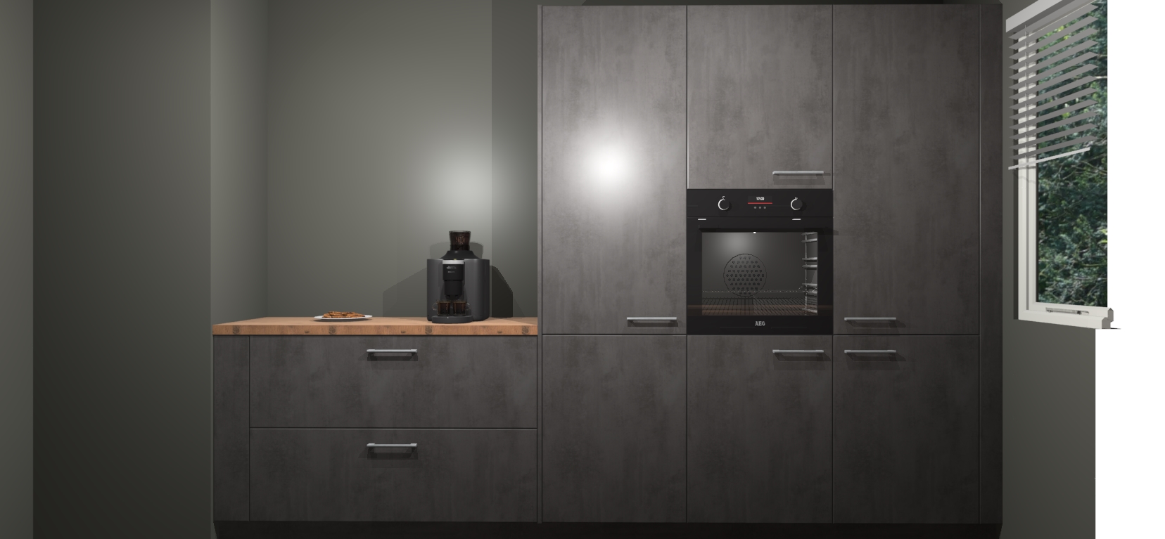 Een stijlvolle en praktische keuken als deze mag gezien worden. Dankzij de prachtige Beton Antraciet matte afwerking wordt de keuken gemakkelijk het middelpunt van uw huis - hij ziet er geweldig uit onder allerlei lichtomstandigheden, van dag tot nacht!