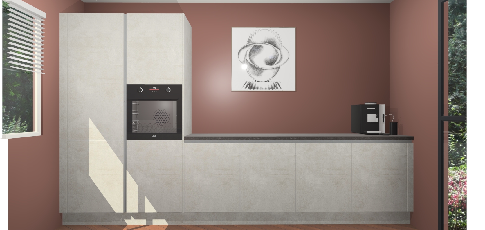Welkom bij de Beton Opaal greeploze keuken Lusaka. Deze prachtige keuken zal de komende jaren het middelpunt van de belangstelling in uw huis zijn. Uitgerust met vijf inbouwapparaten komt u nooit kookgereedschap tekort. Bovendien geeft de warme houtlook elke ruimte een uitnodigende en tijdloze uitstraling.