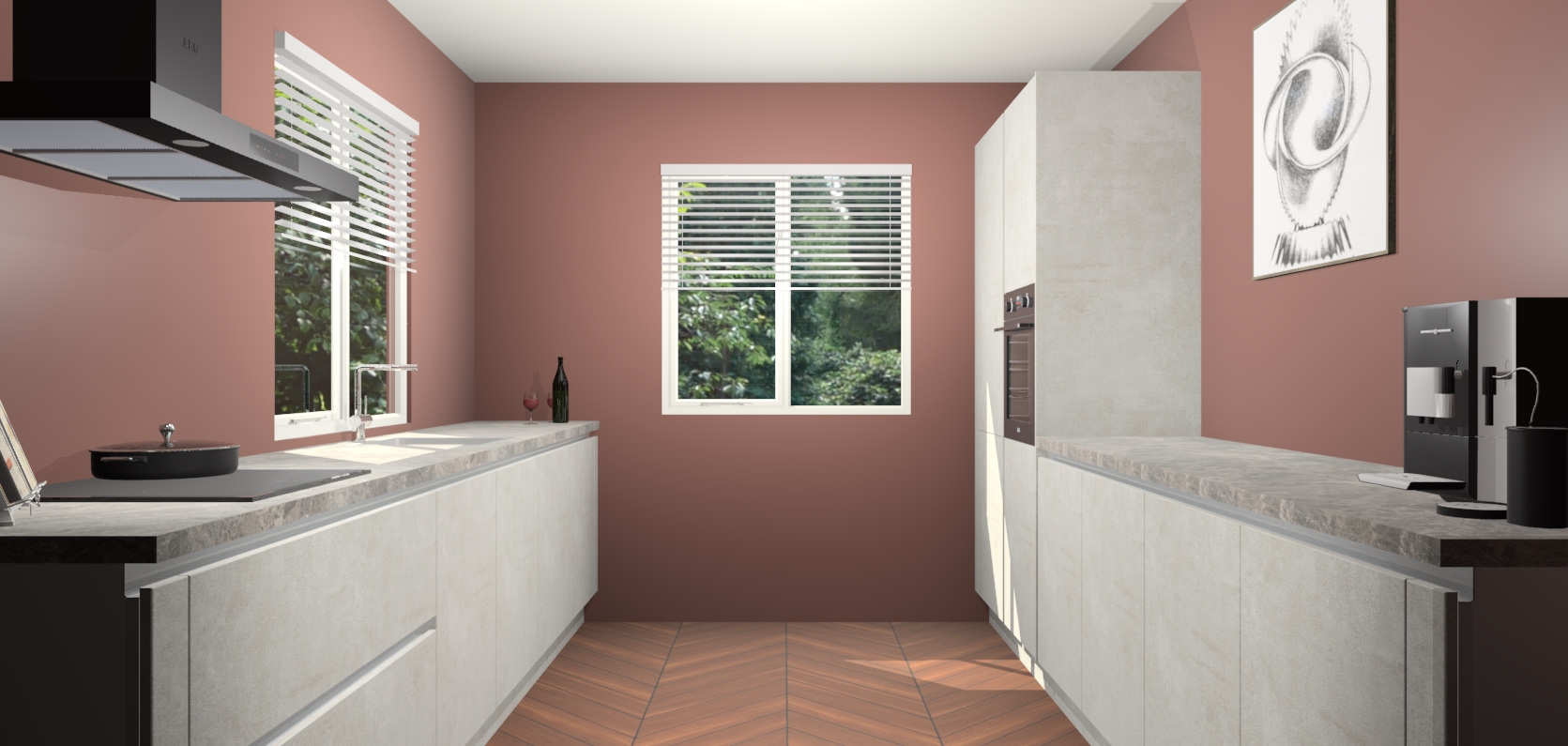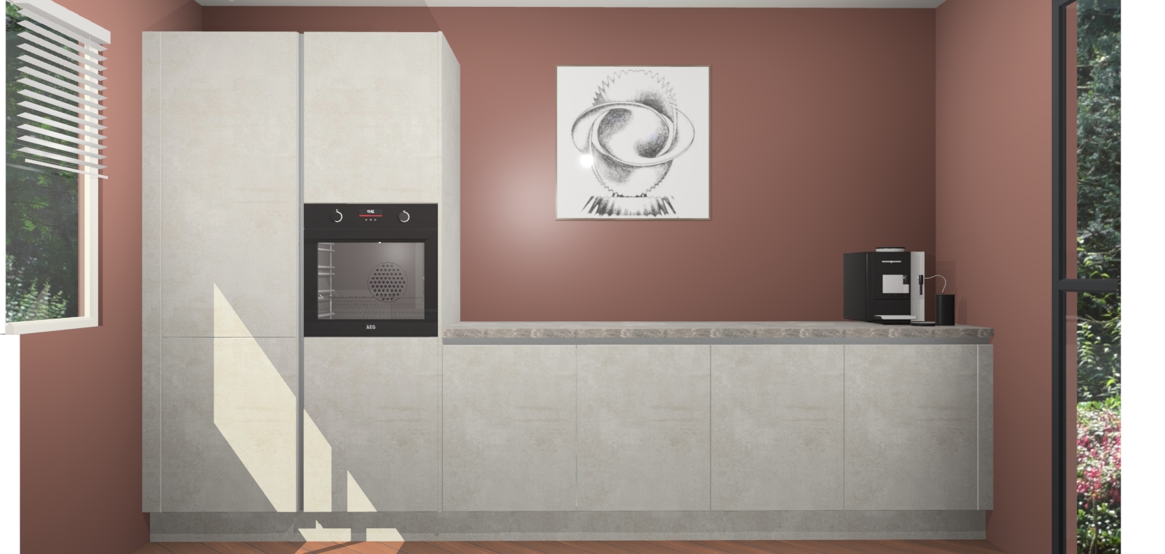 Welkom bij de Beton Opaal greeploze keuken Lusaka. Deze prachtige keuken zal de komende jaren het middelpunt van de belangstelling in uw huis zijn. Uitgerust met vijf inbouwapparaten komt u nooit kookgereedschap tekort. Bovendien geeft de warme houtlook elke ruimte een uitnodigende en tijdloze uitstraling.