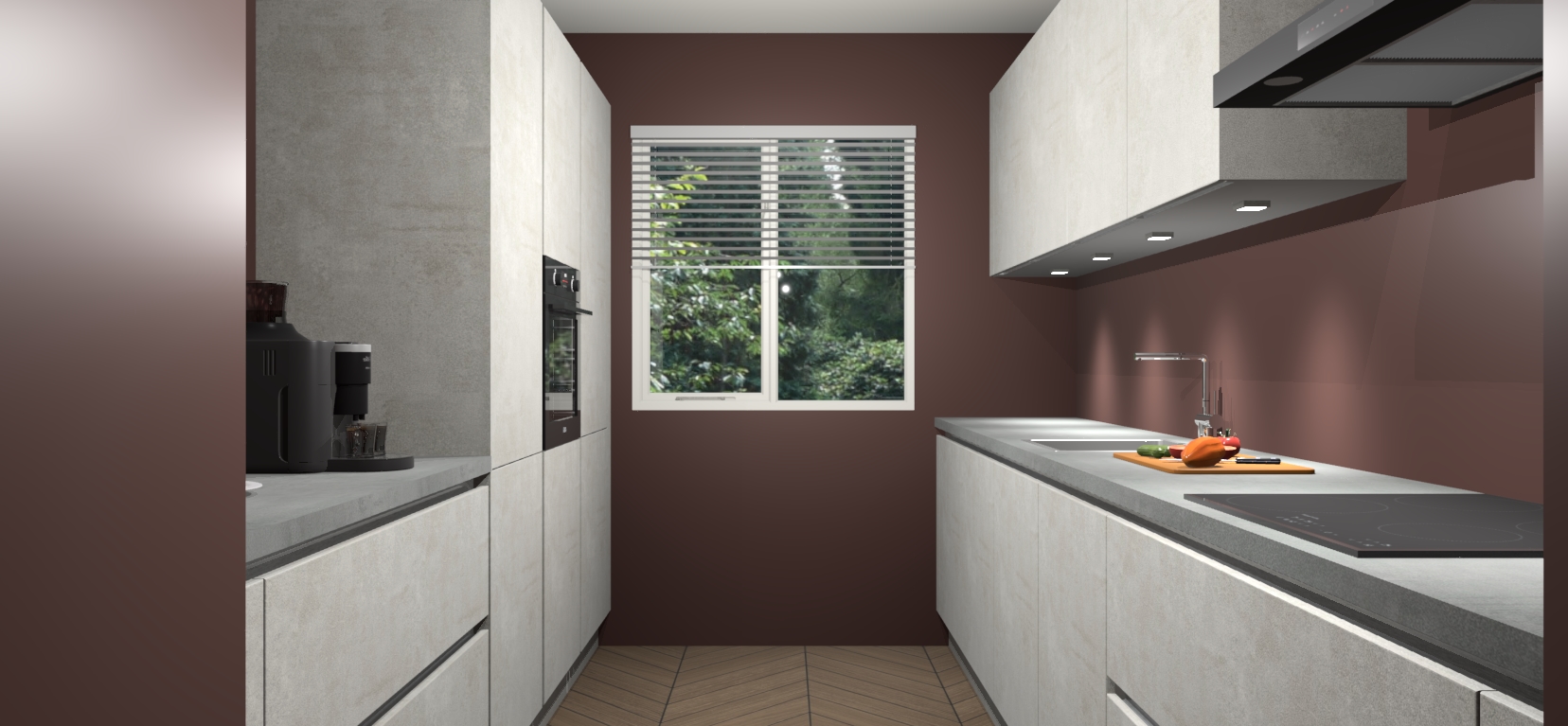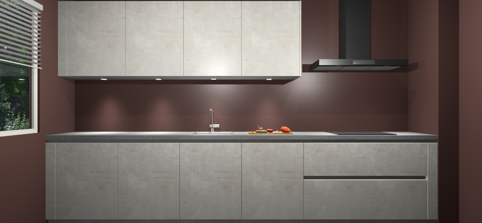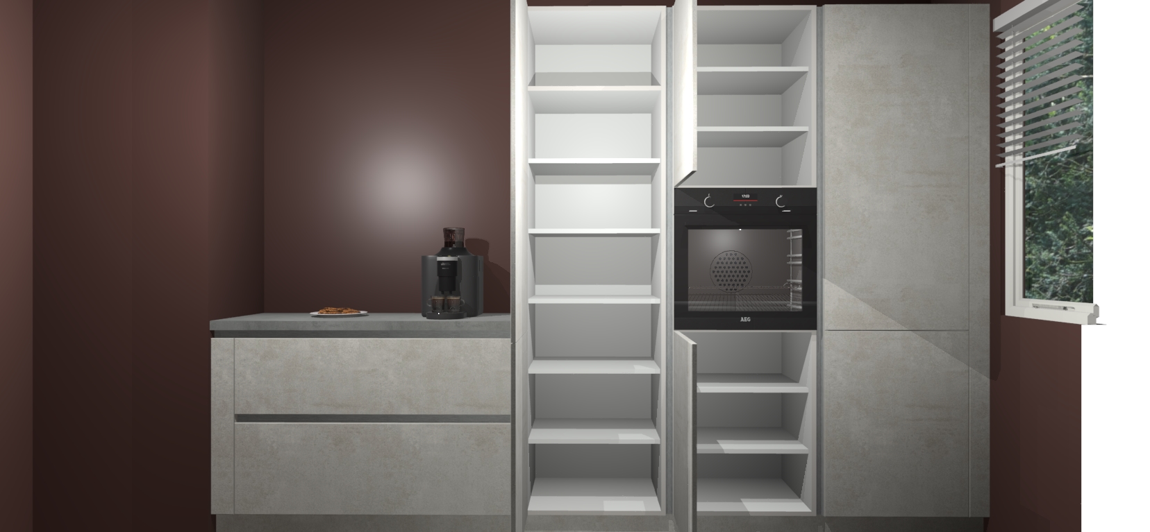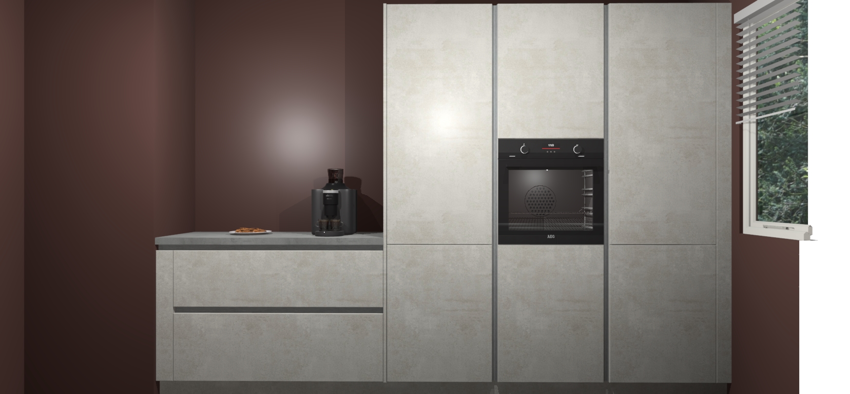 Een stijlvolle en praktische keuken als deze mag gezien worden. Dankzij de prachtige Beton Opaal matte afwerking wordt de keuken gemakkelijk het middelpunt van uw huis - hij ziet er geweldig uit onder allerlei lichtomstandigheden, van dag tot nacht!