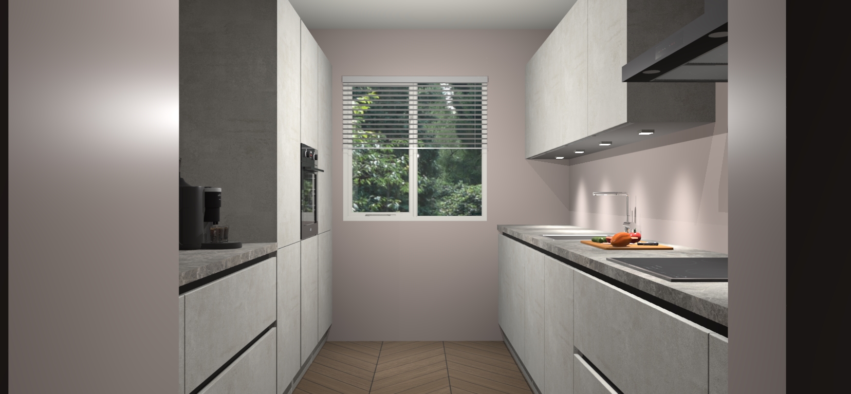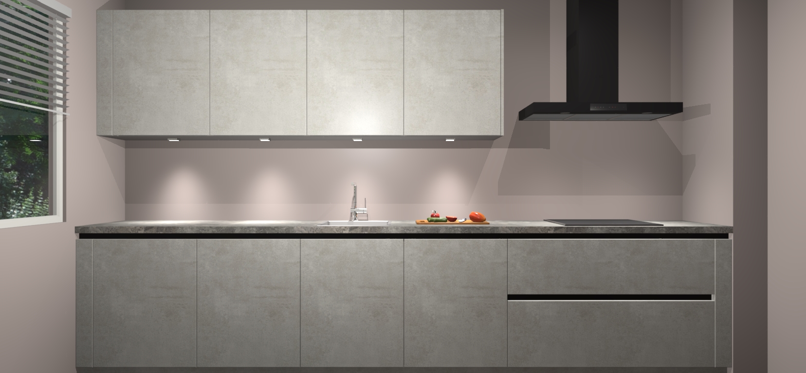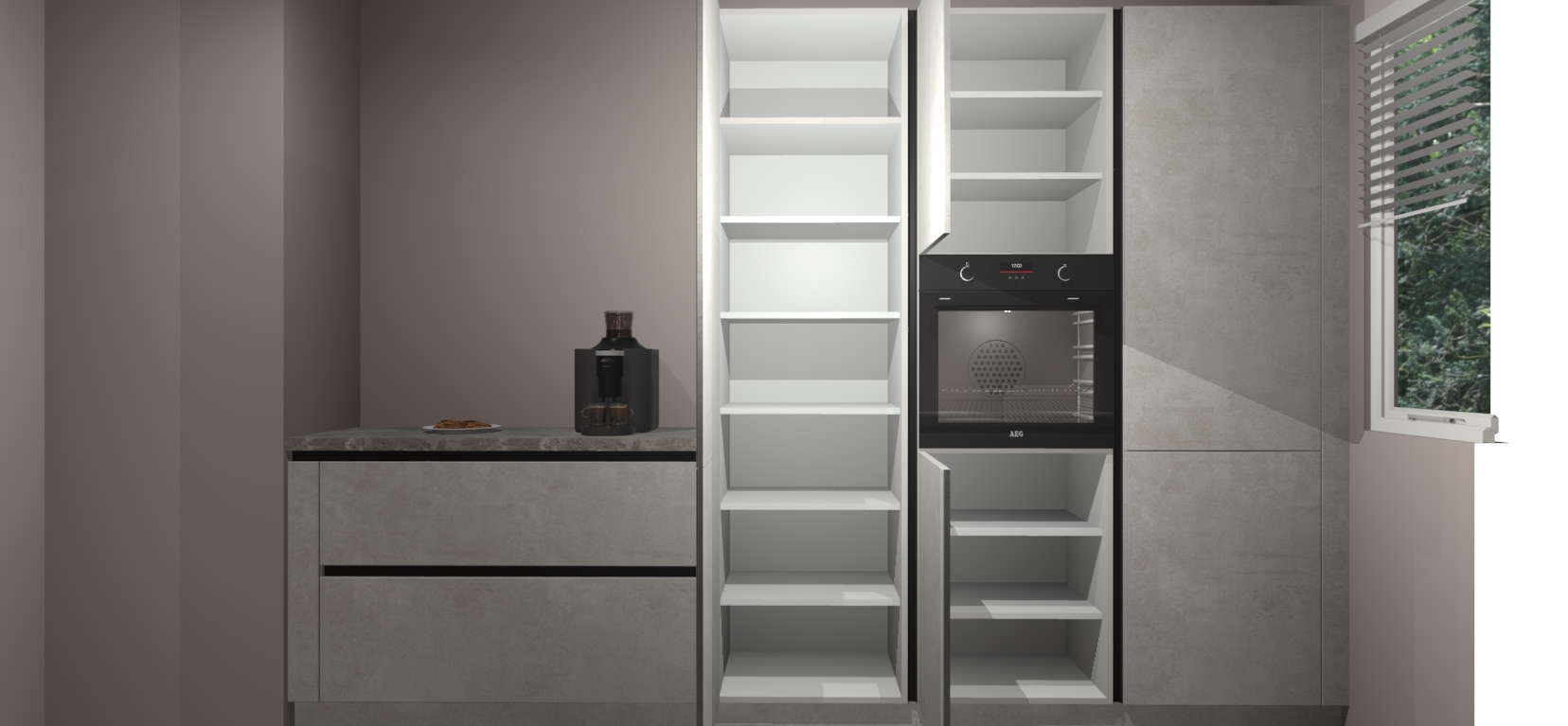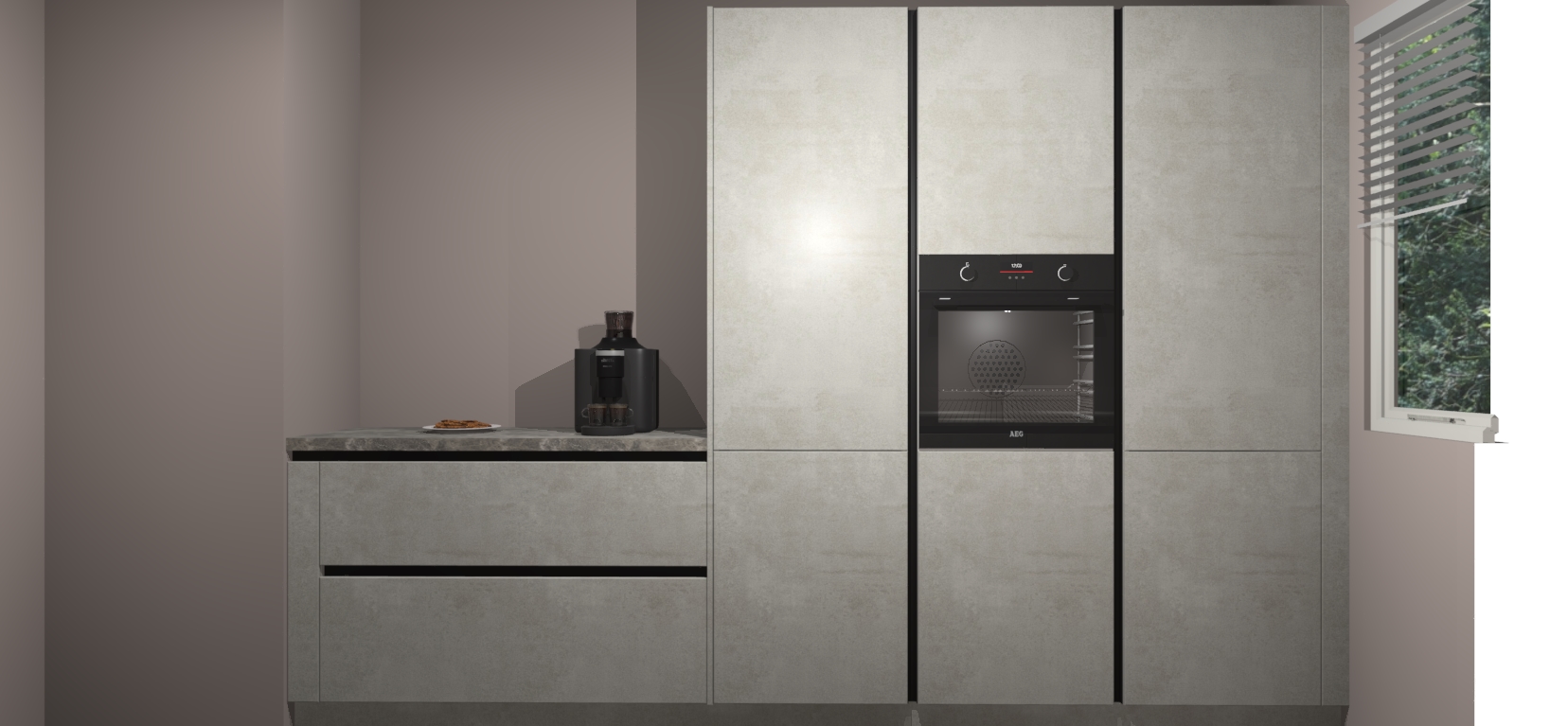 Een stijlvolle en praktische keuken als deze mag gezien worden. Dankzij de prachtige Beton Opaal matte afwerking wordt de keuken gemakkelijk het middelpunt van uw huis - hij ziet er geweldig uit onder allerlei lichtomstandigheden, van dag tot nacht!