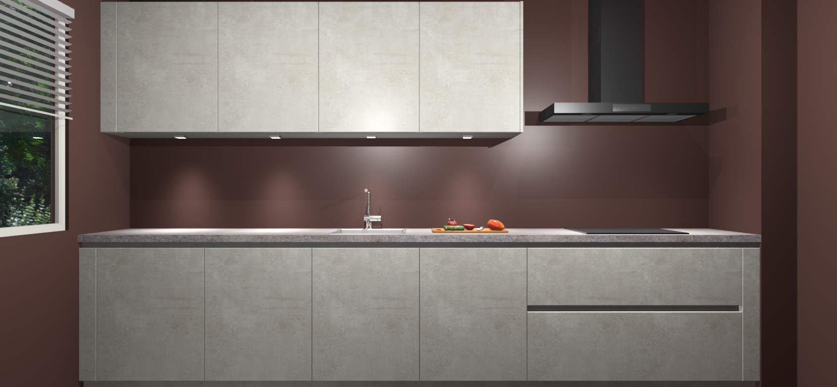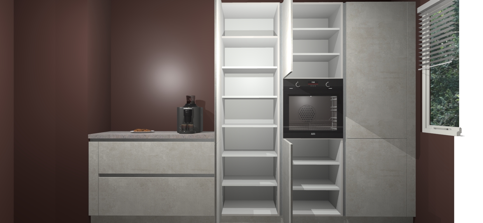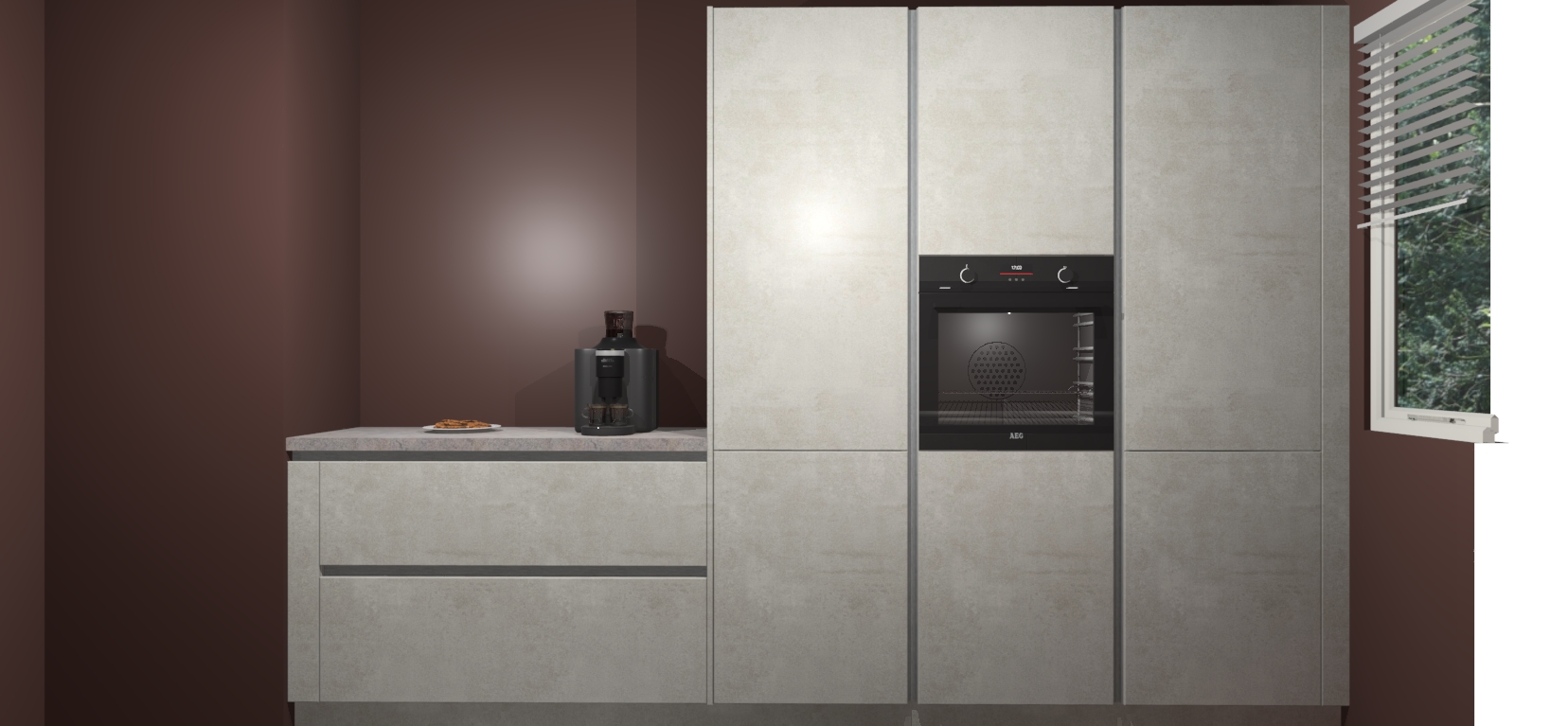 Een stijlvolle en praktische keuken als deze mag gezien worden. Dankzij de prachtige Beton Opaal matte afwerking wordt de keuken gemakkelijk het middelpunt van uw huis - hij ziet er geweldig uit onder allerlei lichtomstandigheden, van dag tot nacht!