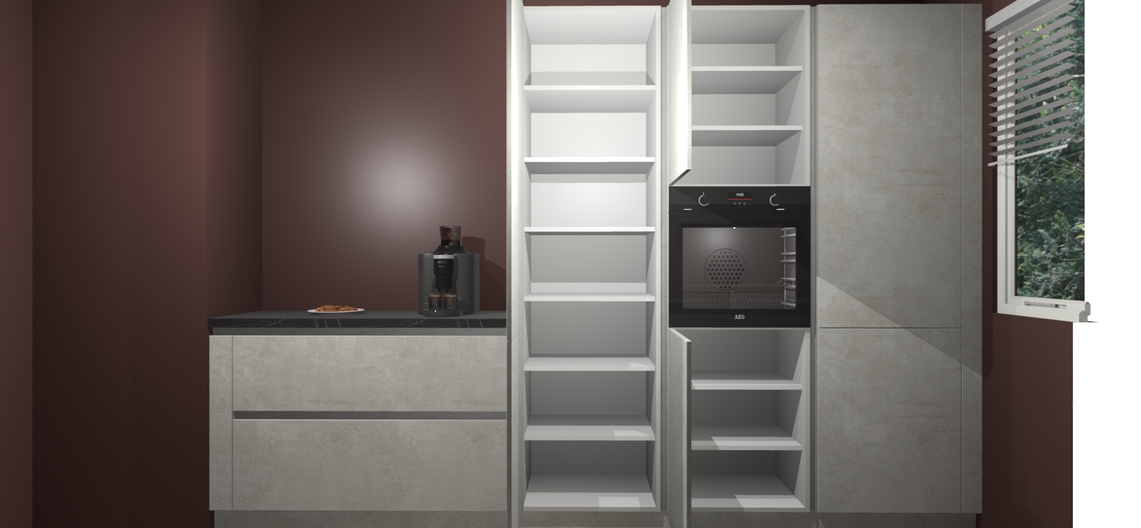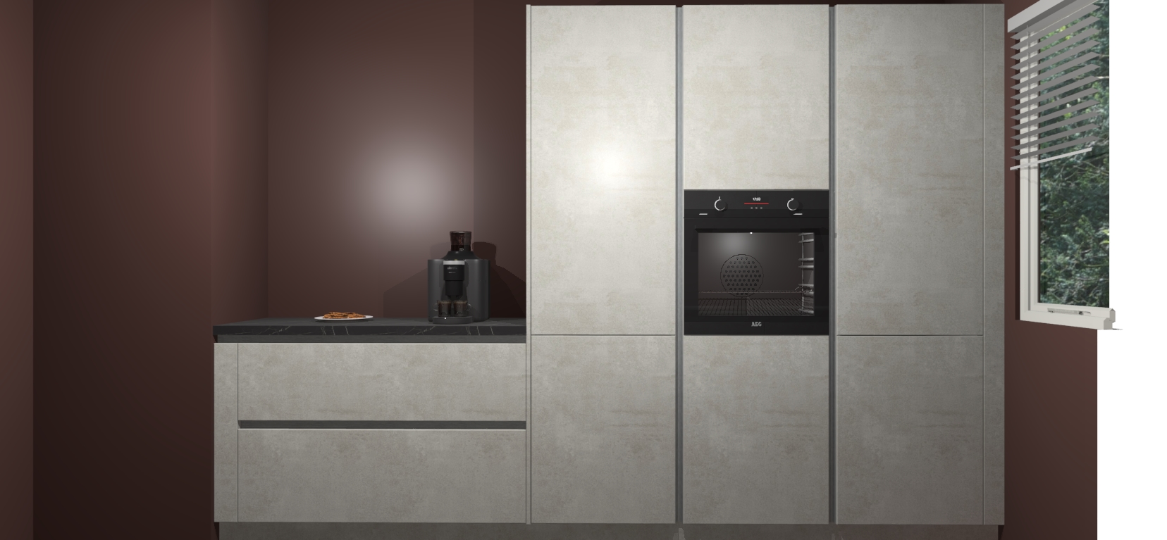 Een stijlvolle en praktische keuken als deze mag gezien worden. Dankzij de prachtige Beton Opaal matte afwerking wordt de keuken gemakkelijk het middelpunt van uw huis - hij ziet er geweldig uit onder allerlei lichtomstandigheden, van dag tot nacht!
