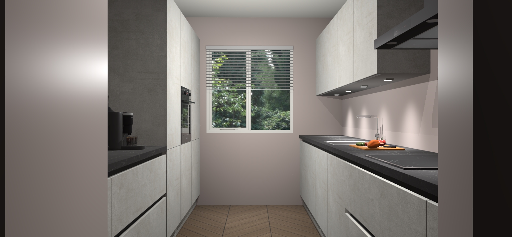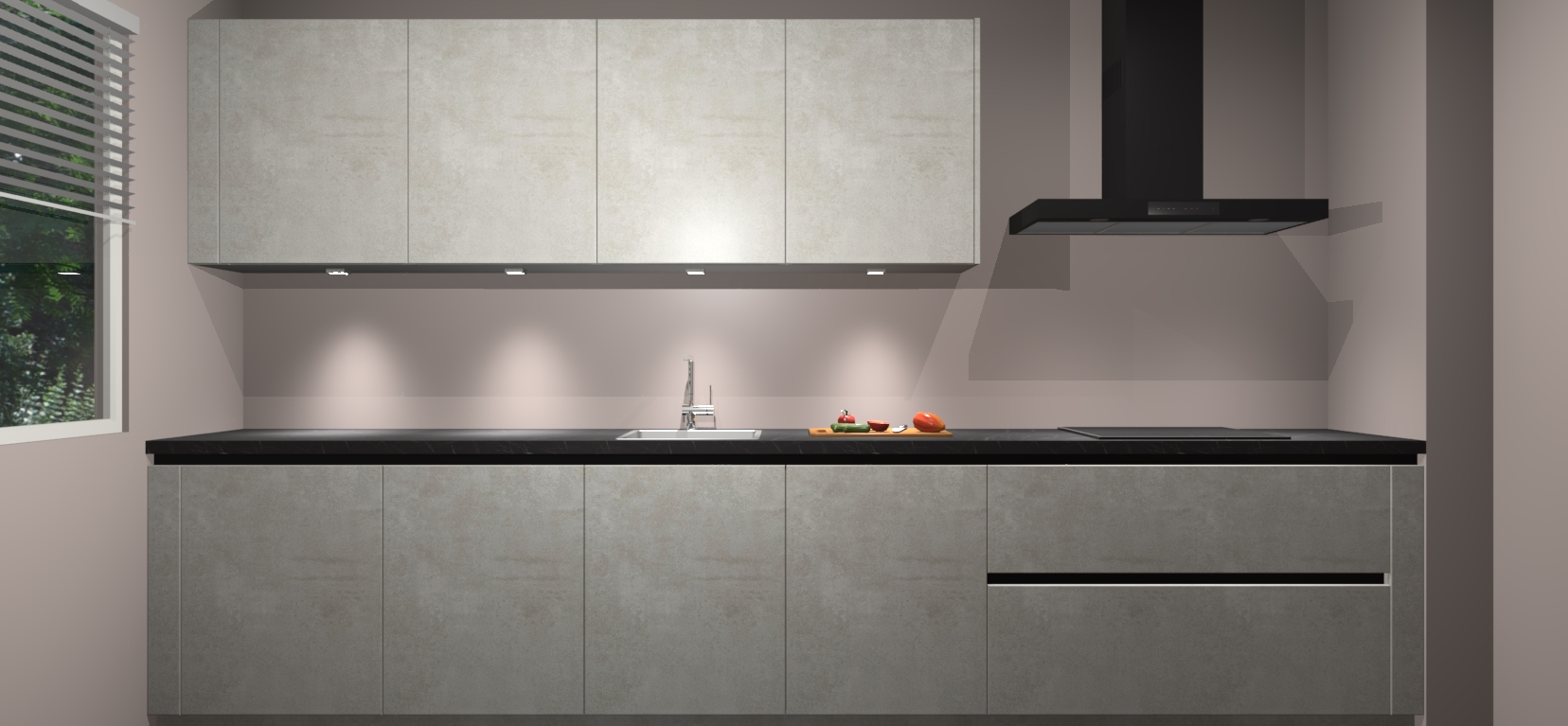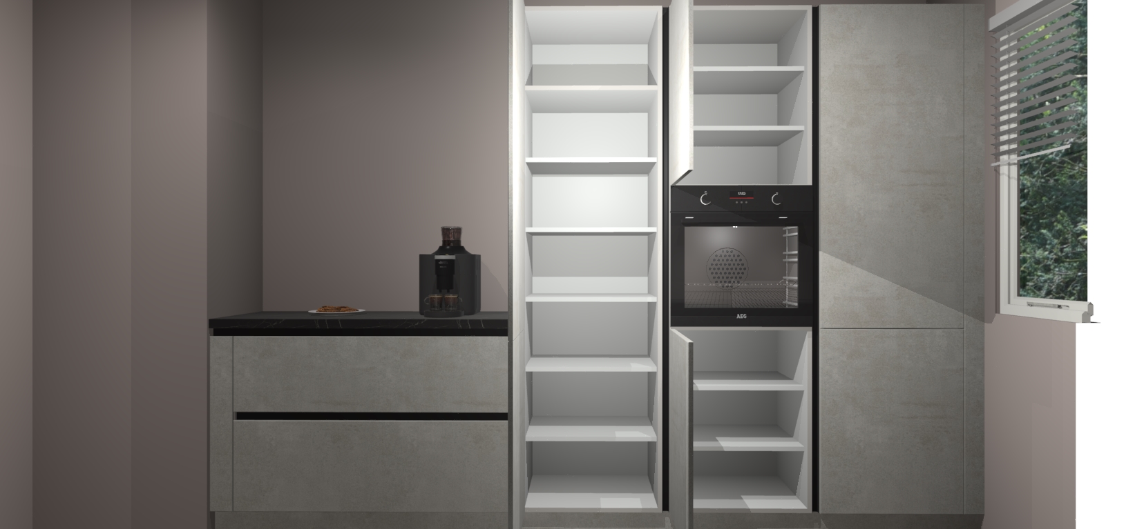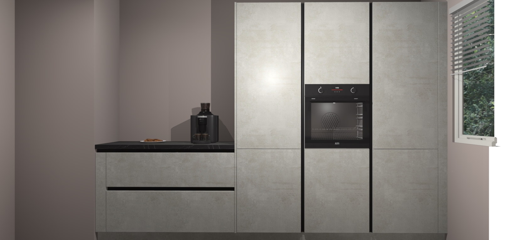 Een stijlvolle en praktische keuken als deze mag gezien worden. Dankzij de prachtige Beton Opaal matte afwerking wordt de keuken gemakkelijk het middelpunt van uw huis - hij ziet er geweldig uit onder allerlei lichtomstandigheden, van dag tot nacht!