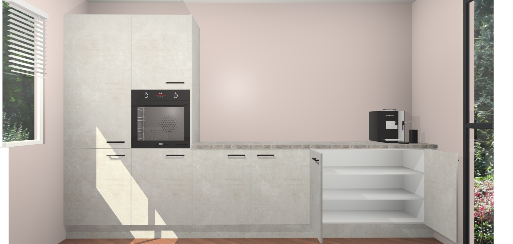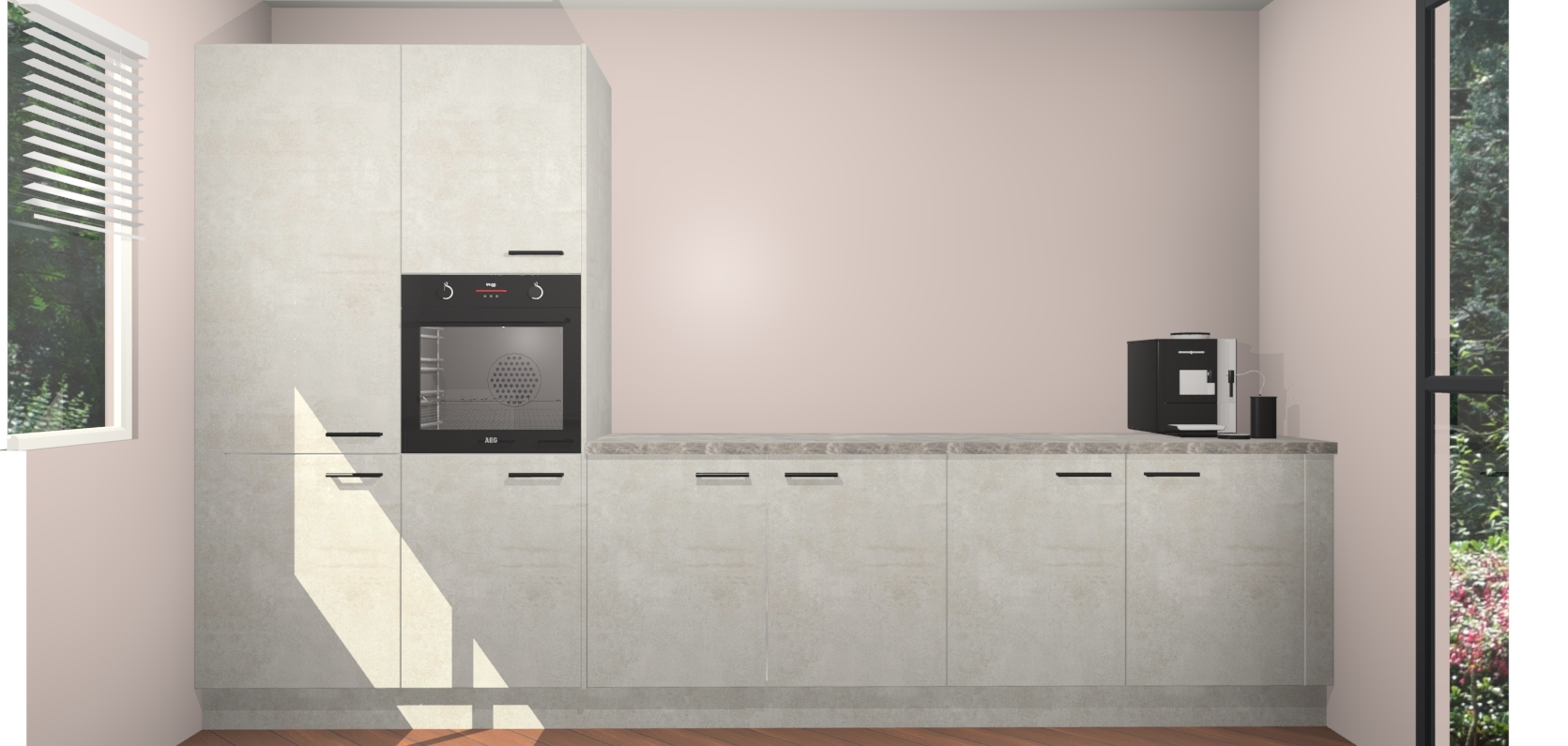 Welkom bij de Beton Opaal keuken Lusaka. Deze prachtige keuken zal de komende jaren het middelpunt van de belangstelling in uw huis zijn. Uitgerust met vijf inbouwapparaten komt u nooit kookgereedschap tekort. Bovendien geeft de warme houtlook elke ruimte een uitnodigende en tijdloze uitstraling.