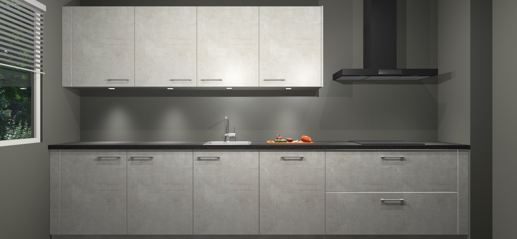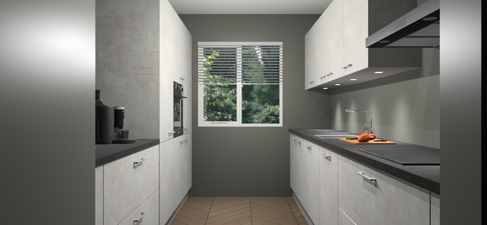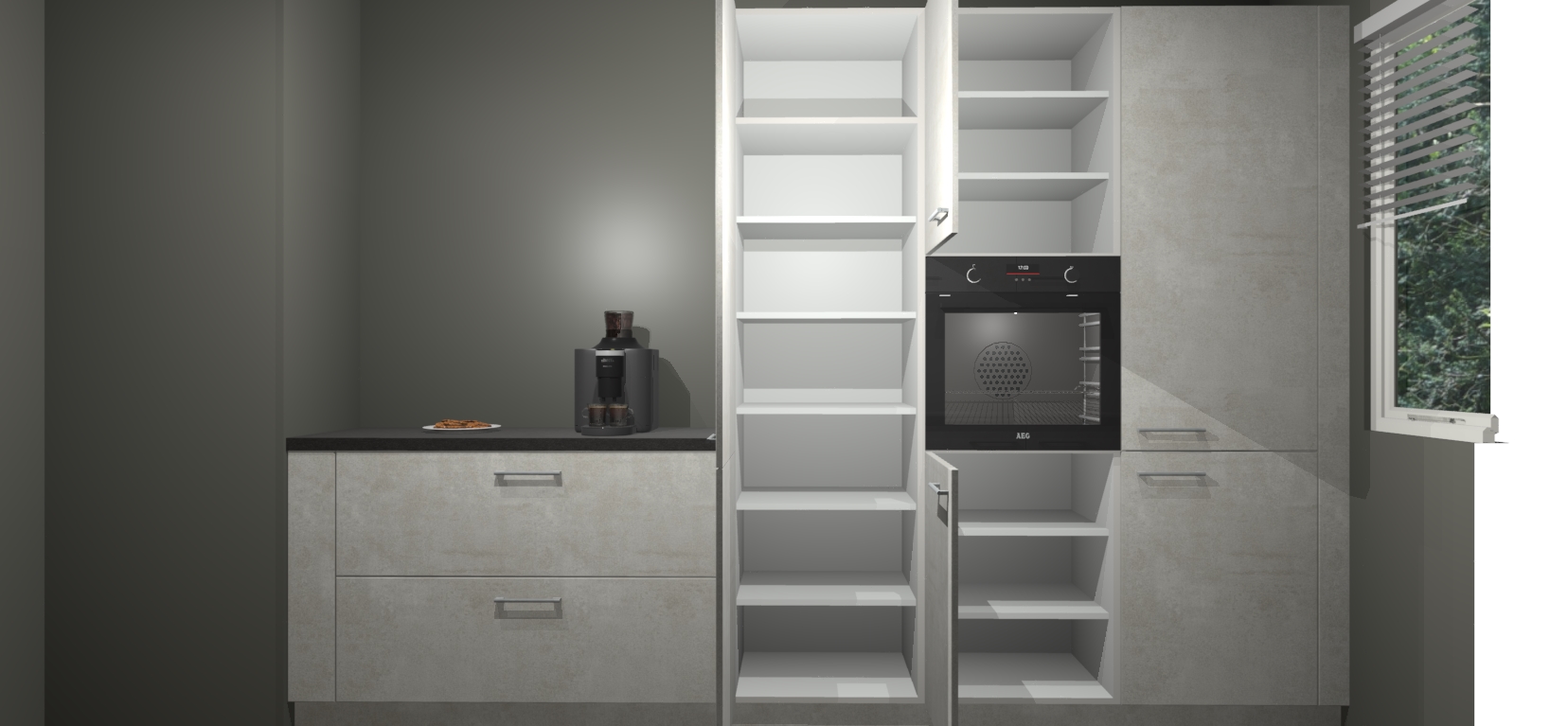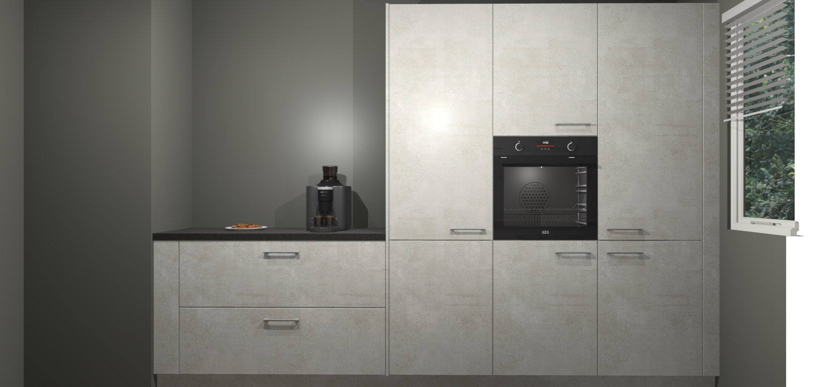 Een stijlvolle en praktische keuken als deze mag gezien worden. Dankzij de prachtige Beton Opaal matte afwerking wordt de keuken gemakkelijk het middelpunt van uw huis - hij ziet er geweldig uit onder allerlei lichtomstandigheden, van dag tot nacht!
