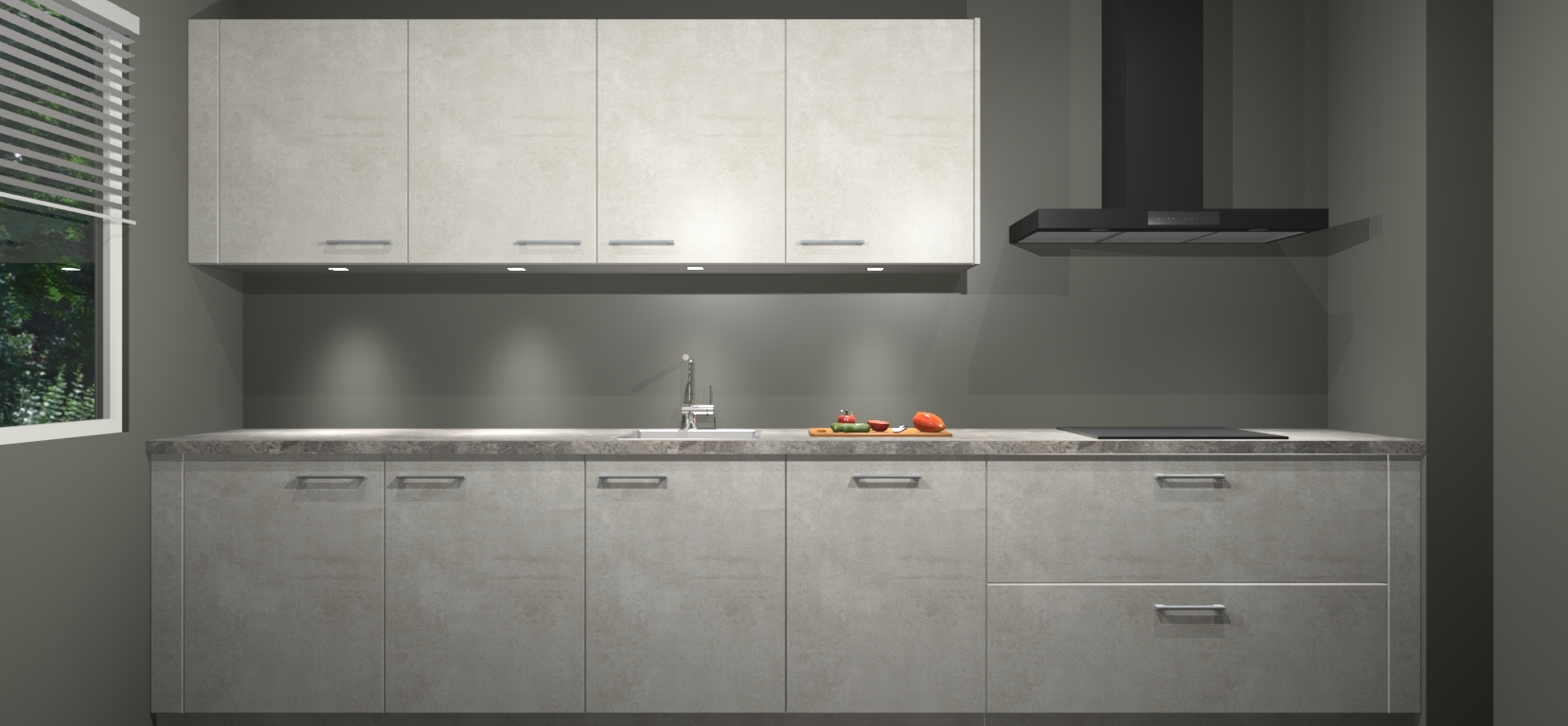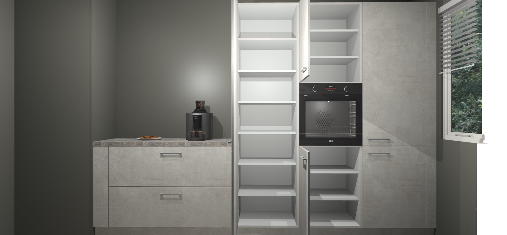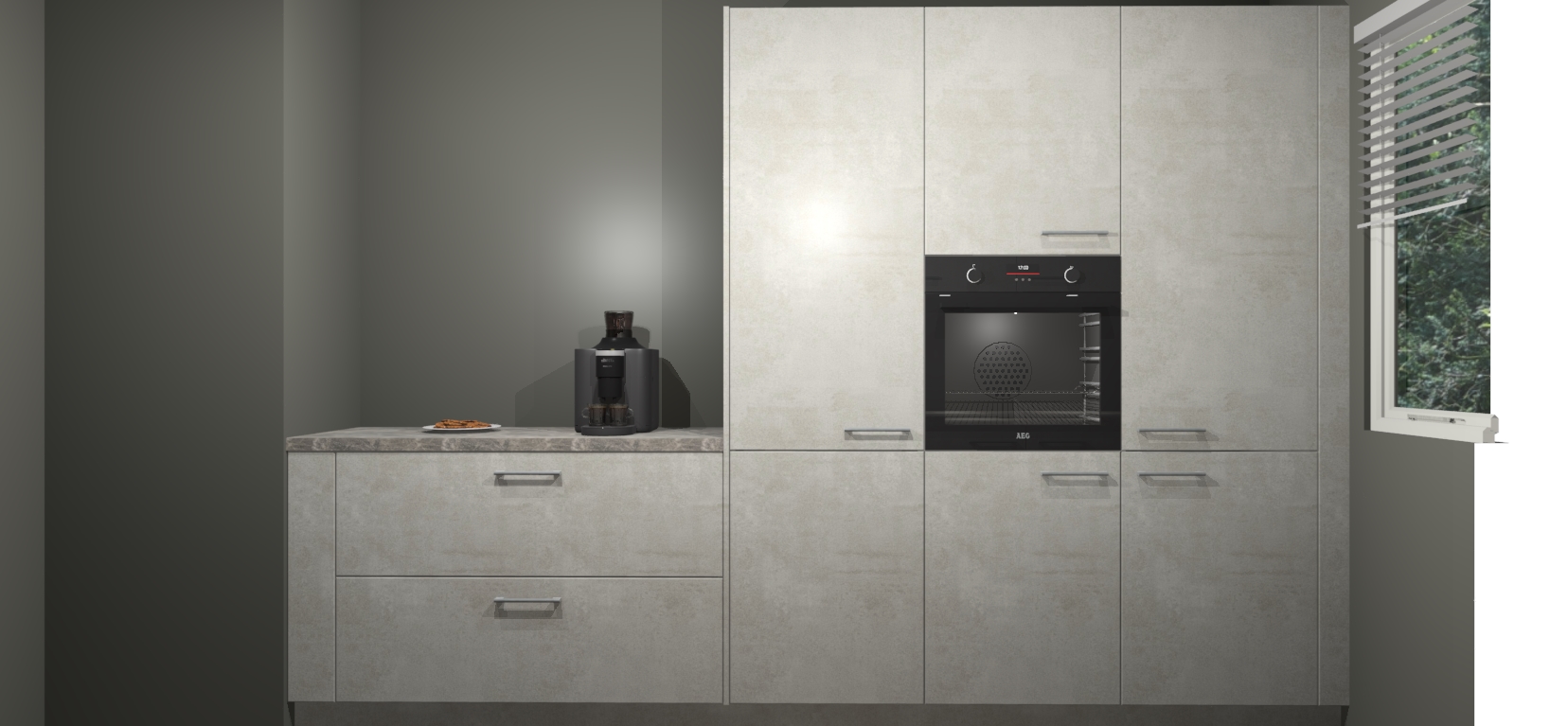 Een stijlvolle en praktische keuken als deze mag gezien worden. Dankzij de prachtige Beton Opaal matte afwerking wordt de keuken gemakkelijk het middelpunt van uw huis - hij ziet er geweldig uit onder allerlei lichtomstandigheden, van dag tot nacht!