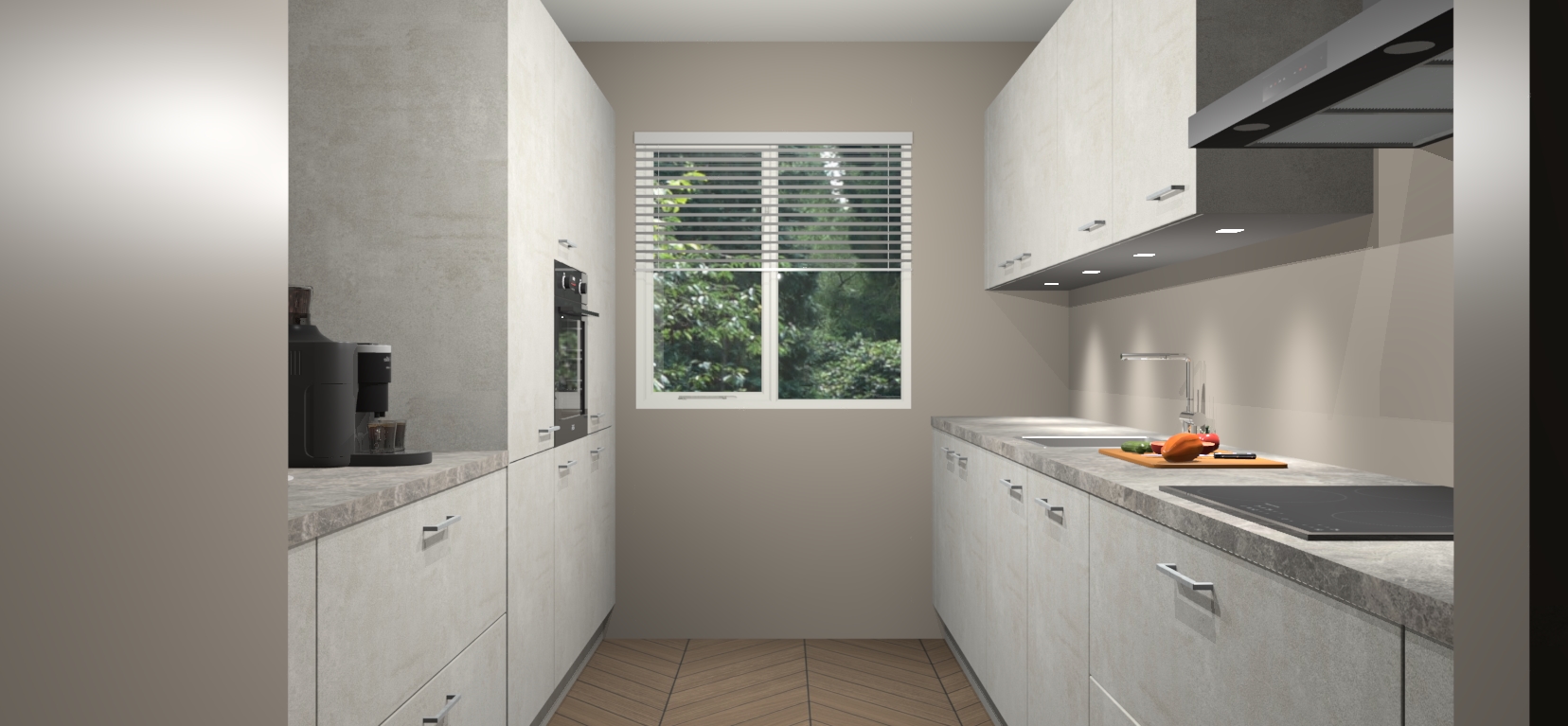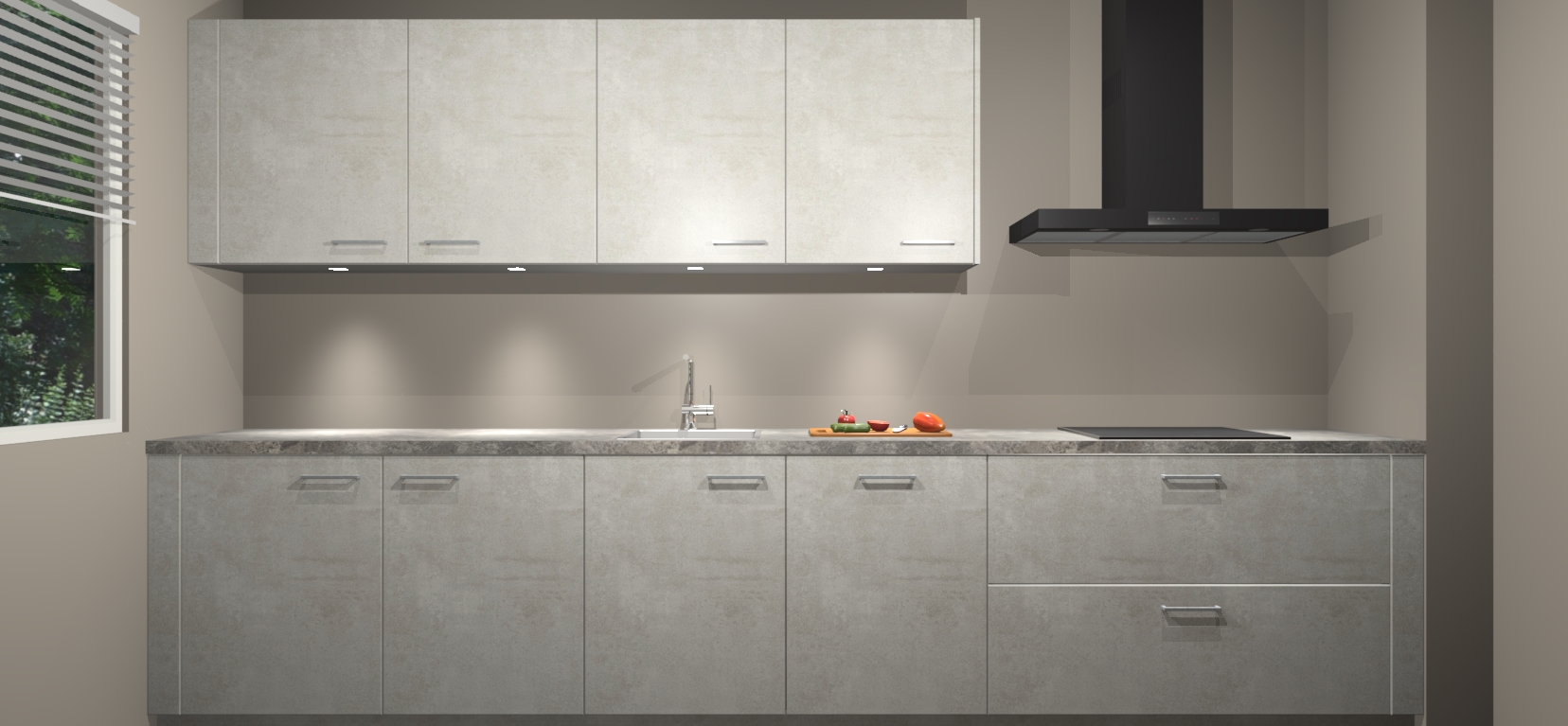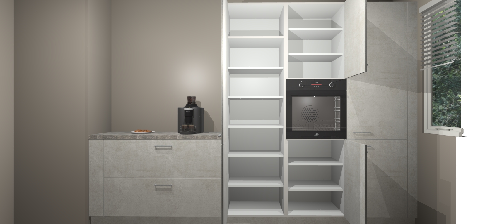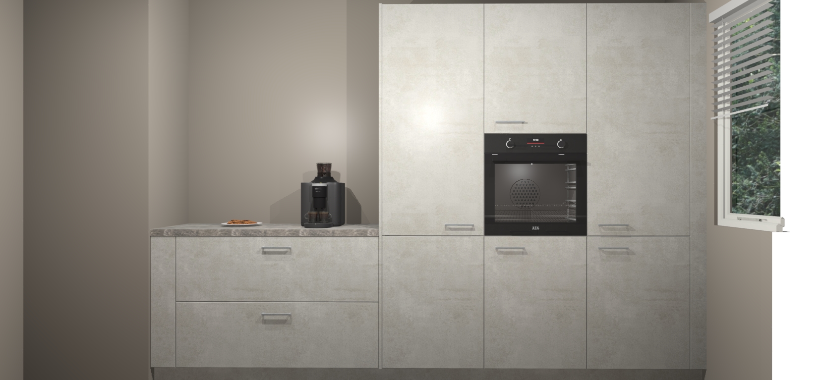 Een stijlvolle en praktische keuken als deze mag gezien worden. Dankzij de prachtige Beton Opaal matte afwerking wordt de keuken gemakkelijk het middelpunt van uw huis - hij ziet er geweldig uit onder allerlei lichtomstandigheden, van dag tot nacht!