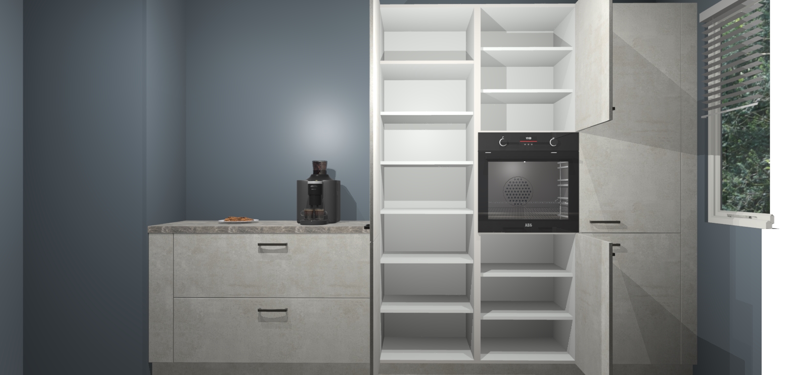 Een stijlvolle en praktische keuken als deze mag gezien worden. Dankzij de prachtige Beton Opaal matte afwerking wordt de keuken gemakkelijk het middelpunt van uw huis - hij ziet er geweldig uit onder allerlei lichtomstandigheden, van dag tot nacht!