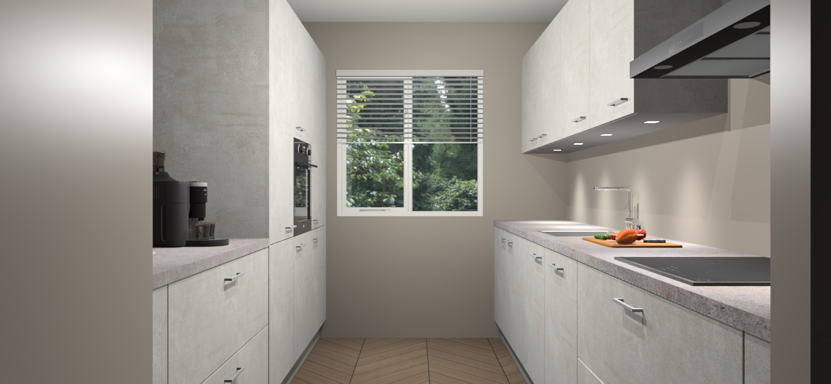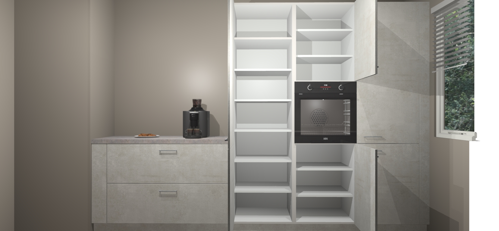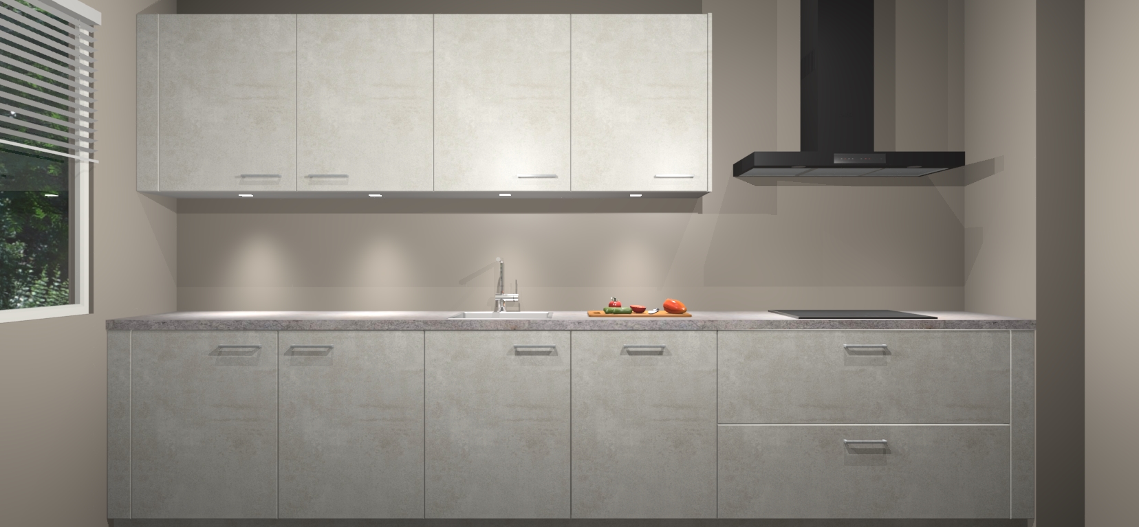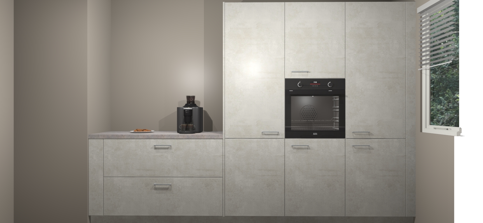 Een stijlvolle en praktische keuken als deze mag gezien worden. Dankzij de prachtige Beton Opaal matte afwerking wordt de keuken gemakkelijk het middelpunt van uw huis - hij ziet er geweldig uit onder allerlei lichtomstandigheden, van dag tot nacht!