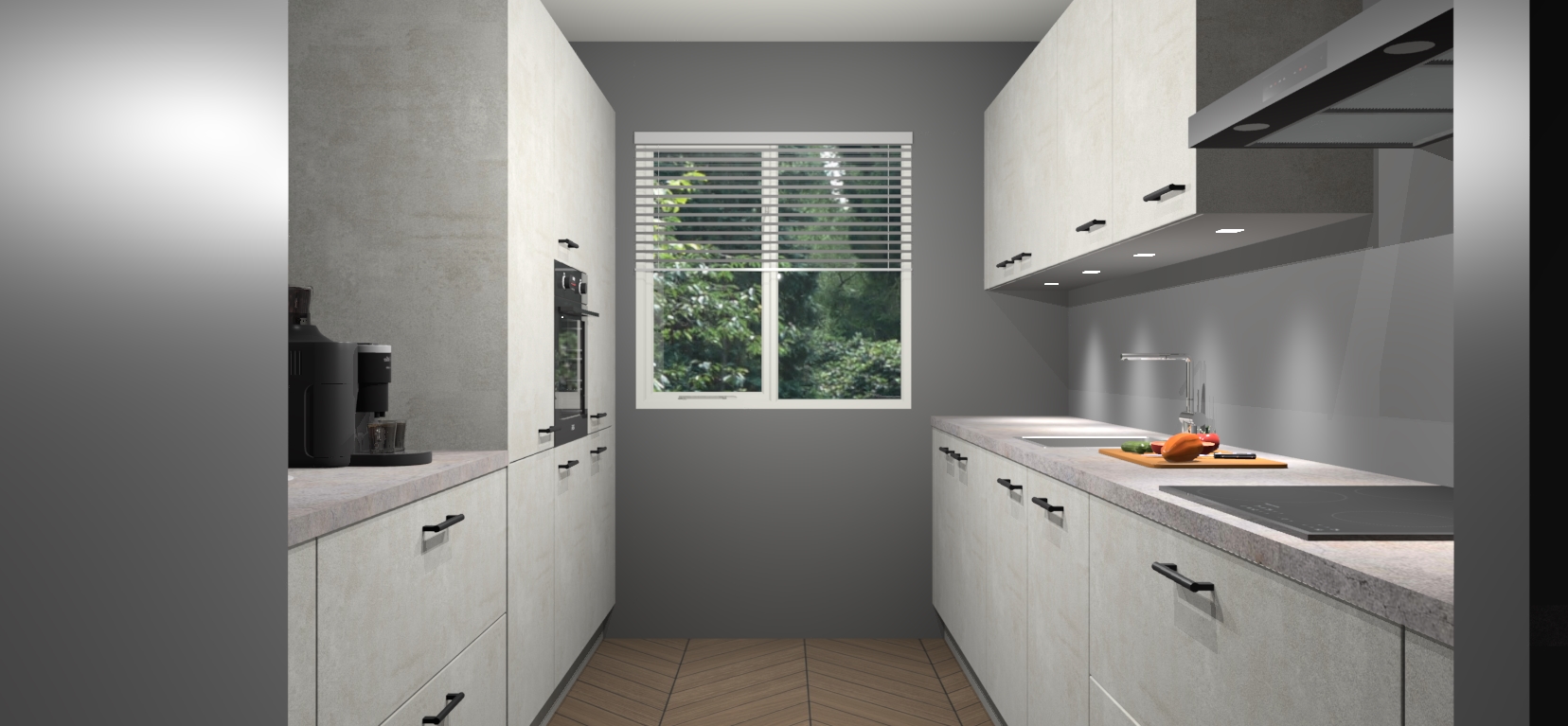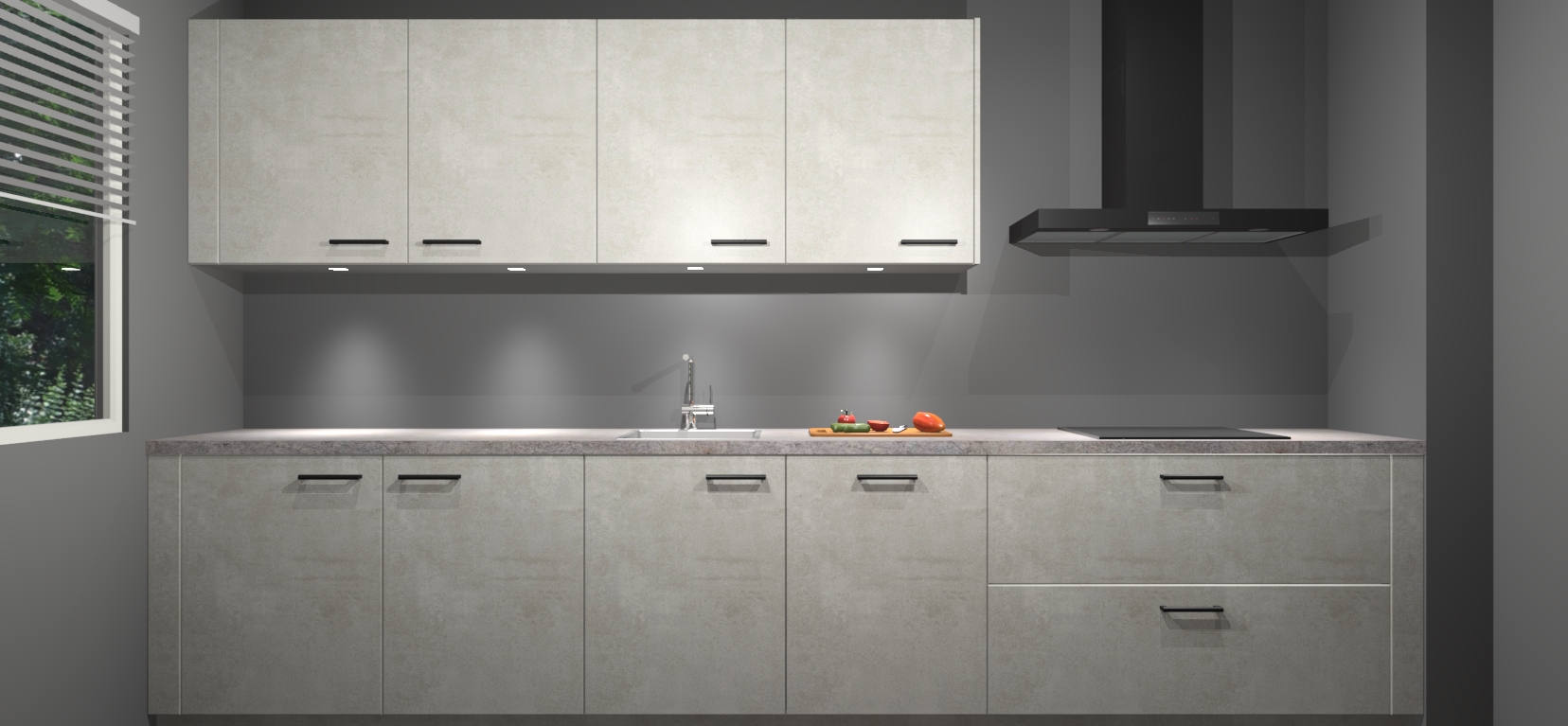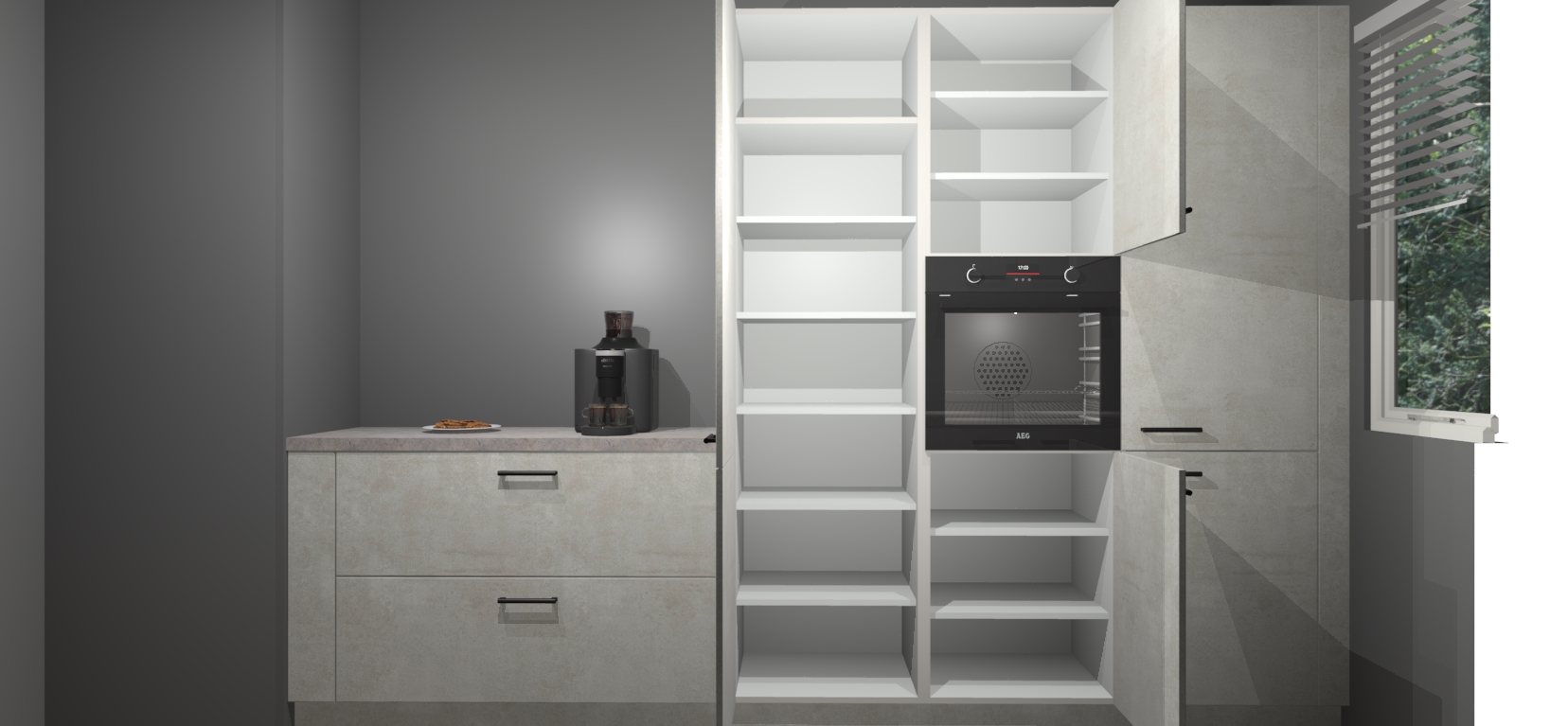 Een stijlvolle en praktische keuken als deze mag gezien worden. Dankzij de prachtige Beton Opaal matte afwerking wordt de keuken gemakkelijk het middelpunt van uw huis - hij ziet er geweldig uit onder allerlei lichtomstandigheden, van dag tot nacht!