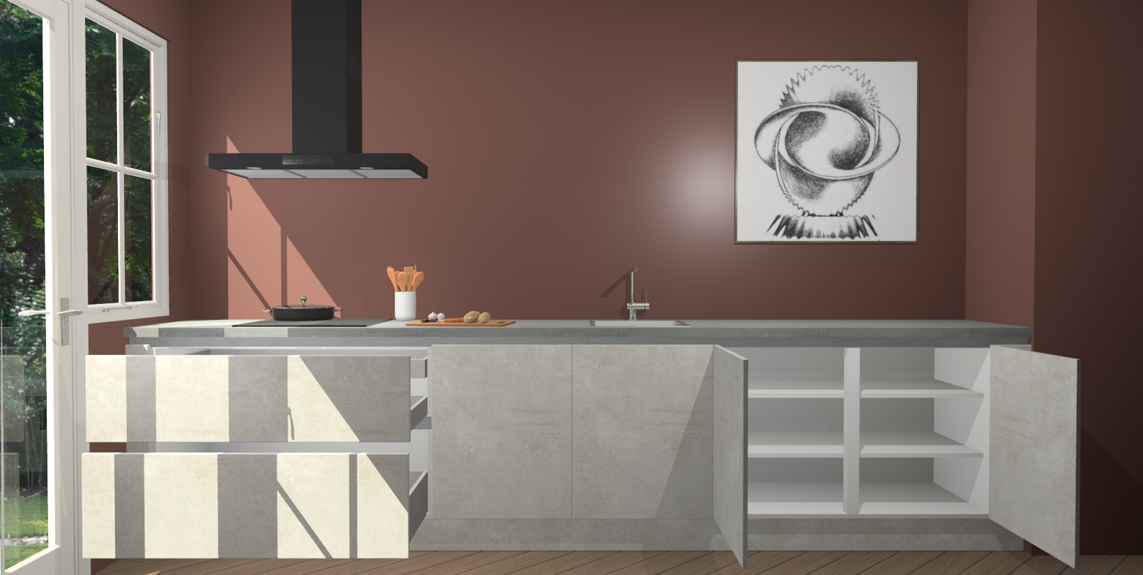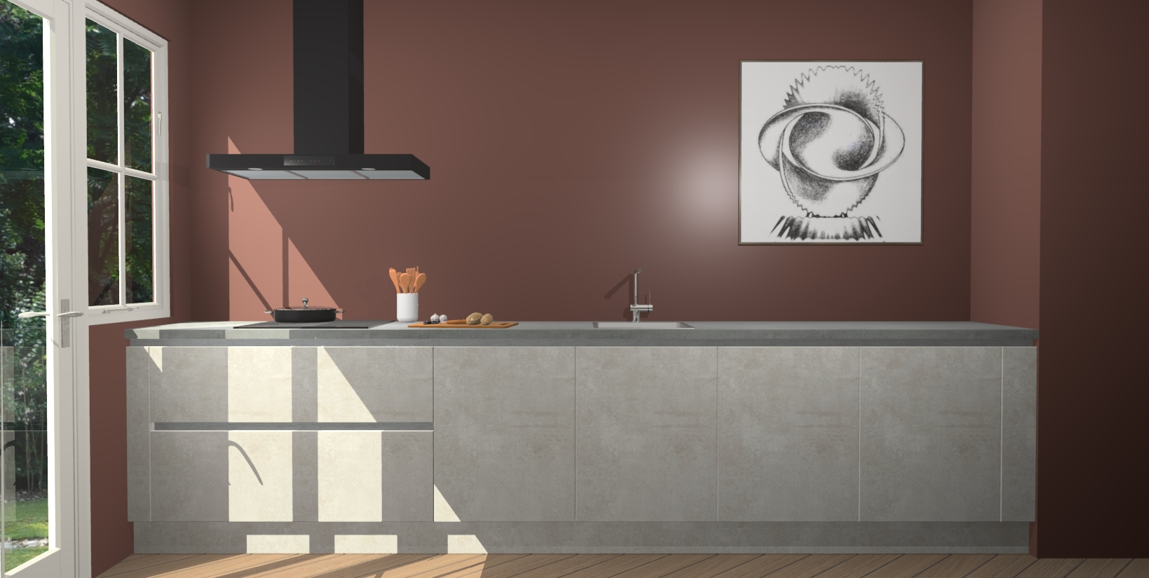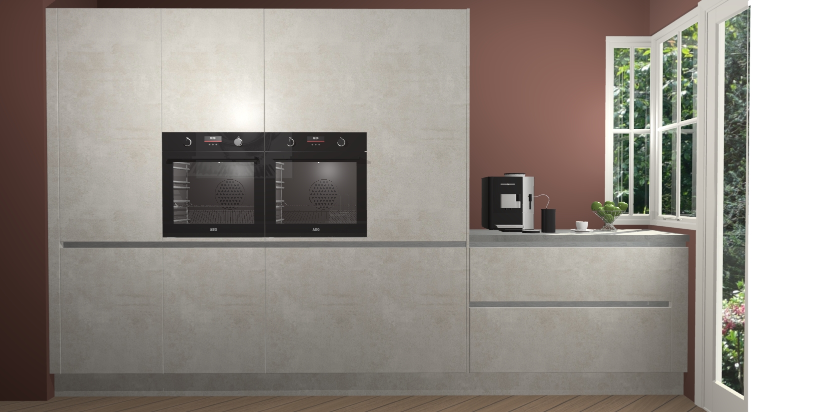 Een stijlvolle en praktische keuken als deze mag gezien worden. Dankzij de prachtige beton opal matte afwerking wordt de keuken gemakkelijk het middelpunt van uw huis - hij ziet er geweldig uit onder allerlei lichtomstandigheden, van dag tot nacht!