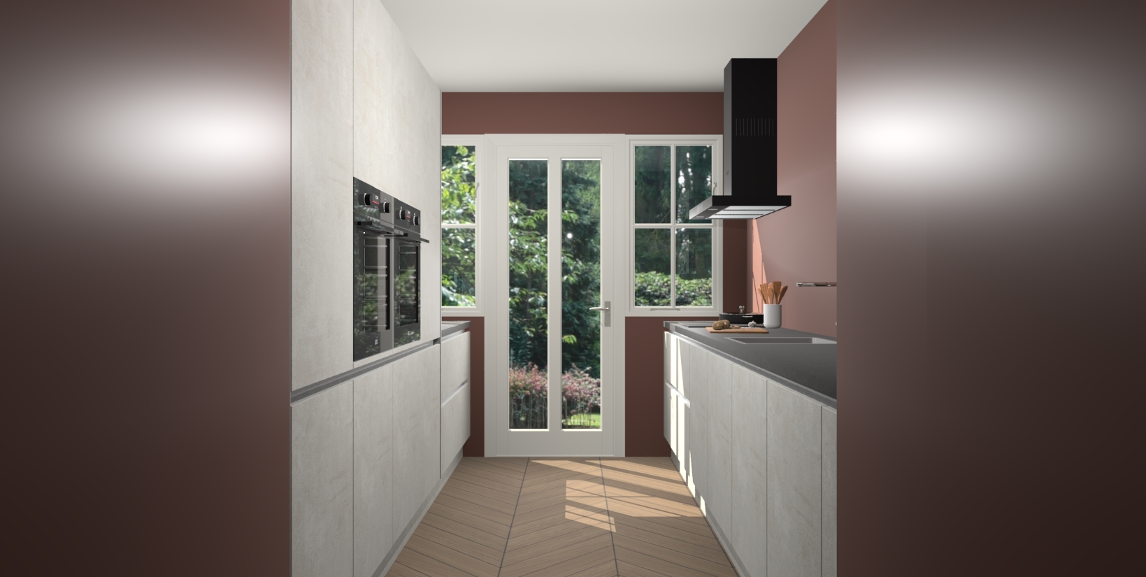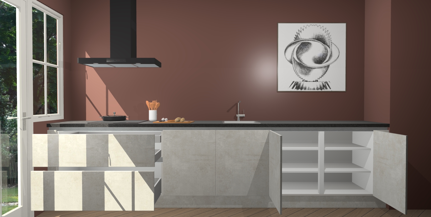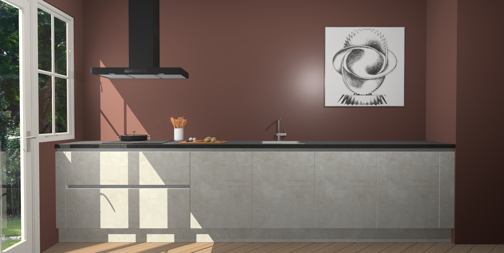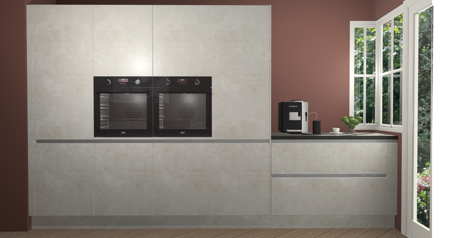 Een stijlvolle en praktische keuken als deze mag gezien worden. Dankzij de prachtige beton opal matte afwerking wordt de keuken gemakkelijk het middelpunt van uw huis - hij ziet er geweldig uit onder allerlei lichtomstandigheden, van dag tot nacht!
