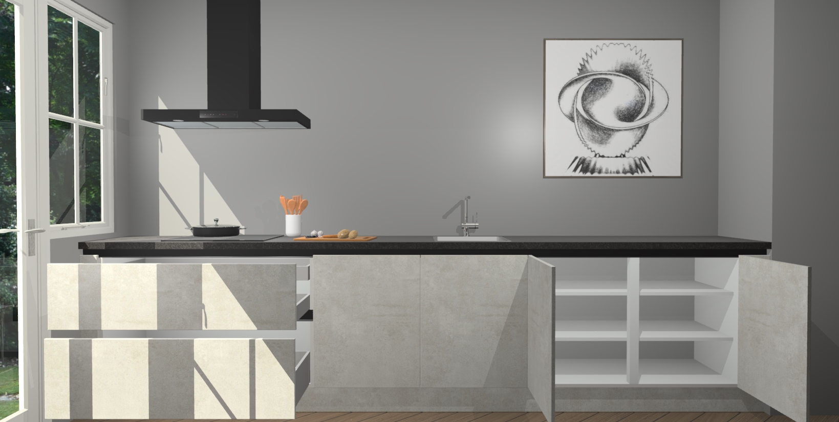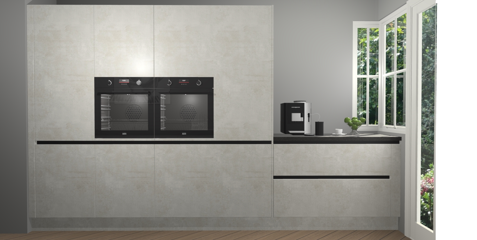 Een stijlvolle en praktische keuken als deze mag gezien worden. Dankzij de prachtige beton opal matte afwerking wordt de keuken gemakkelijk het middelpunt van uw huis - hij ziet er geweldig uit onder allerlei lichtomstandigheden, van dag tot nacht!