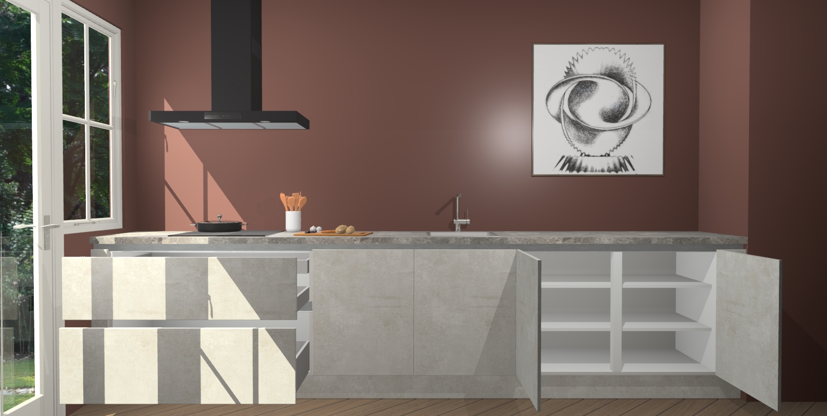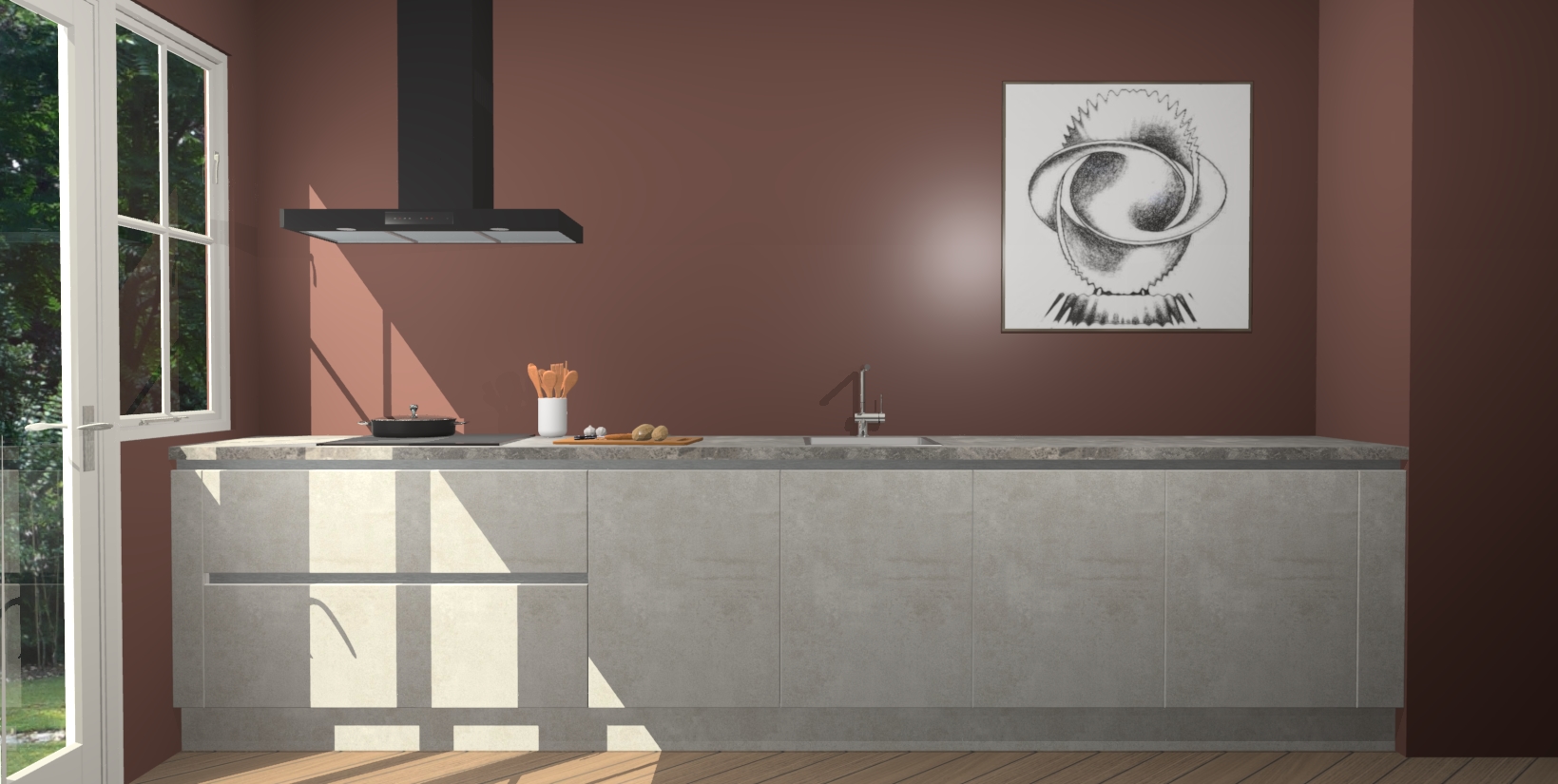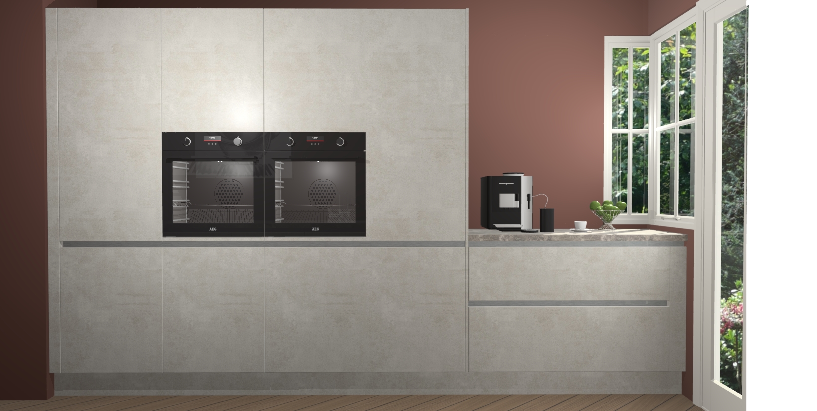 Een stijlvolle en praktische keuken als deze mag gezien worden. Dankzij de prachtige beton opal matte afwerking wordt de keuken gemakkelijk het middelpunt van uw huis - hij ziet er geweldig uit onder allerlei lichtomstandigheden, van dag tot nacht!