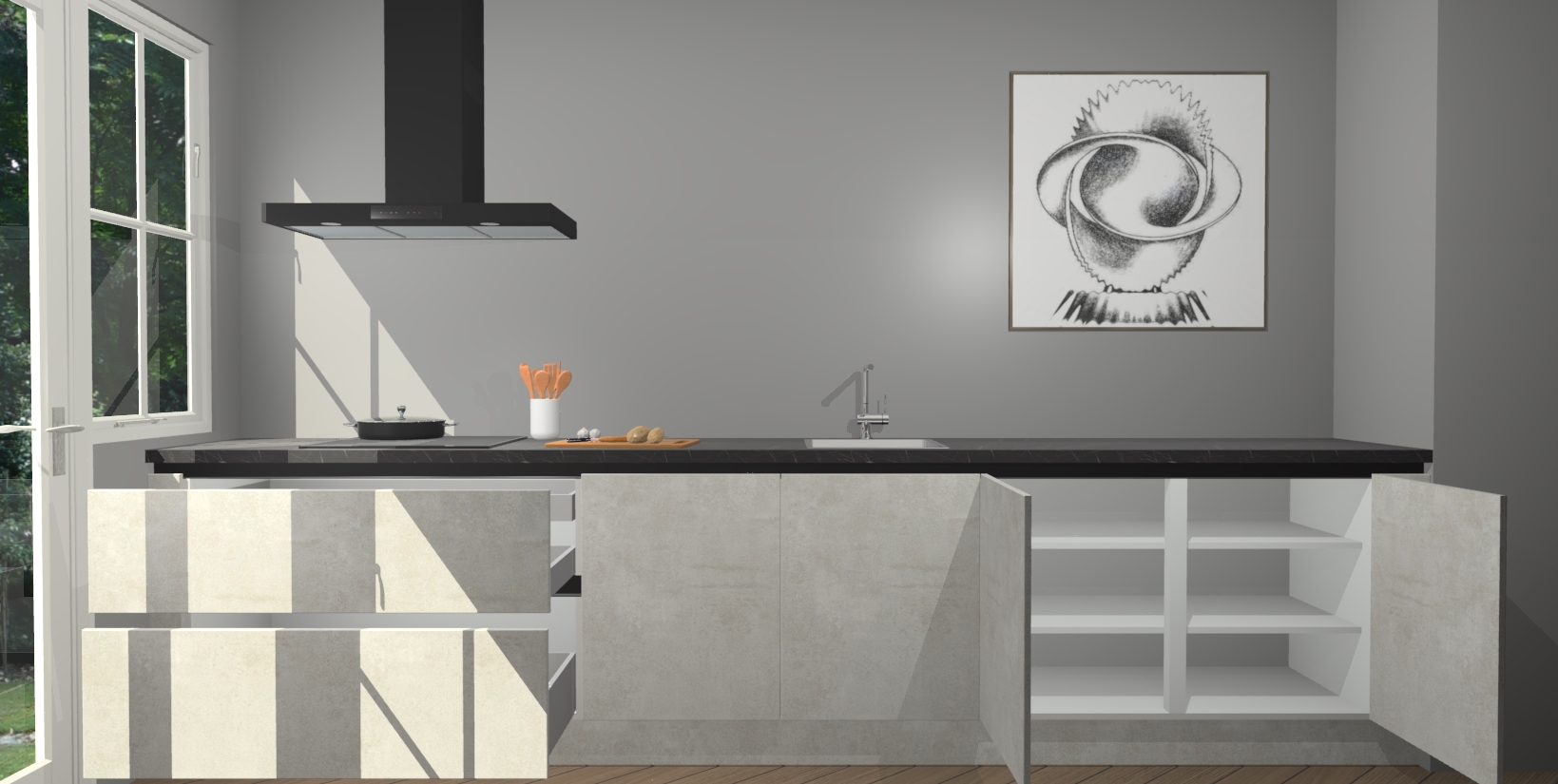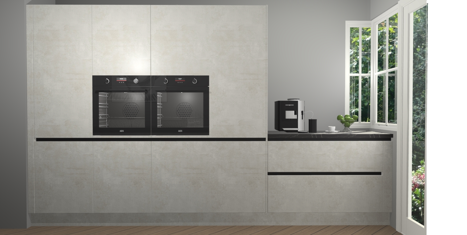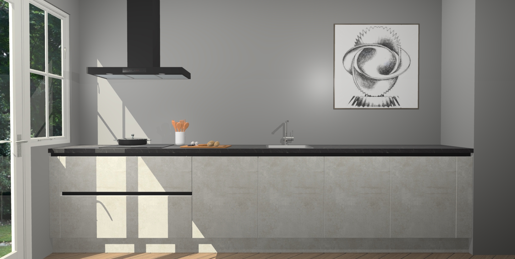 Een stijlvolle en praktische keuken als deze mag gezien worden. Dankzij de prachtige beton opal matte afwerking wordt de keuken gemakkelijk het middelpunt van uw huis - hij ziet er geweldig uit onder allerlei lichtomstandigheden, van dag tot nacht!