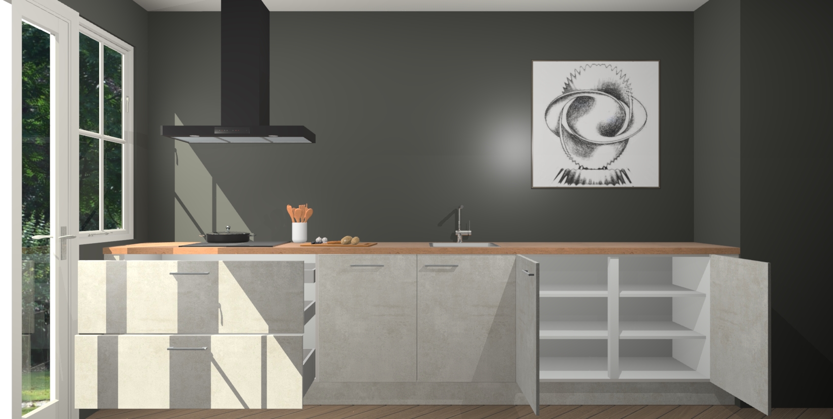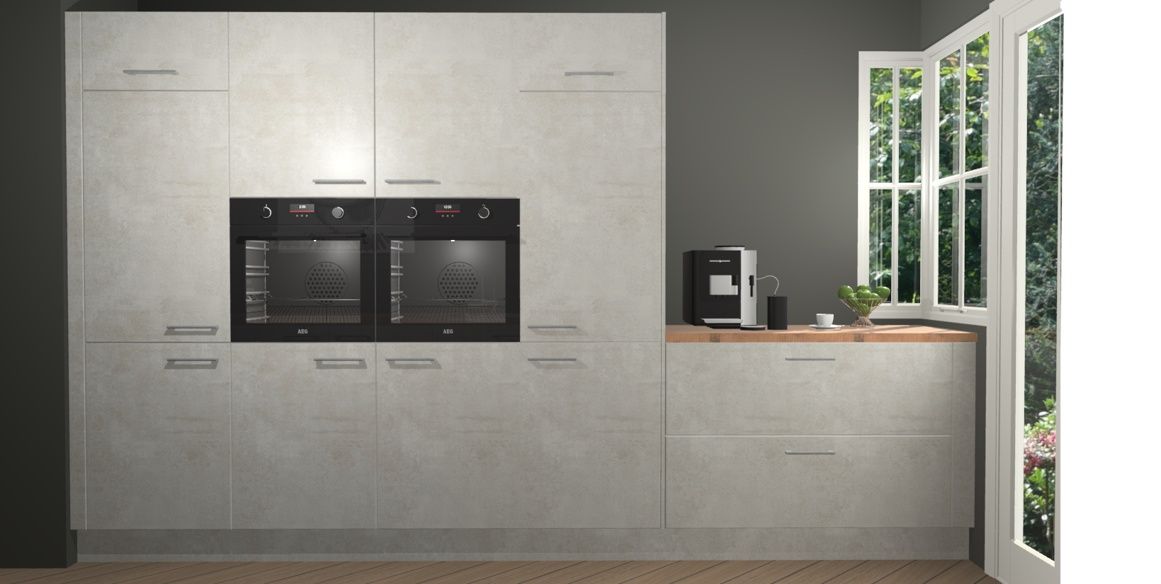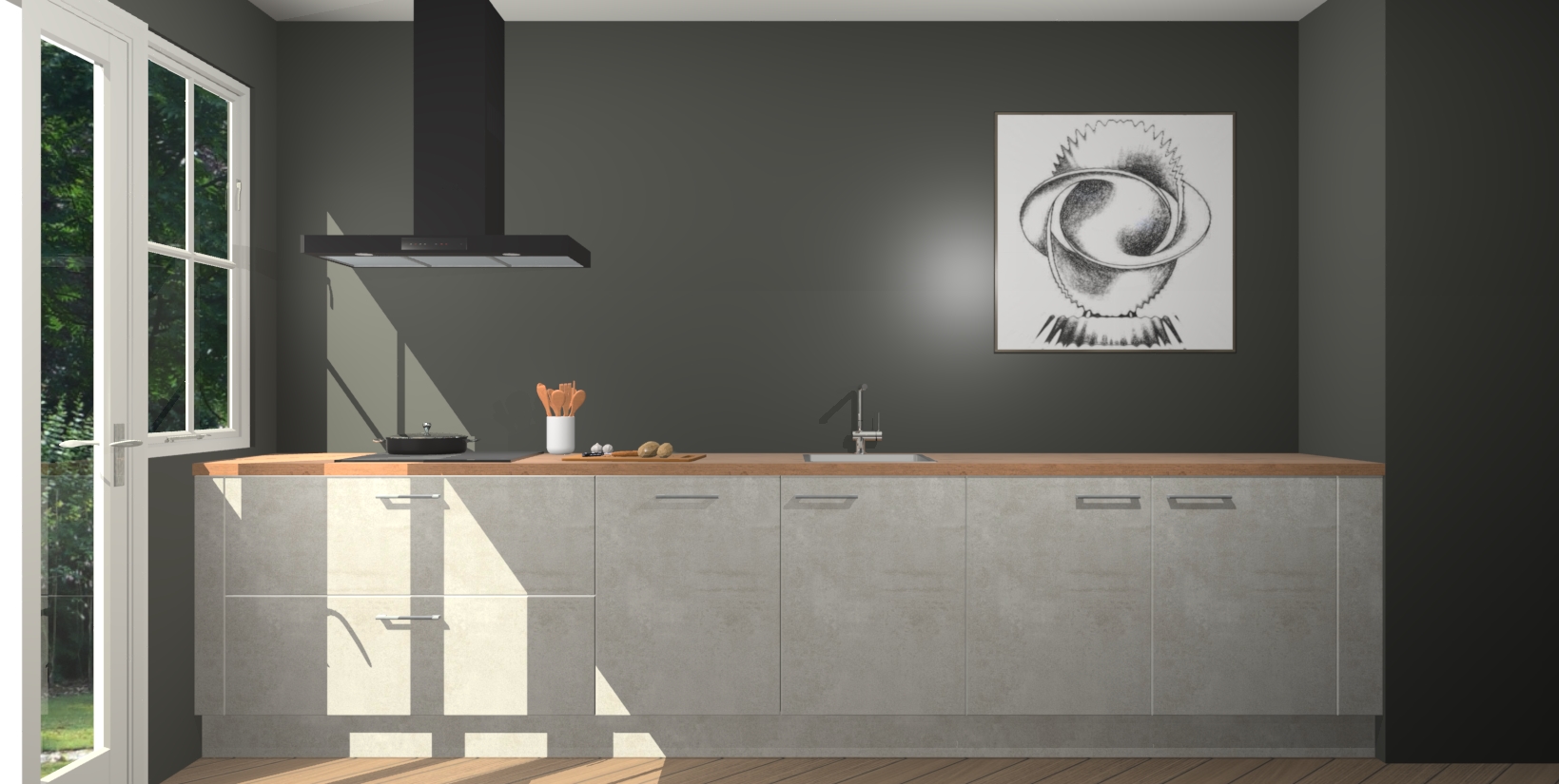 Een stijlvolle en praktische keuken als deze mag gezien worden. Dankzij de prachtige beton opal matte afwerking wordt de keuken gemakkelijk het middelpunt van uw huis - hij ziet er geweldig uit onder allerlei lichtomstandigheden, van dag tot nacht!