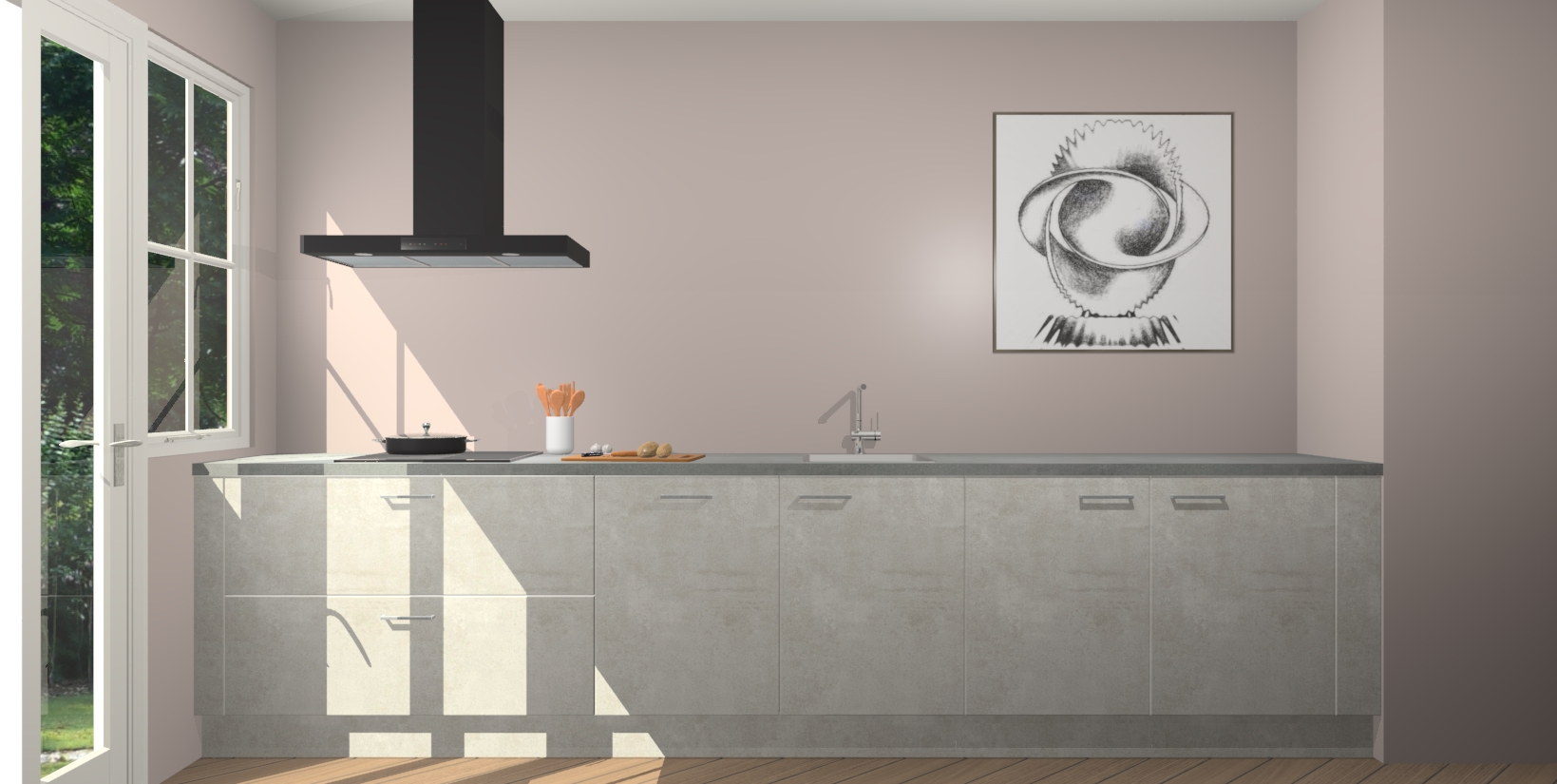 Een stijlvolle en praktische keuken als deze mag gezien worden. Dankzij de prachtige beton opal matte afwerking wordt de keuken gemakkelijk het middelpunt van uw huis - hij ziet er geweldig uit onder allerlei lichtomstandigheden, van dag tot nacht!