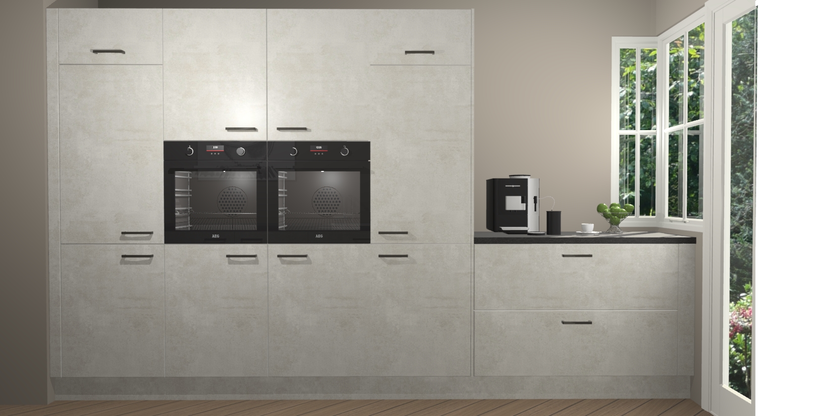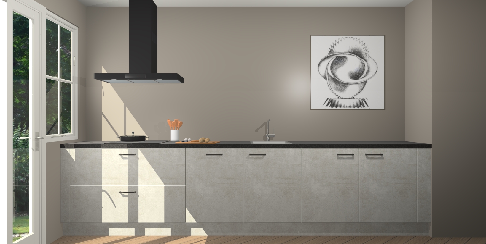 Een stijlvolle en praktische keuken als deze mag gezien worden. Dankzij de prachtige beton opal matte afwerking wordt de keuken gemakkelijk het middelpunt van uw huis - hij ziet er geweldig uit onder allerlei lichtomstandigheden, van dag tot nacht!