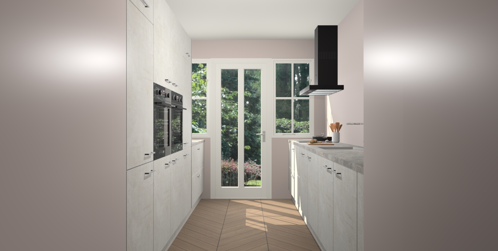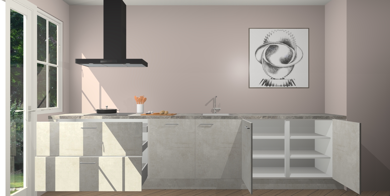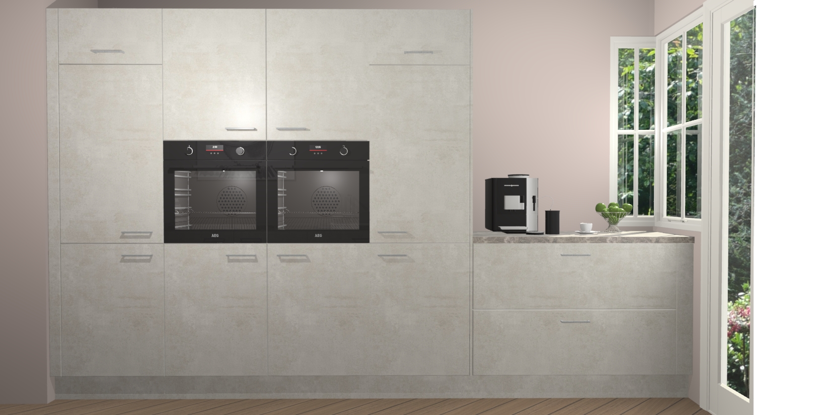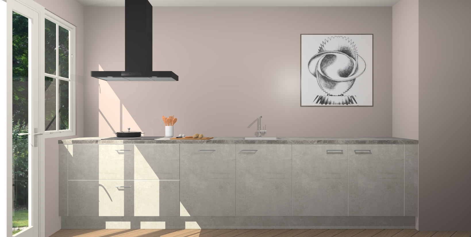 Een stijlvolle en praktische keuken als deze mag gezien worden. Dankzij de prachtige beton opal matte afwerking wordt de keuken gemakkelijk het middelpunt van uw huis - hij ziet er geweldig uit onder allerlei lichtomstandigheden, van dag tot nacht!