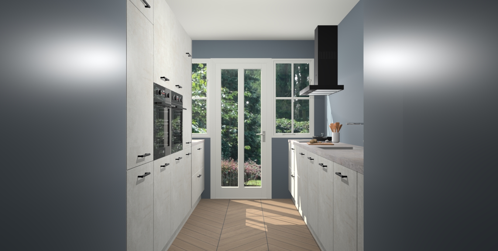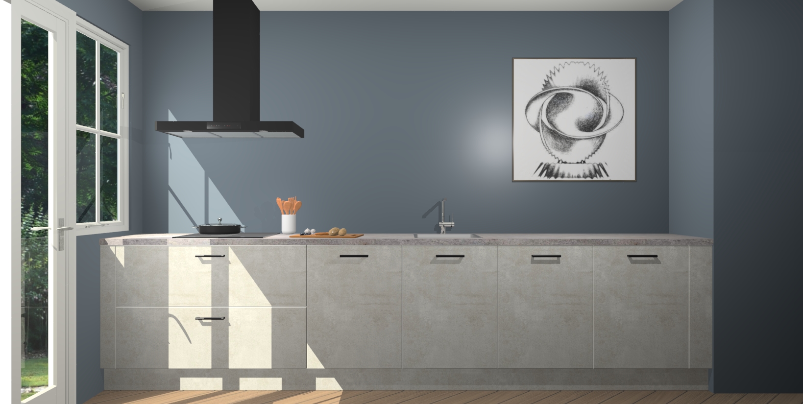 Een stijlvolle en praktische keuken als deze mag gezien worden. Dankzij de prachtige beton opal matte afwerking wordt de keuken gemakkelijk het middelpunt van uw huis - hij ziet er geweldig uit onder allerlei lichtomstandigheden, van dag tot nacht!