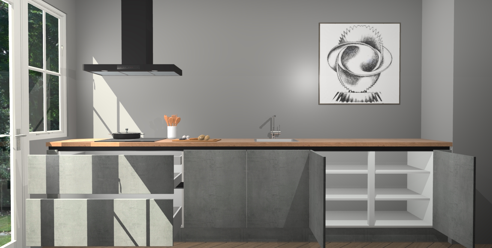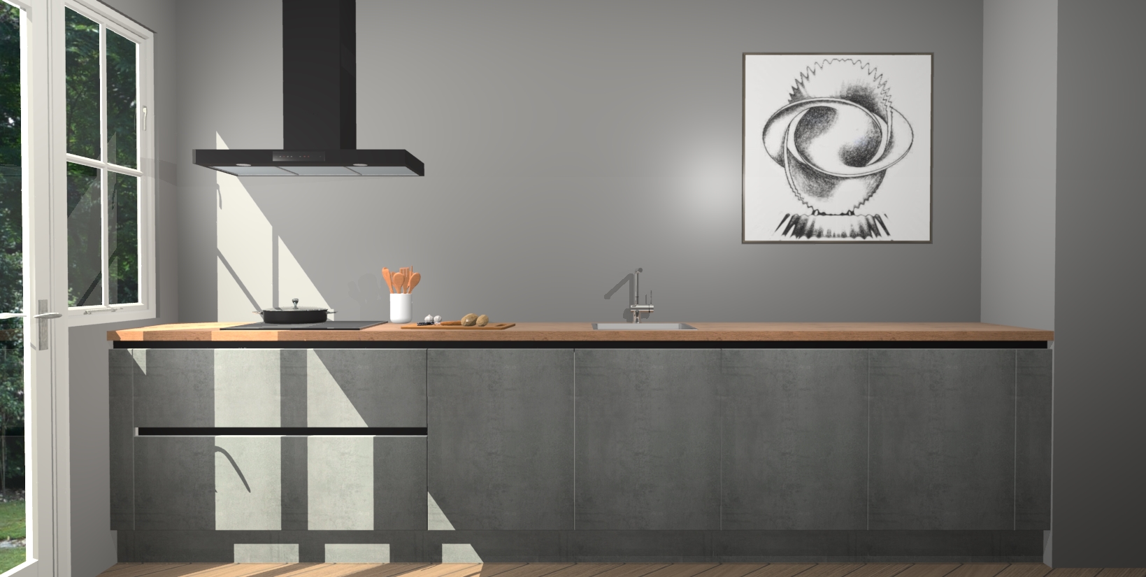 Een stijlvolle en praktische keuken als deze mag gezien worden. Dankzij de prachtige beton parelgrijs matte afwerking wordt de keuken gemakkelijk het middelpunt van uw huis - hij ziet er geweldig uit onder allerlei lichtomstandigheden, van dag tot nacht!