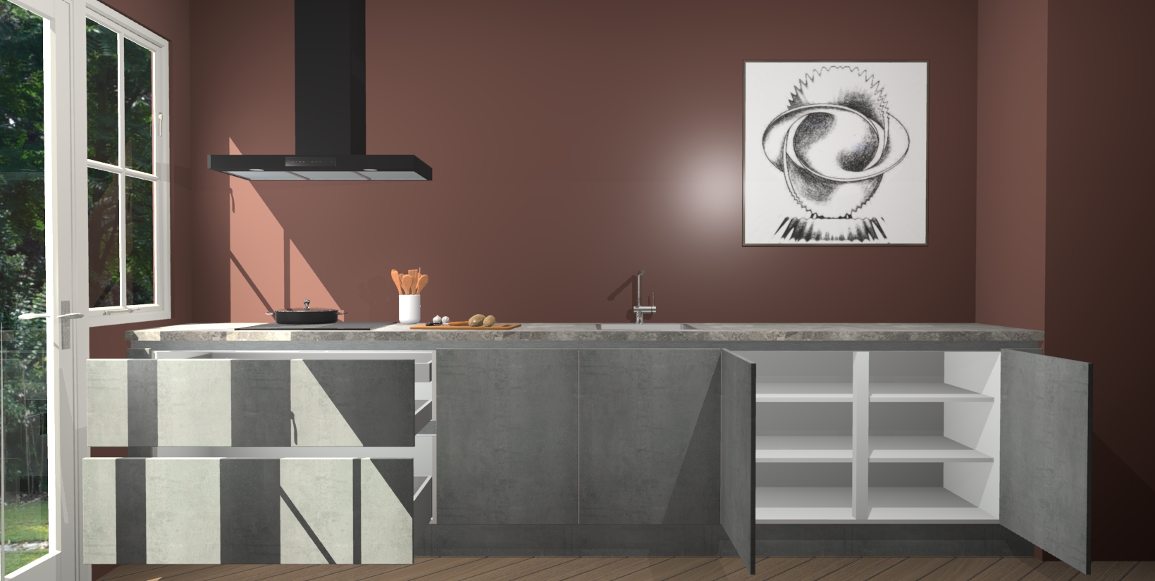 Een stijlvolle en praktische keuken als deze mag gezien worden. Dankzij de prachtige beton parelgrijs matte afwerking wordt de keuken gemakkelijk het middelpunt van uw huis - hij ziet er geweldig uit onder allerlei lichtomstandigheden, van dag tot nacht!