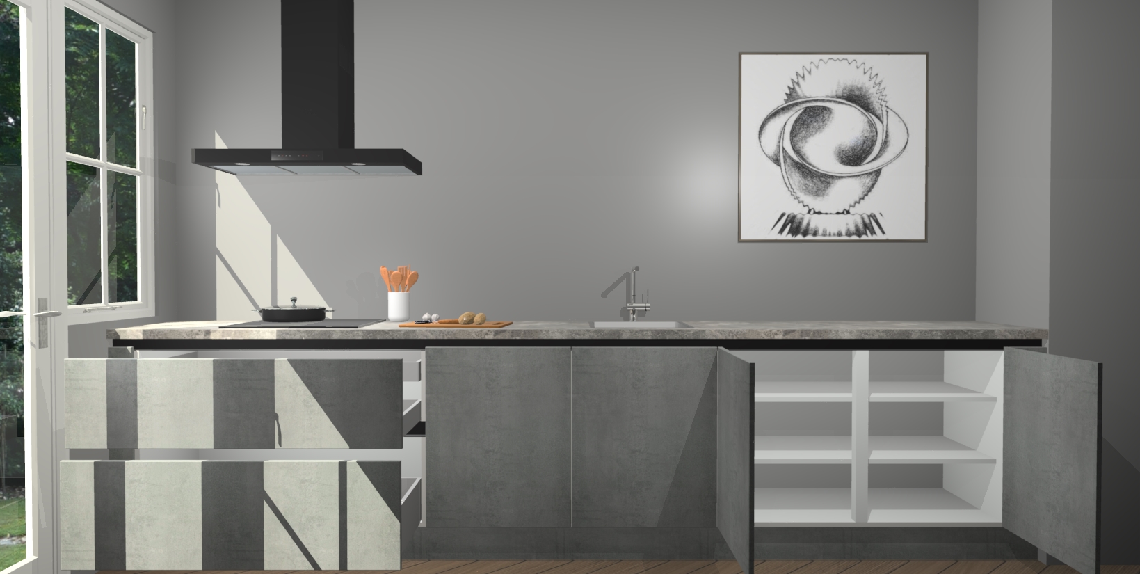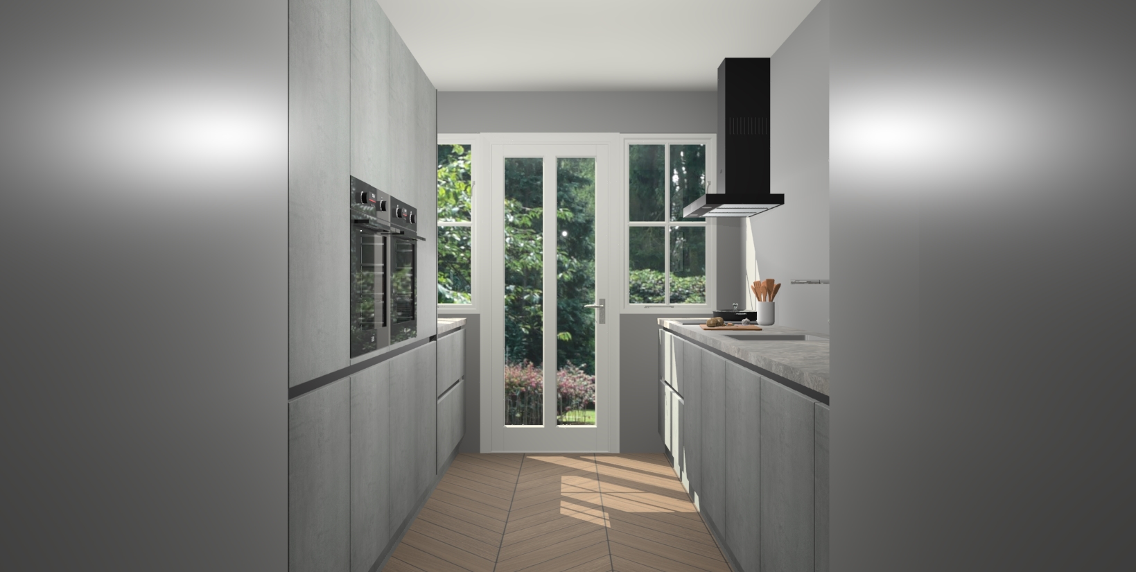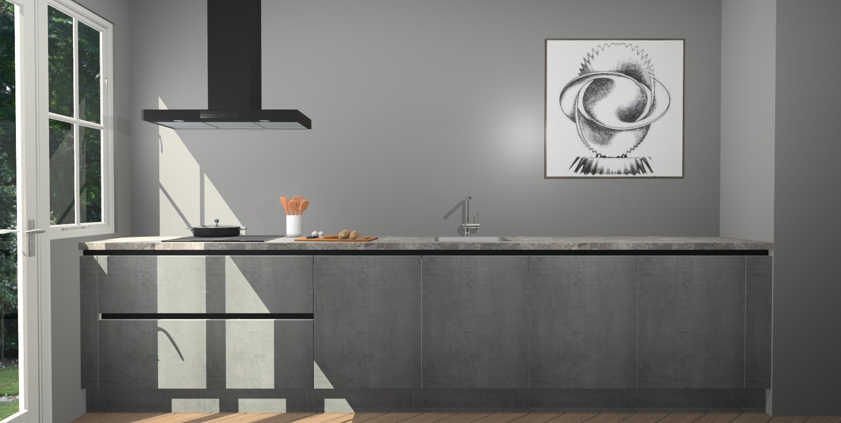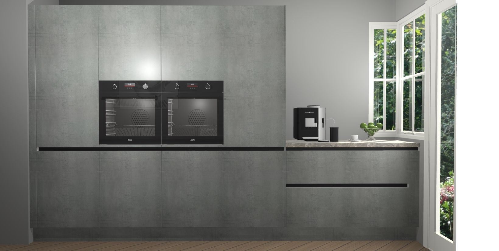 Een stijlvolle en praktische keuken als deze mag gezien worden. Dankzij de prachtige beton parelgrijs matte afwerking wordt de keuken gemakkelijk het middelpunt van uw huis - hij ziet er geweldig uit onder allerlei lichtomstandigheden, van dag tot nacht!
