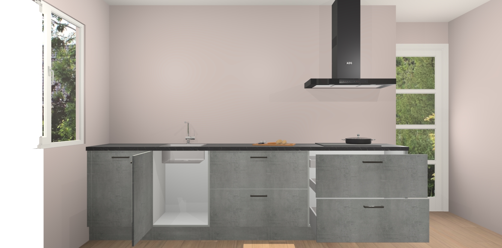 De softclose deuren openen en sluiten is ook heel eenvoudig - geniet van een moeiteloze keukenervaring, zelfs als er kinderen rondlopen. Voor extra gemak bij het plaatsen van uw bestelling bieden we ook een upgrade naar een kookplaat met geïntegreerde afzuiging.