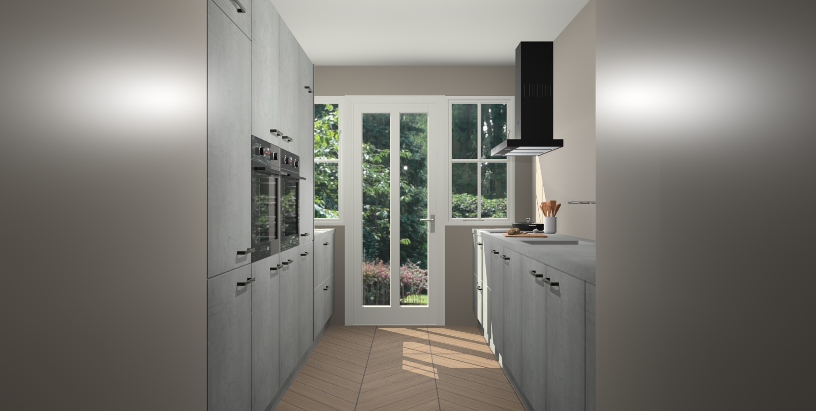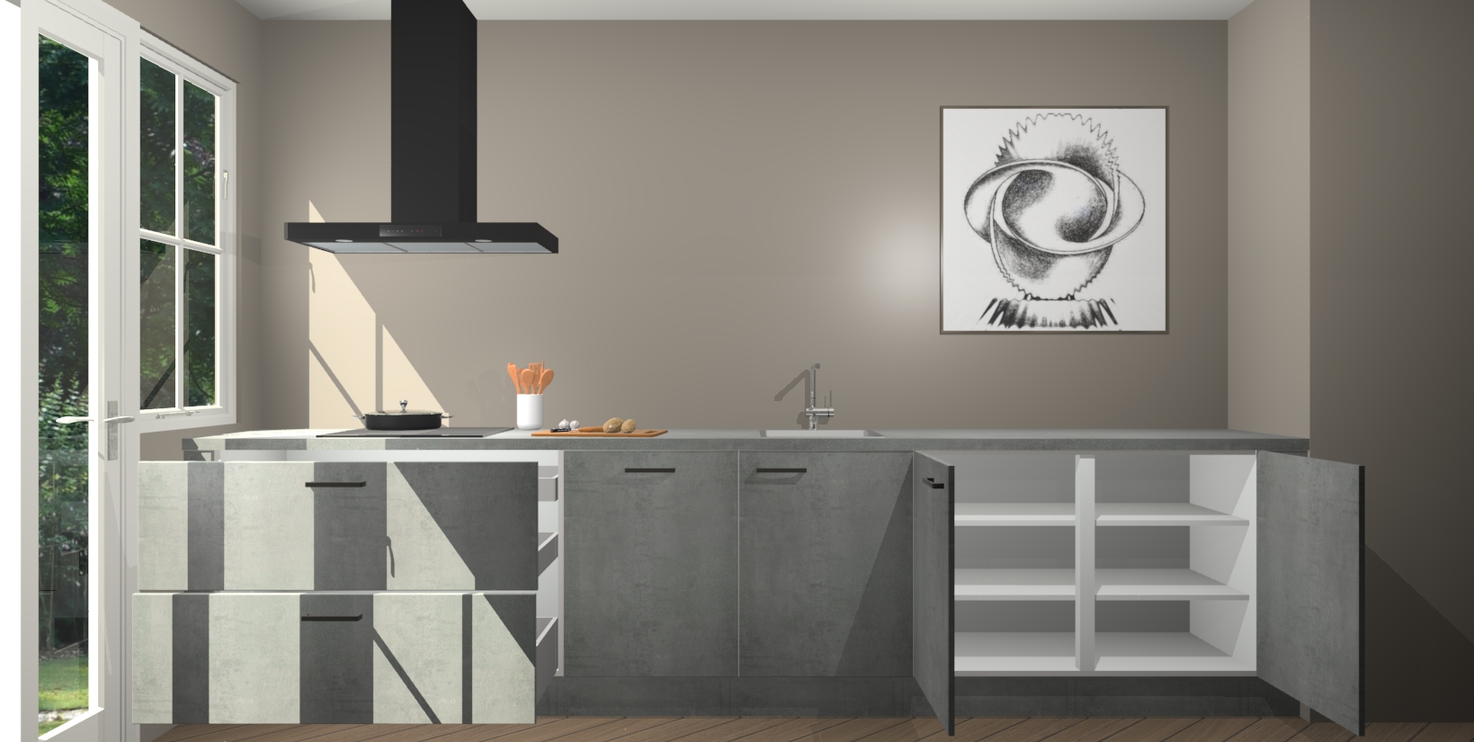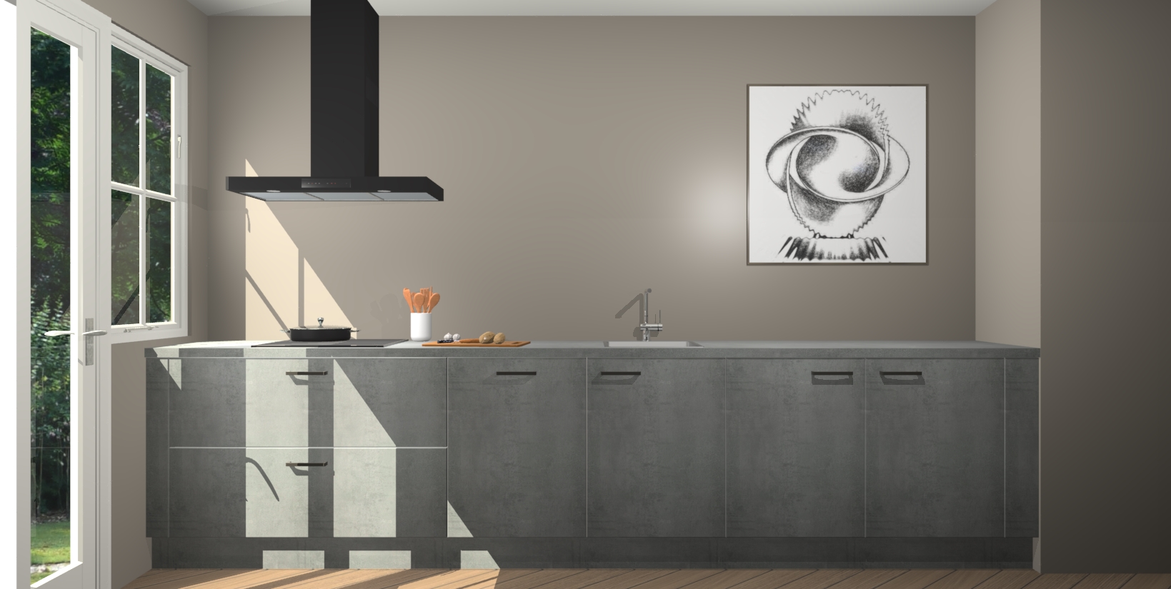 Een stijlvolle en praktische keuken als deze mag gezien worden. Dankzij de prachtige beton parelgrijs matte afwerking wordt de keuken gemakkelijk het middelpunt van uw huis - hij ziet er geweldig uit onder allerlei lichtomstandigheden, van dag tot nacht!