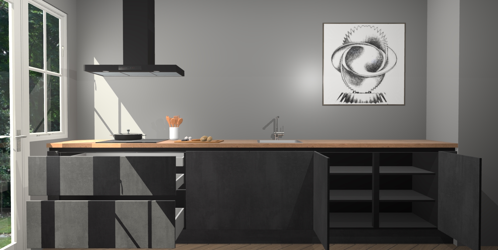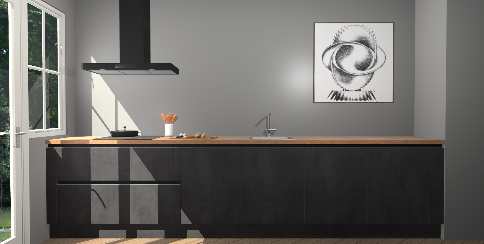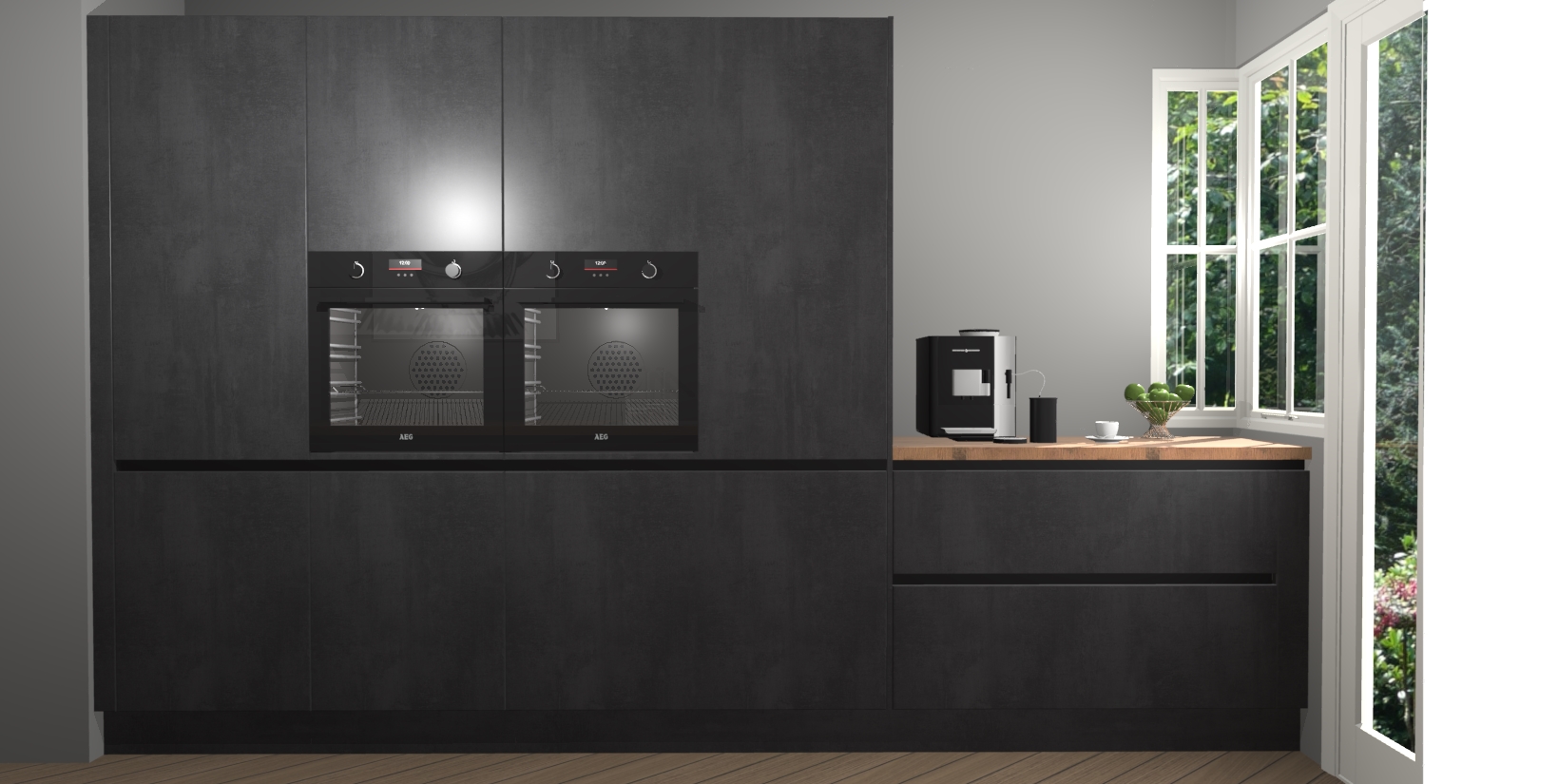 Een stijlvolle en praktische keuken als deze mag gezien worden. Dankzij de prachtige beton zwarte matte afwerking wordt de keuken gemakkelijk het middelpunt van uw huis - hij ziet er geweldig uit onder allerlei lichtomstandigheden, van dag tot nacht!