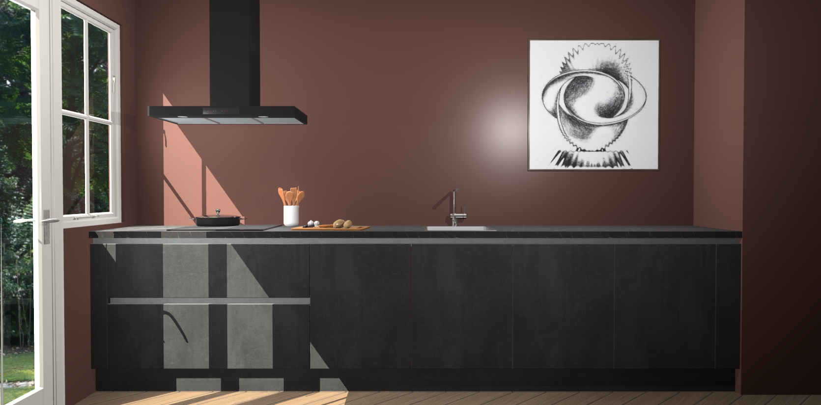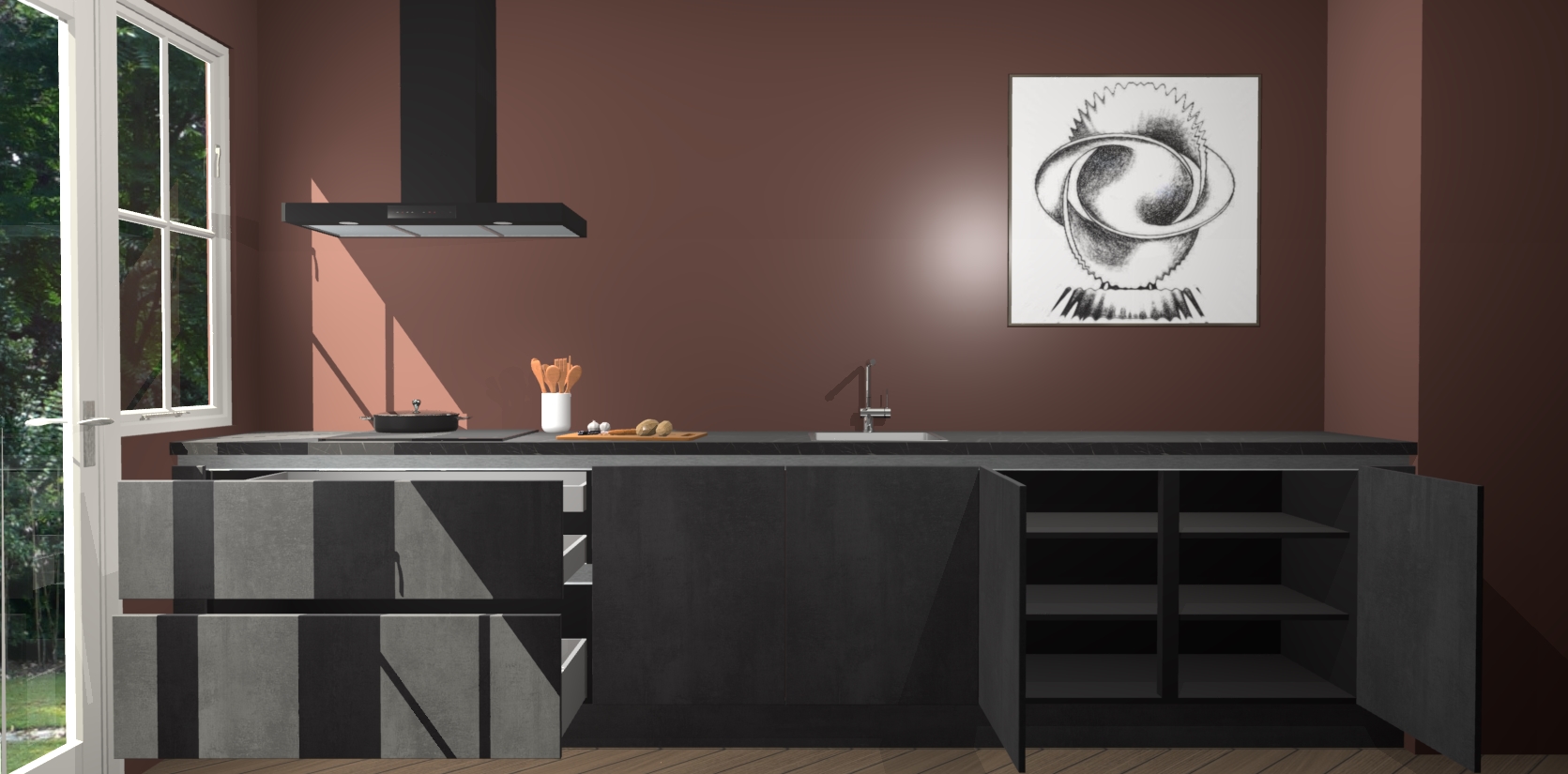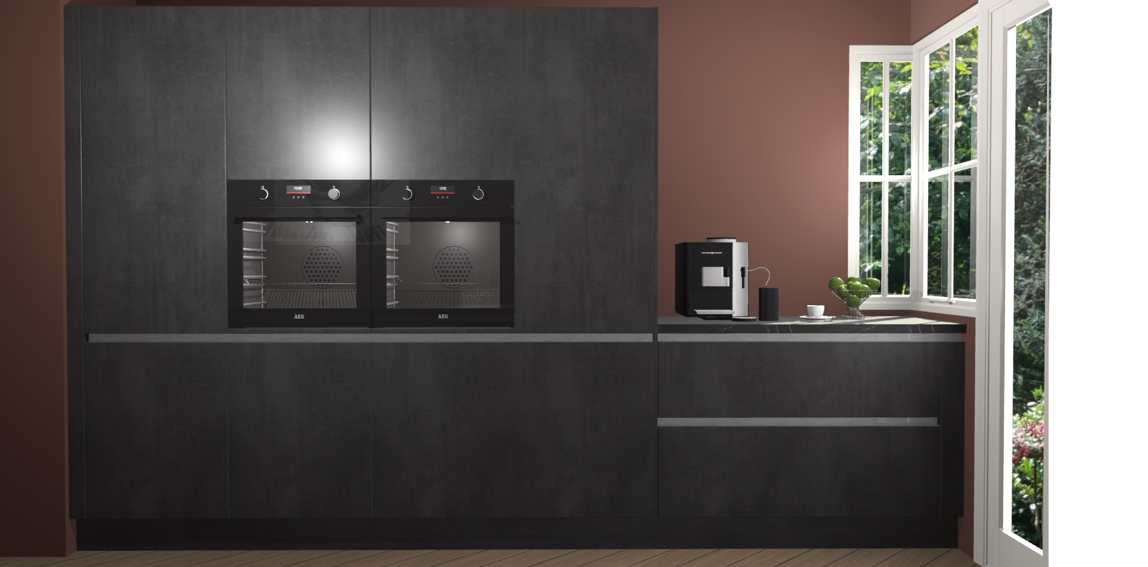 Een stijlvolle en praktische keuken als deze mag gezien worden. Dankzij de prachtige beton zwarte matte afwerking wordt de keuken gemakkelijk het middelpunt van uw huis - hij ziet er geweldig uit onder allerlei lichtomstandigheden, van dag tot nacht!