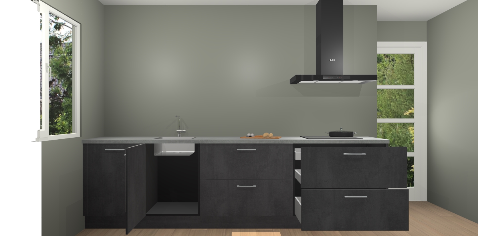 De softclose deuren openen en sluiten is ook heel eenvoudig - geniet van een moeiteloze keukenervaring, zelfs als er kinderen rondlopen. Voor extra gemak bij het plaatsen van uw bestelling bieden we ook een upgrade naar een kookplaat met geïntegreerde afzuiging.