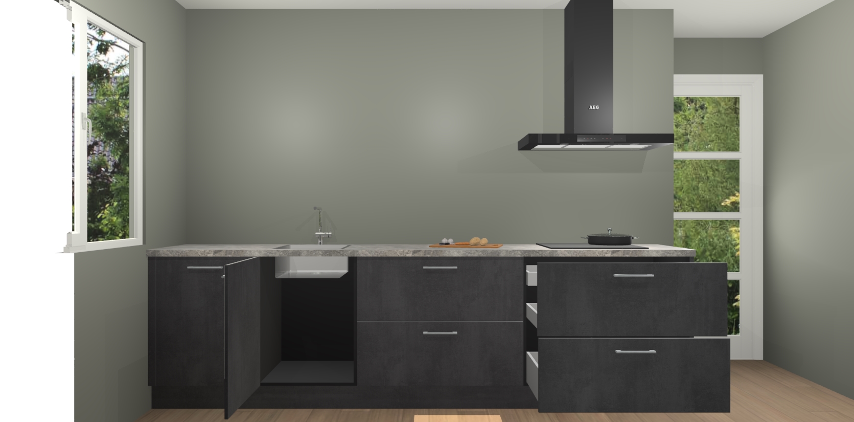 De softclose deuren openen en sluiten is ook heel eenvoudig - geniet van een moeiteloze keukenervaring, zelfs als er kinderen rondlopen. Voor extra gemak bij het plaatsen van uw bestelling bieden we ook een upgrade naar een kookplaat met geïntegreerde afzuiging.