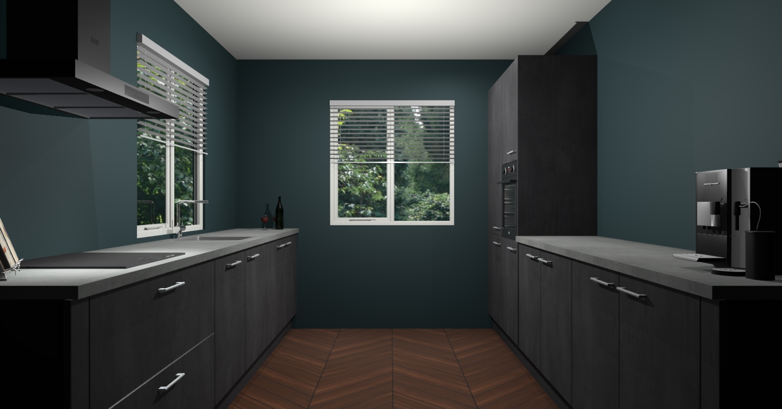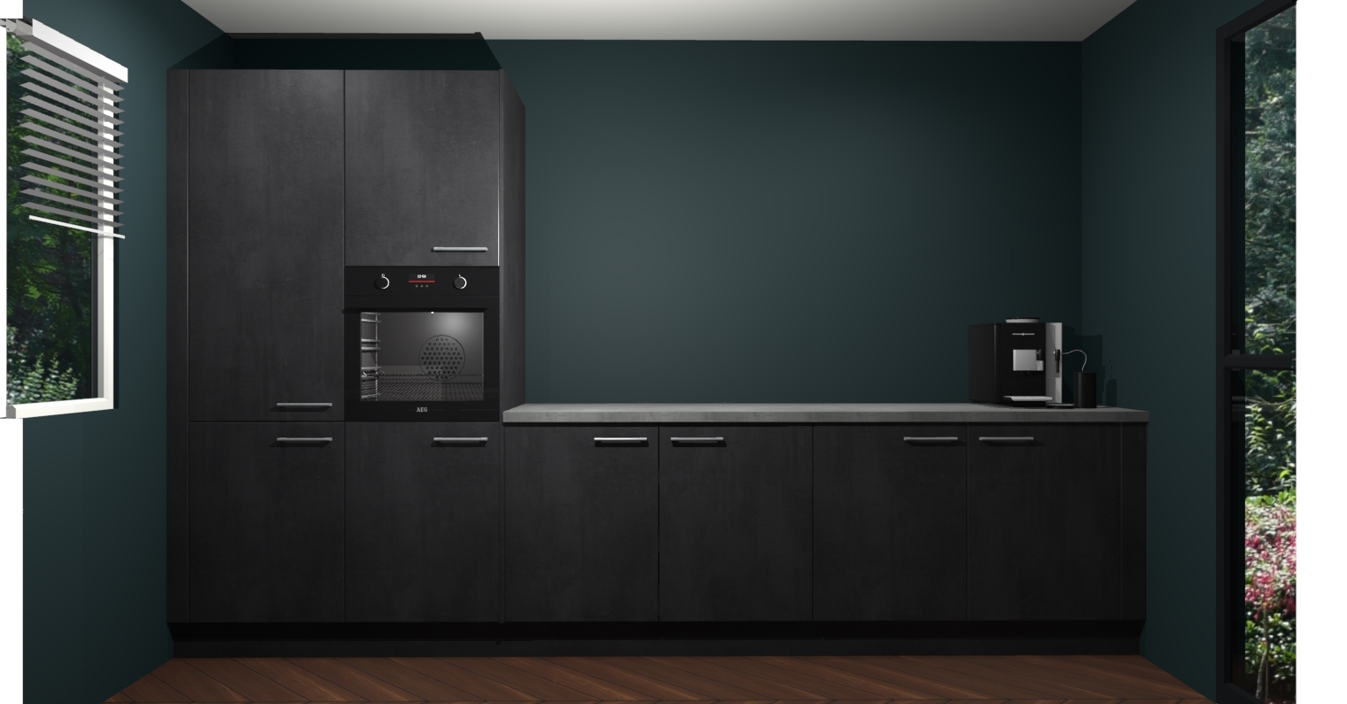 Welkom bij de Beton Zwarte keuken Lusaka. Deze prachtige keuken zal de komende jaren het middelpunt van de belangstelling in uw huis zijn. Uitgerust met vijf inbouwapparaten komt u nooit kookgereedschap tekort. Bovendien geeft de warme houtlook elke ruimte een uitnodigende en tijdloze uitstraling.