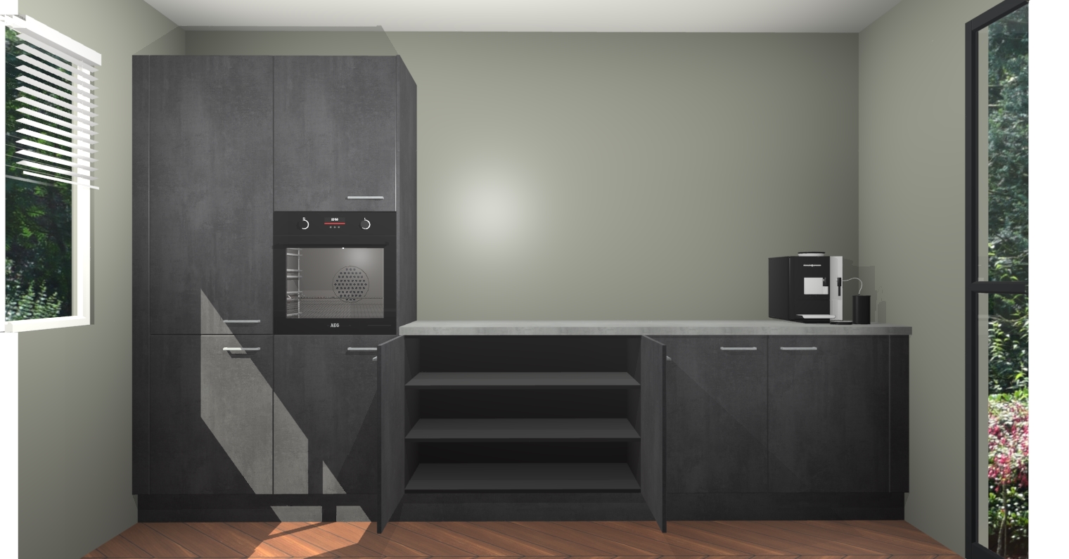 Welkom bij de Beton Zwarte keuken Lusaka. Deze prachtige keuken zal de komende jaren het middelpunt van de belangstelling in uw huis zijn. Uitgerust met vijf inbouwapparaten komt u nooit kookgereedschap tekort. Bovendien geeft de warme houtlook elke ruimte een uitnodigende en tijdloze uitstraling.